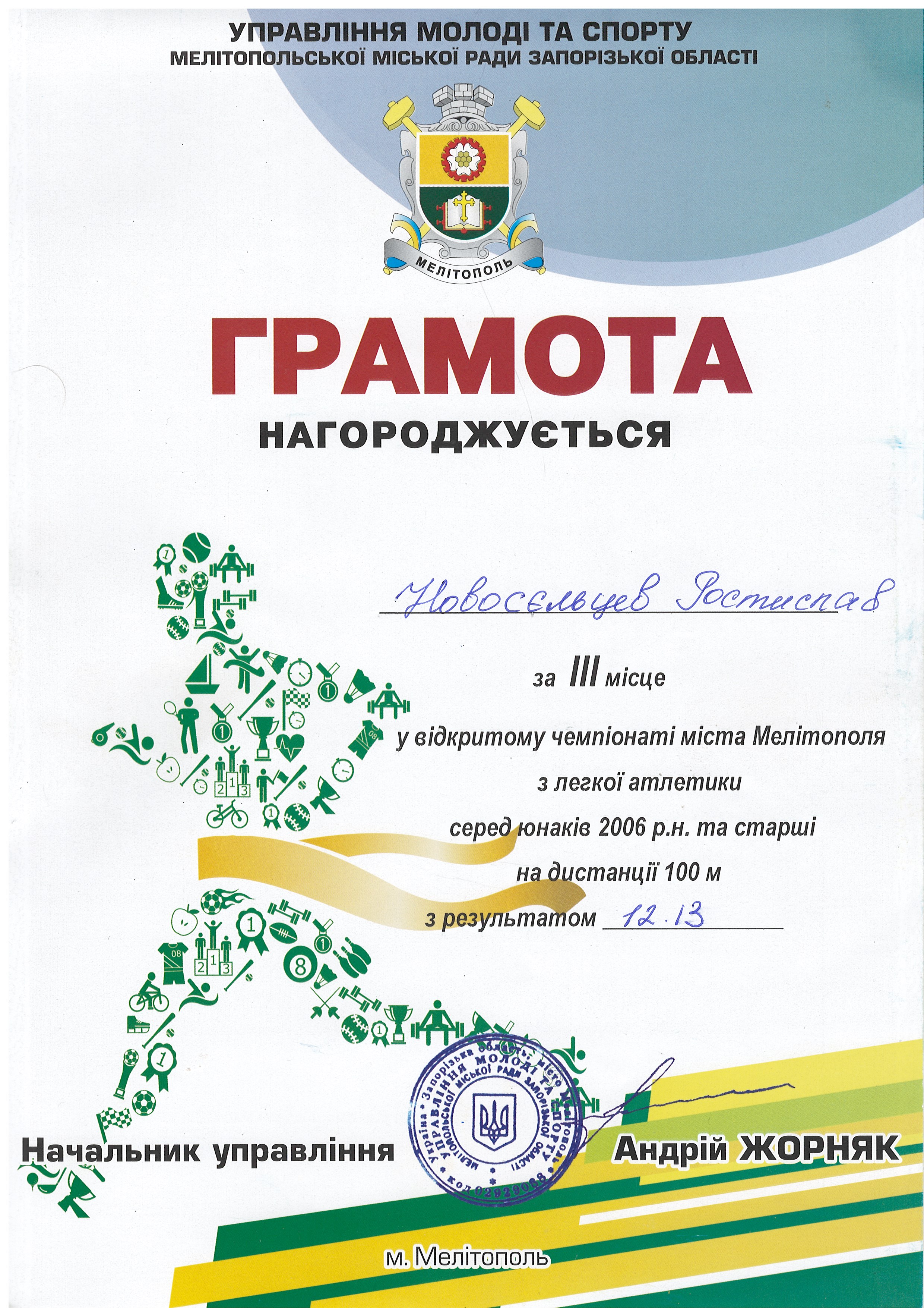 Новосельцев Ростислав – 21 АІ (ІІІ місце серед юнаків 2006 р.н. і старше на дистанції 100 метрів) – ГРАМОТА