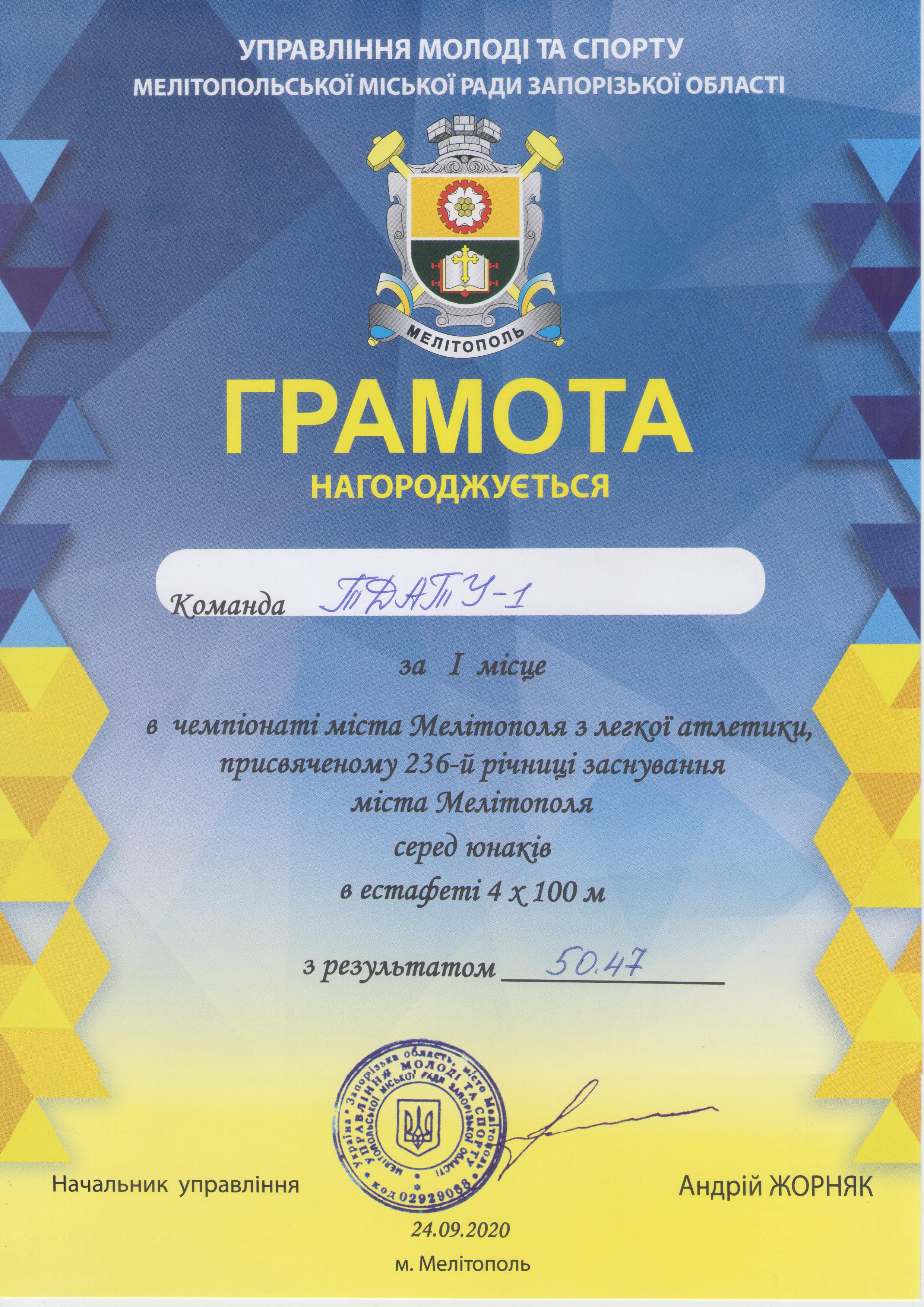 Малишев Олександр – 41 ЕЕ, Новосельцев Ростислав – 21 АІ, Олинський Володимир – 13 МБАІ, Коваль Дмитро – 11 СКН (І місце в складі команди ТДАТУ-1 в естафеті 4×100 серед юнаків) – ГРАМОТА