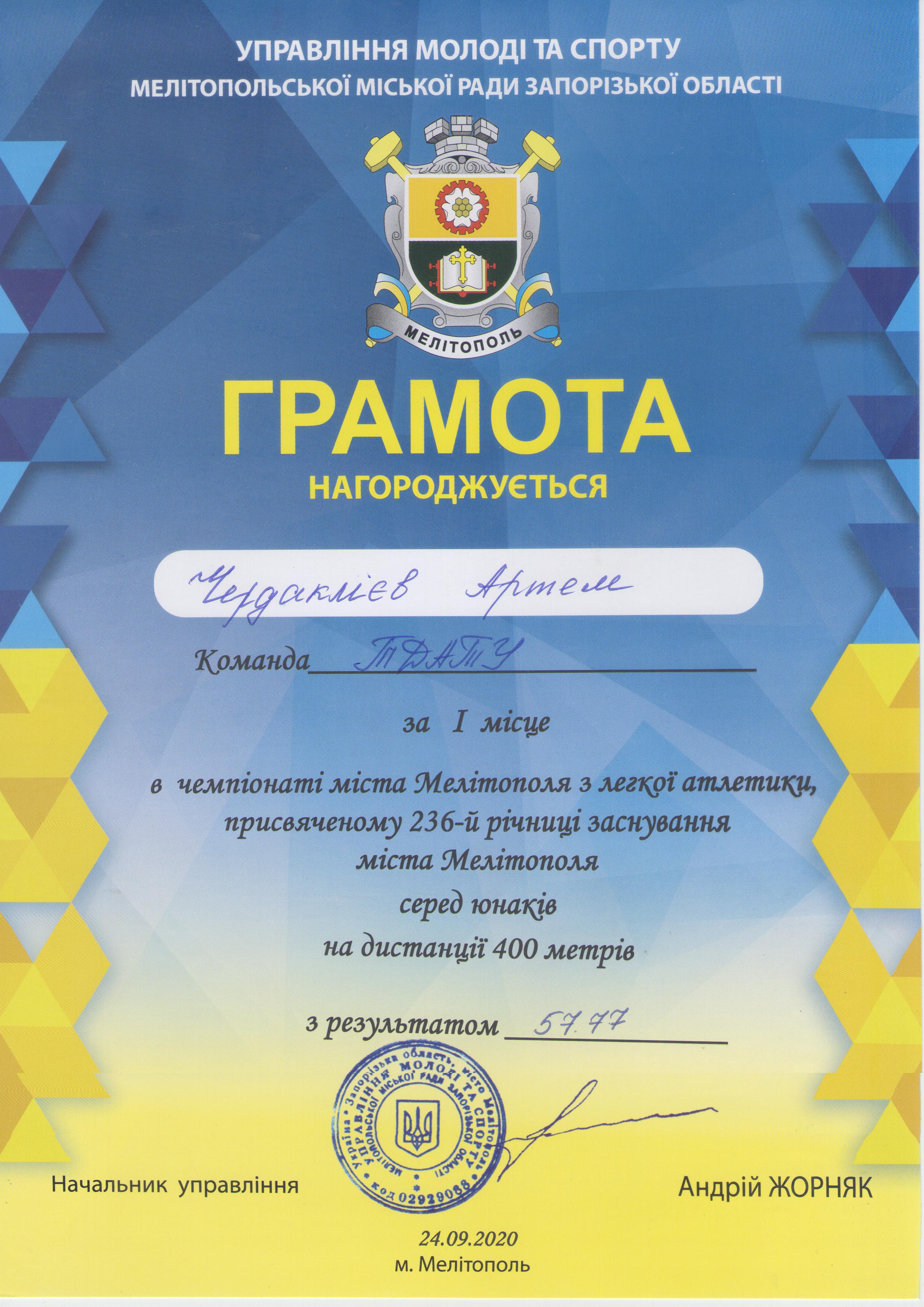 Чердаклієв Артем – 12 МБАГЗ (І місце на дистанції 400 метрів серед юнаків) – ГРАМОТА