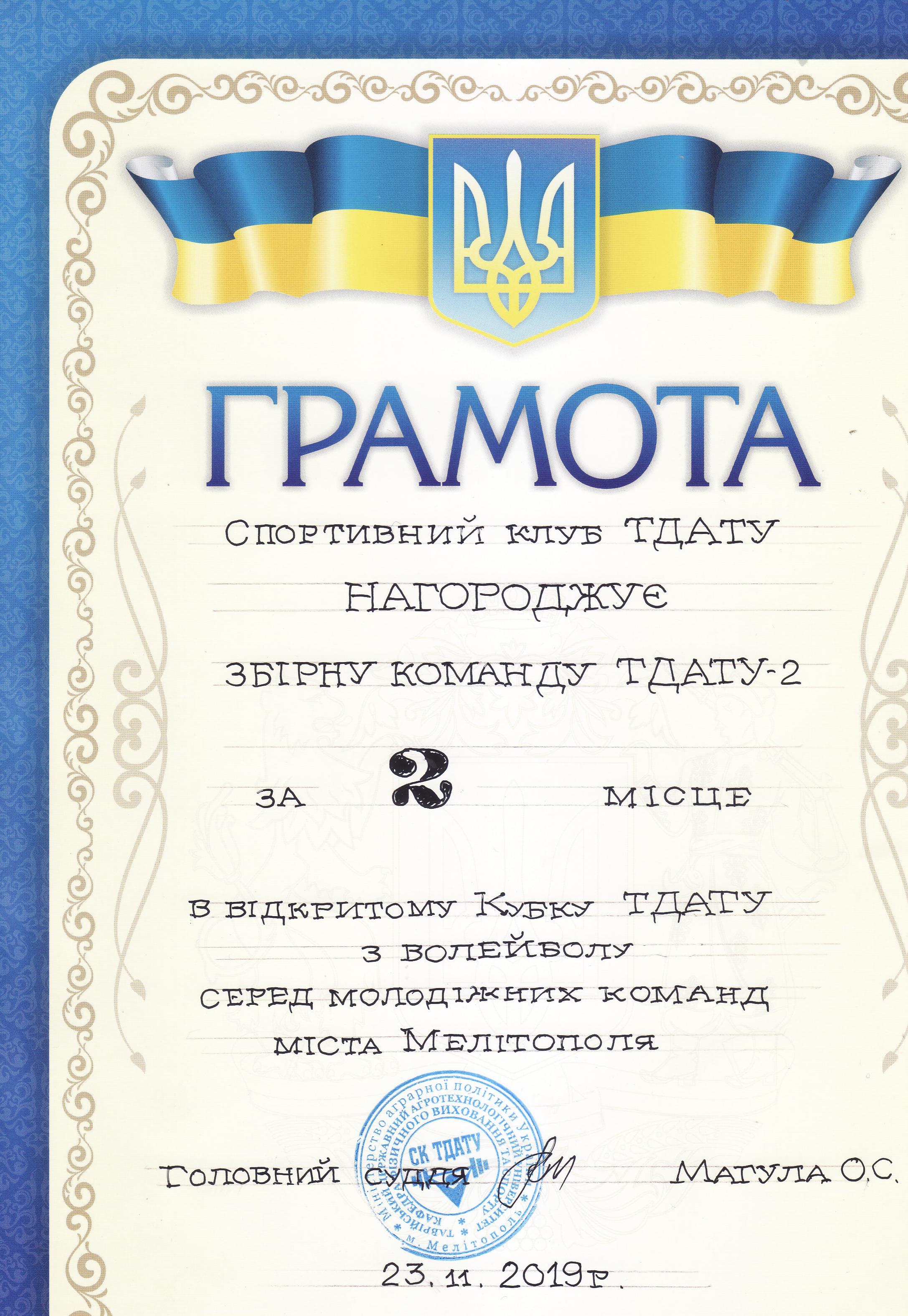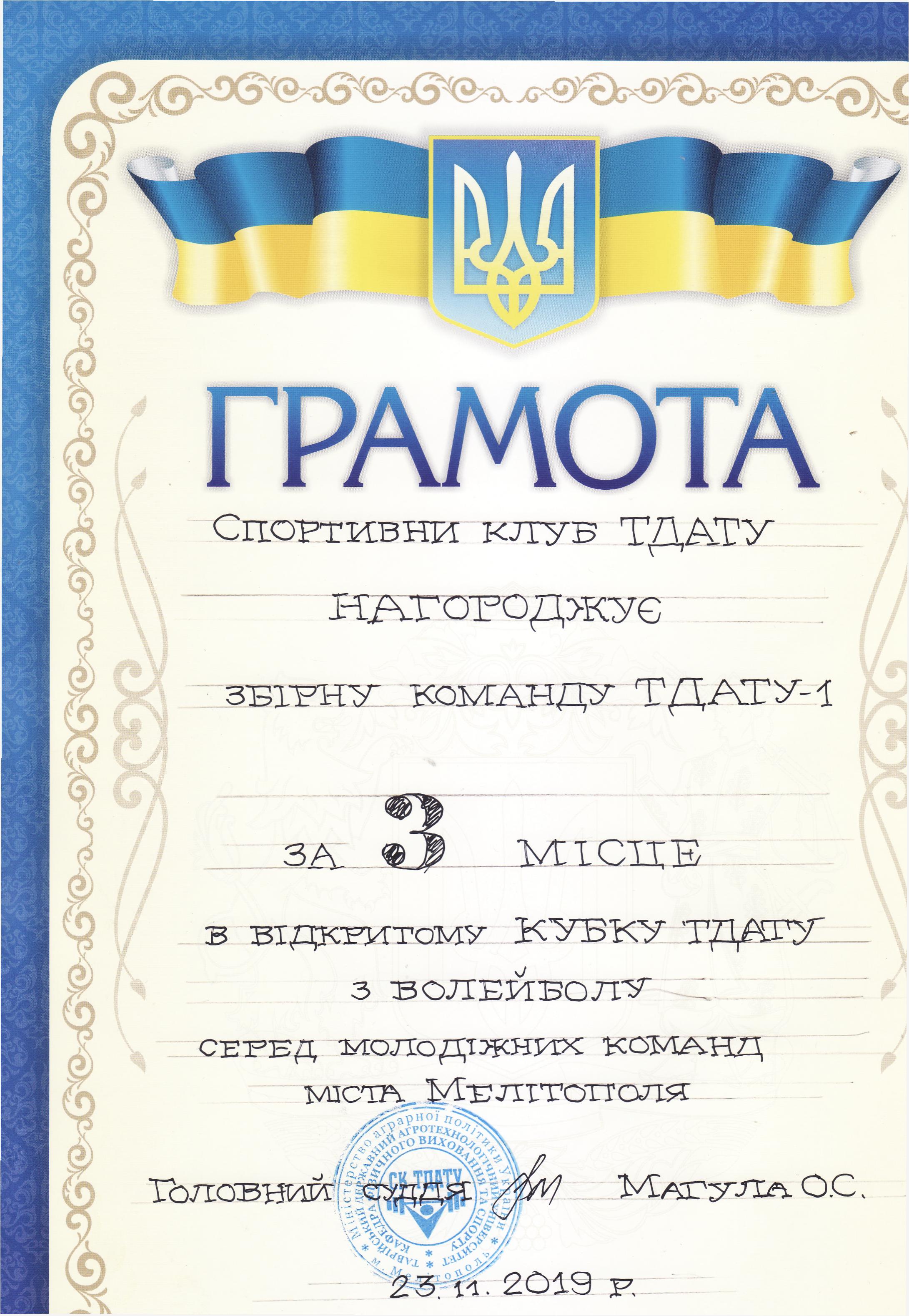 1. Відкритий Кубок ТДАТУ з волейболу серед молодіжних команд міста Мелітополь (23.11.2019 р.) – збірна команда ТДАТУ-2 (II місце), збірна команда ТДАТУ-1 (III місце) – ГРАМОТА 1ГРАМОТА 2