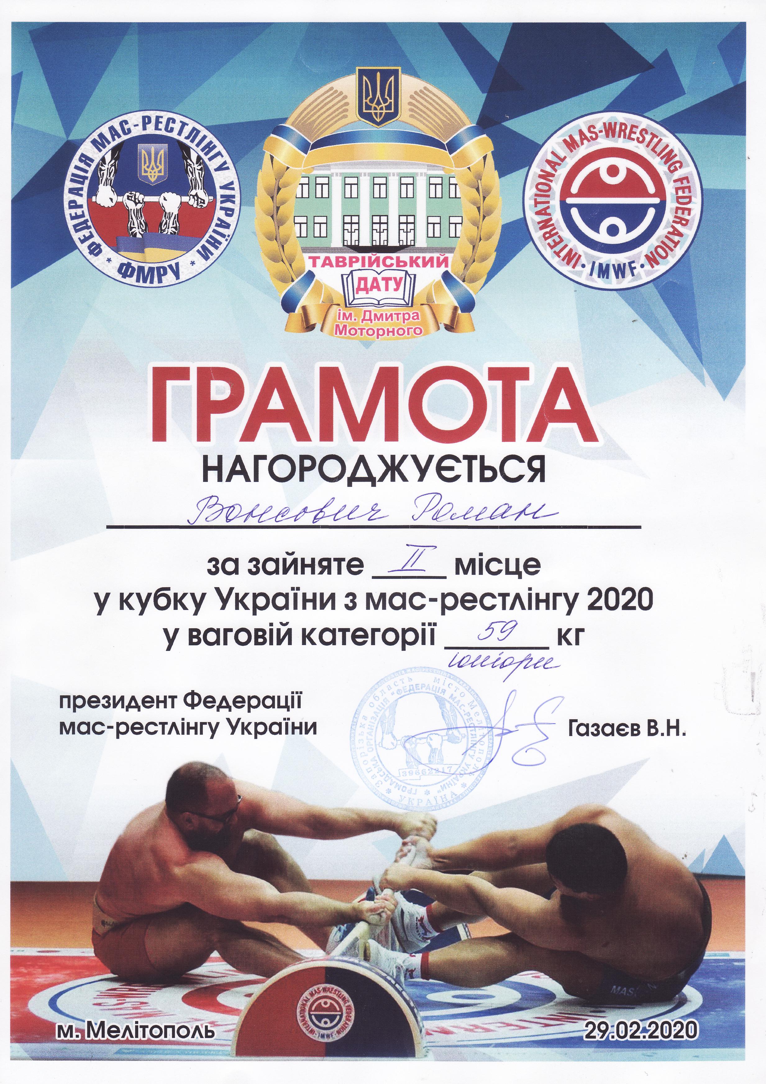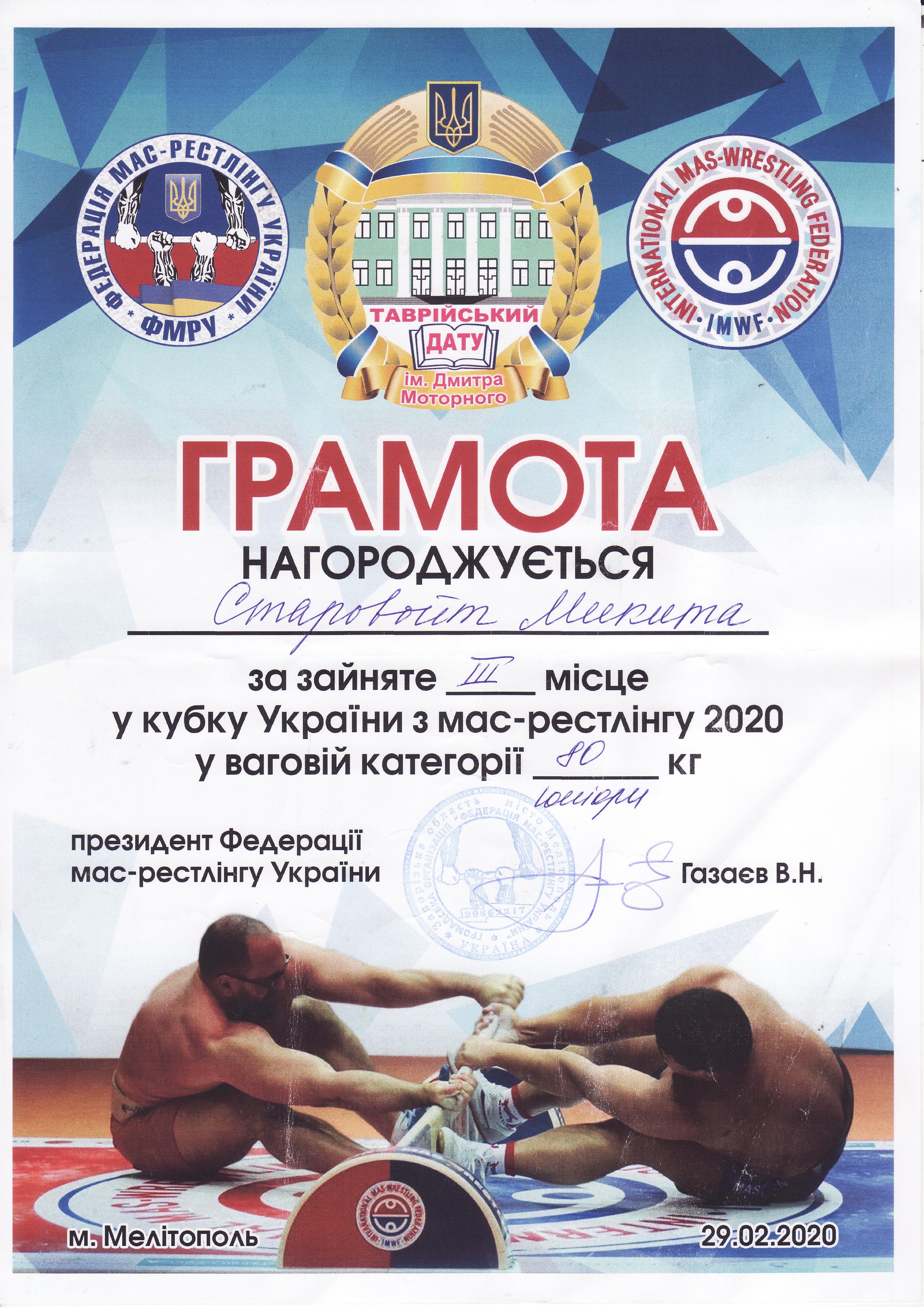 1. V Відкритий Кубок України з мас-рестлінгу серед юнаків та дівчат (15-17 років), юніорів та юніорок (18-21 років) та відкритої вікової групи (21+ років) під егідою ГО “Федерація мас-рестлінгу України” (м. Мелітополь, 29.02.2020 р.)Вонсович Роман – 21 АІ (ІІ місце в номінації “U21/Юніори”, вагова категорія до 59 кг), Ніколенко Антон – 31 МК (ІІІ місце в номінації “U21/Юніори”, вагова категорія до 59 кг), Старовойт Микита – 12 МБГМ (ІІІ місце в номінації “U21/Юніори”, вагова категорія до 80 кг), Токар Наталія – 21 ГЗ (ІІІ місце в номінації “U21/Юніори”, вагова категорія до 66 кг) – ГРАМОТА 1ГРАМОТА 2ГРАМОТА 3ГРАМОТА 4