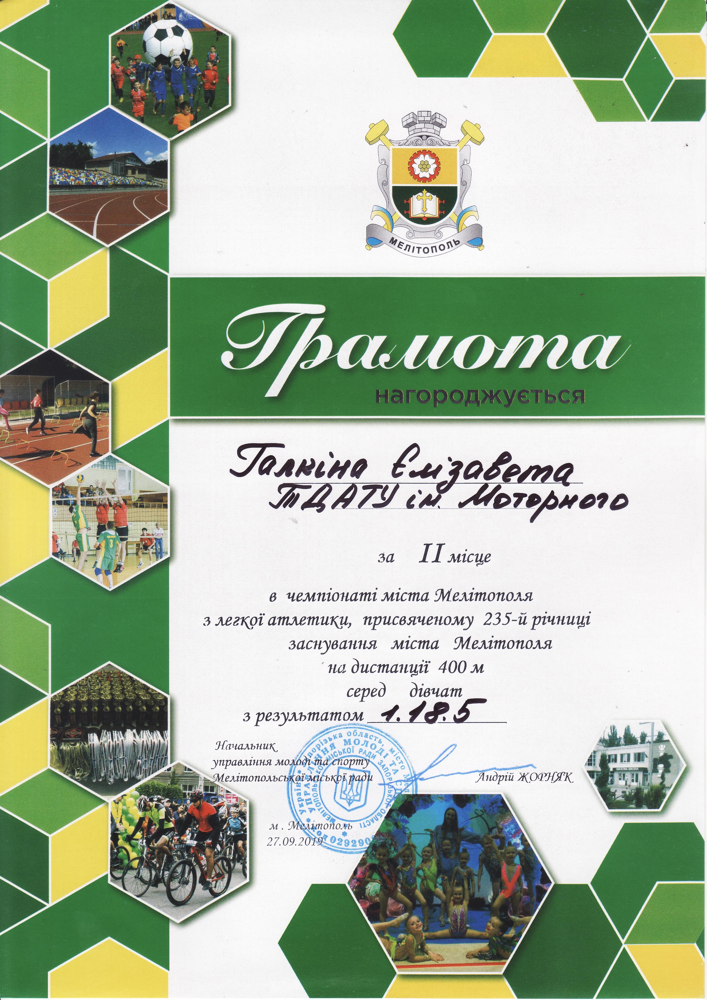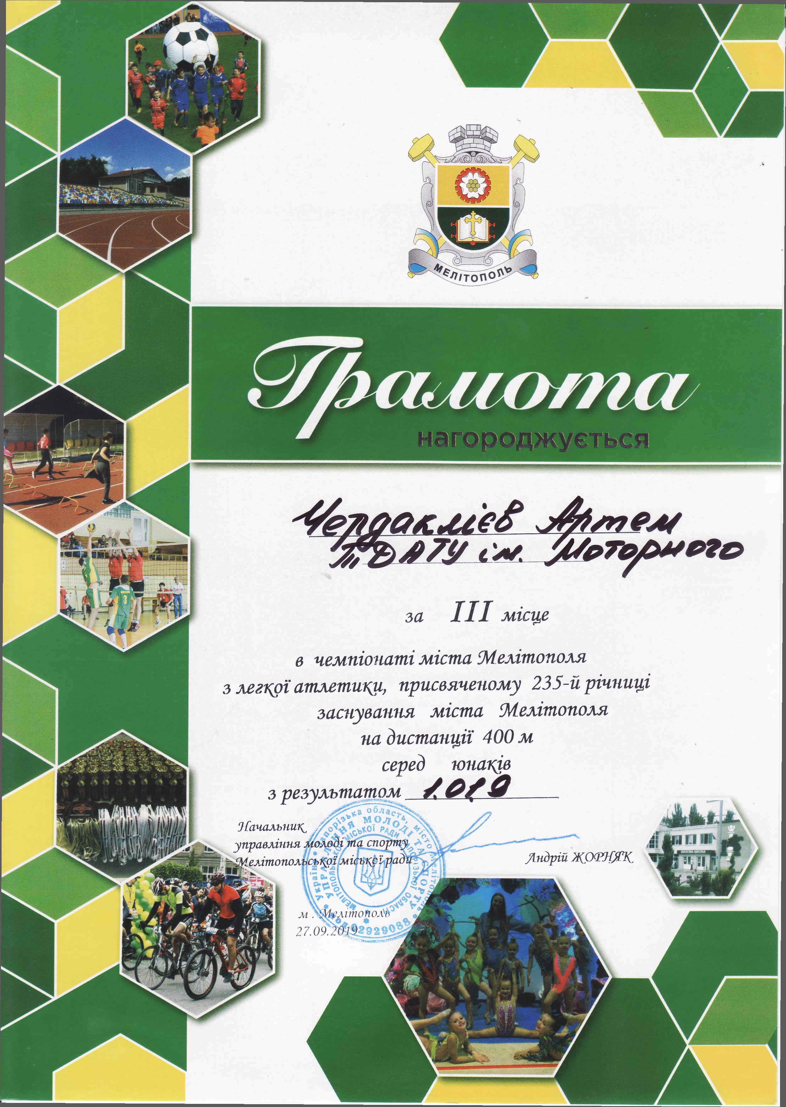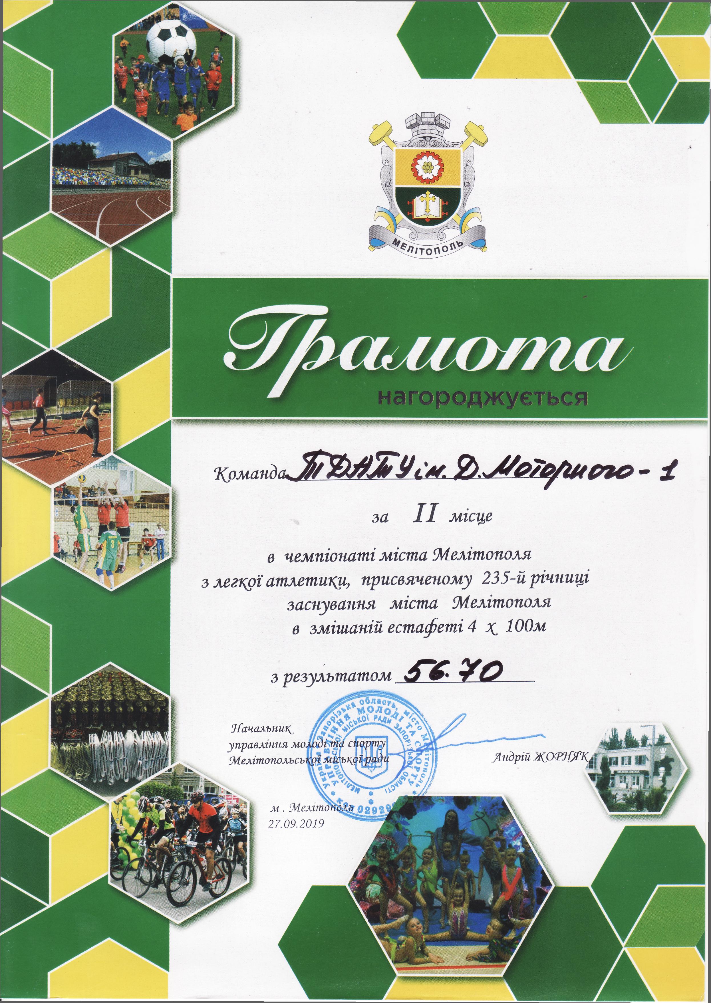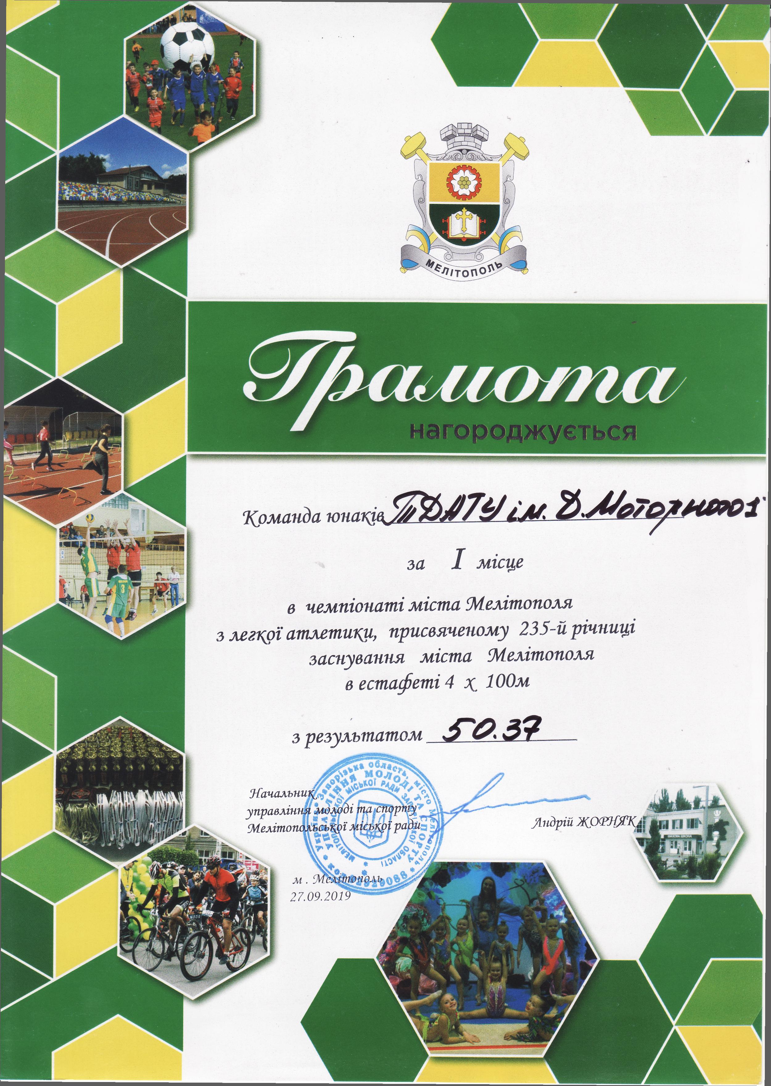 1. Чемпіонат з легкої атлетики серед юнаків та дівчат, присвячений 235-й річниці заснування міста Мелітополь (27.09.2019 р.)Новосельцев Ростислав – 11 АІ (І місце на дистанції 100 метрів серед юнаків), Геміджян Микита – 11 МН (І місце на дистанції 200 метрів серед юнаків), збірна команда ТДАТУ-1 (І місце в естафеті 4×100 метрів серед юнаків), збірна команда ТДАТУ (І місце в “шведській” естафеті 600+400+200+100 метрів серед юнаків), збірна команда ТДАТУ-1 (II місце в естафеті 4×100 метрів серед дівчат), збірна команда ТДАТУ-1 (II місце в змішаній естафеті 4×100 метрів серед юнаків і дівчат), Галкіна Єлизавета – 21 ГЗ (ІІ місце на дистанції 400 метрів серед дівчат), Чердаклієв Артем – 22 МБГМ (III місце на дистанції 400 метрів серед юнаків), Малишев Олександр – 31 ЕЕ (III місце на дистанції 100 м серед юнаків), Галкіна Єлизавета – 21 ГЗ (ІІІ місце на дистанції 100 метрів серед дівчат), Гасенко Тетяна – 21 АІ (ІІІ місце у стрибках у довжину серед дівчат) – ГРАМОТА 1ГРАМОТА 2ГРАМОТА 3, ГРАМОТА 4, ГРАМОТА 5ГРАМОТА 6ГРАМОТА 7ГРАМОТА 8ГРАМОТА 9ГРАМОТА 10ГРАМОТА 11