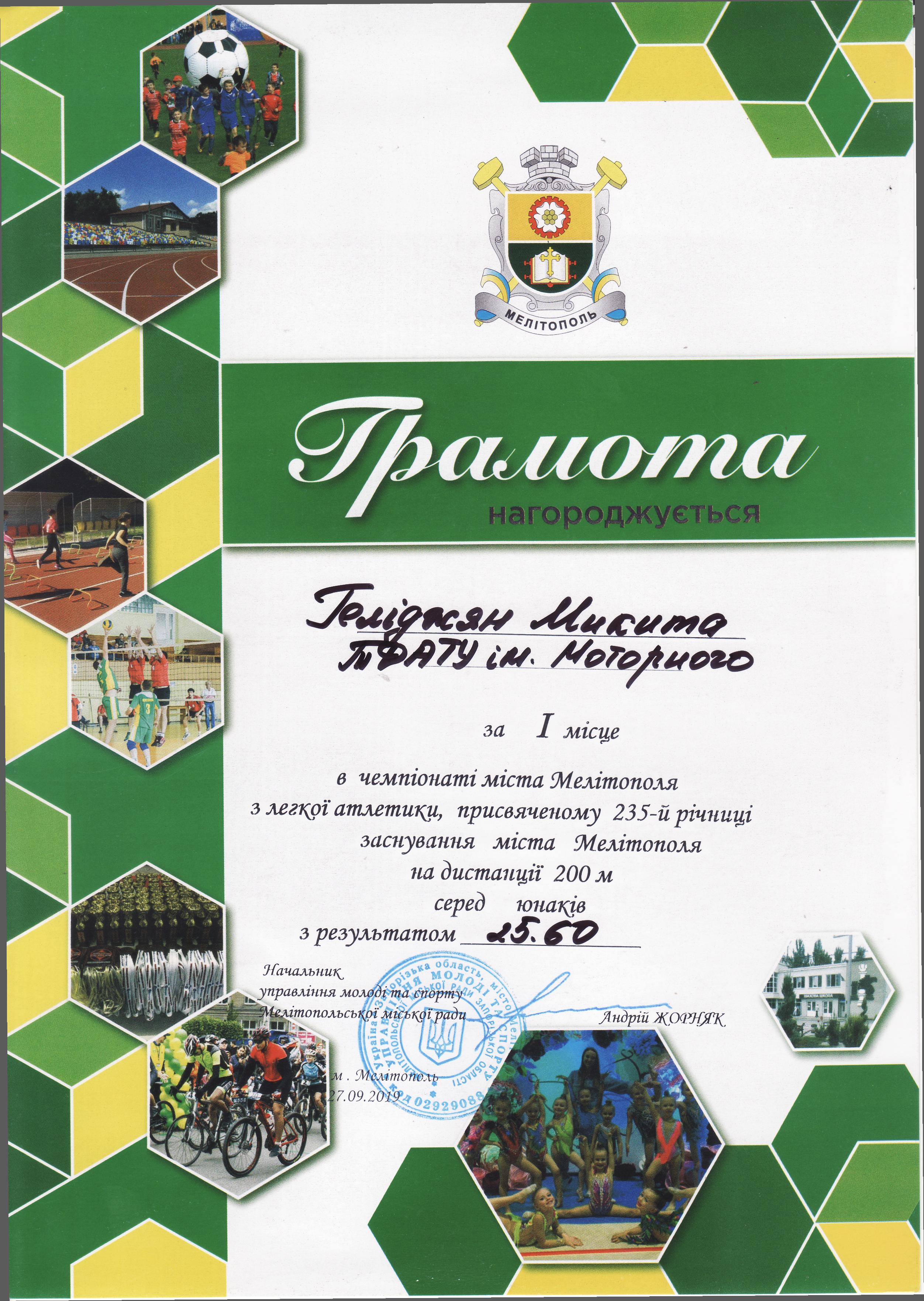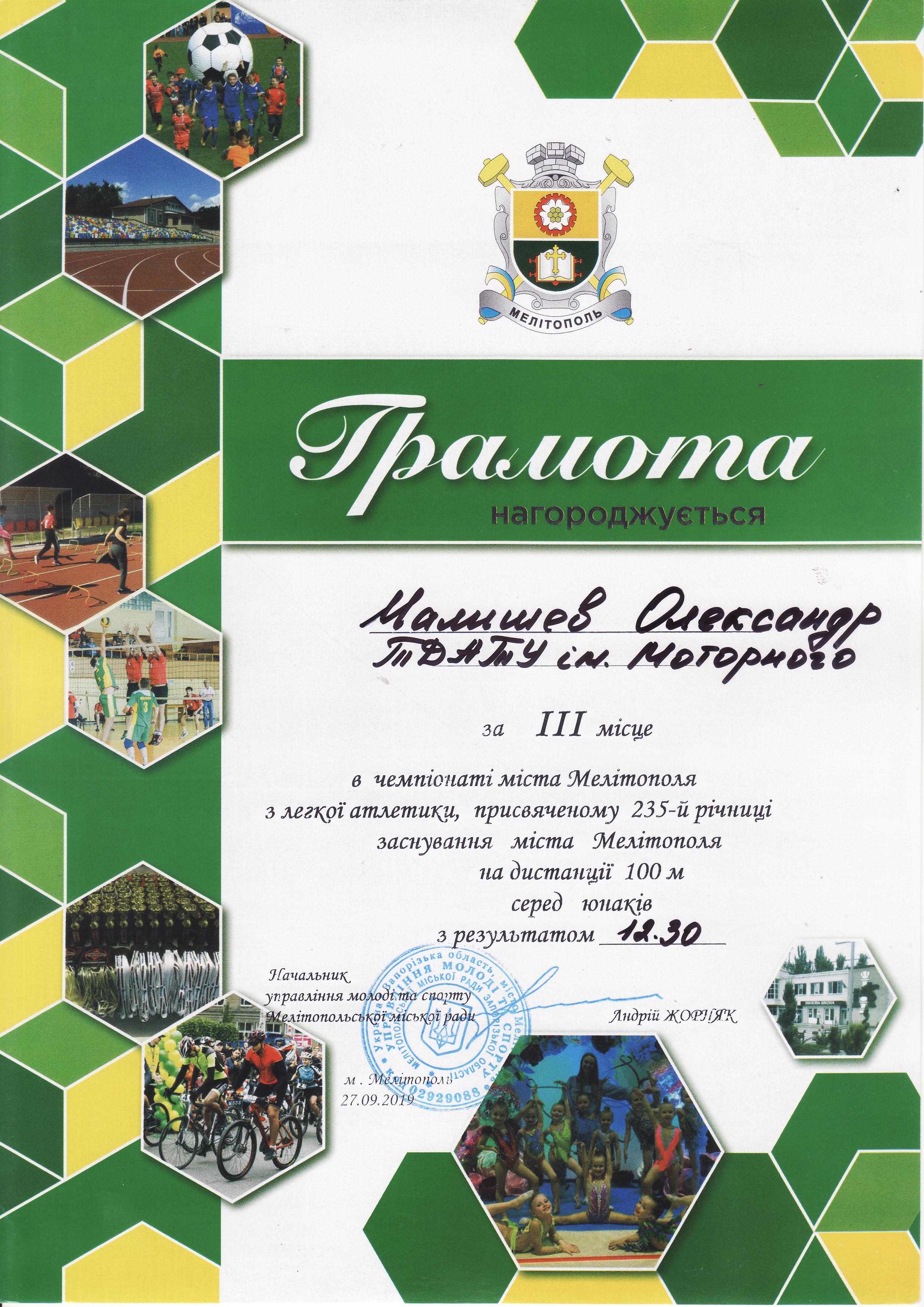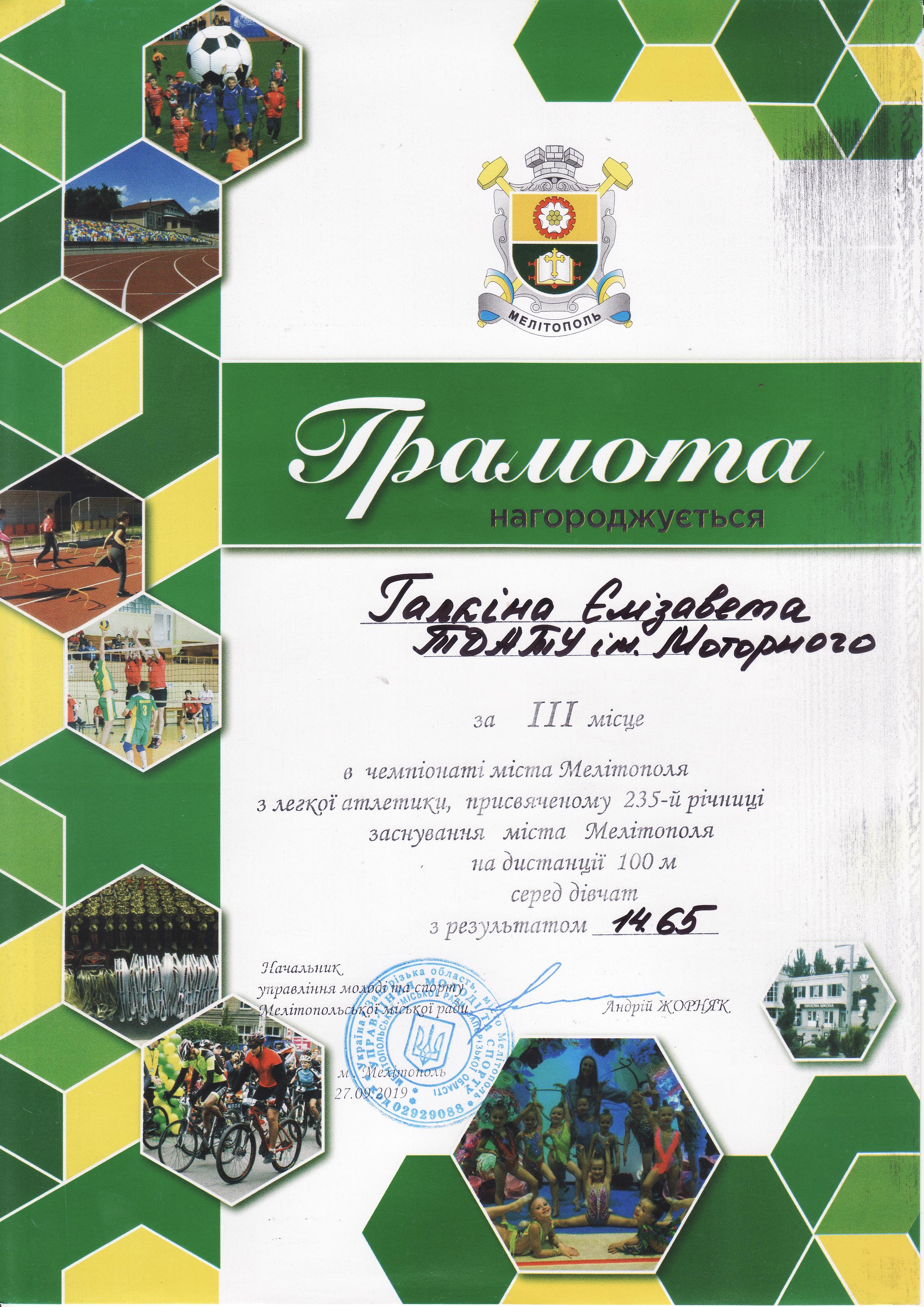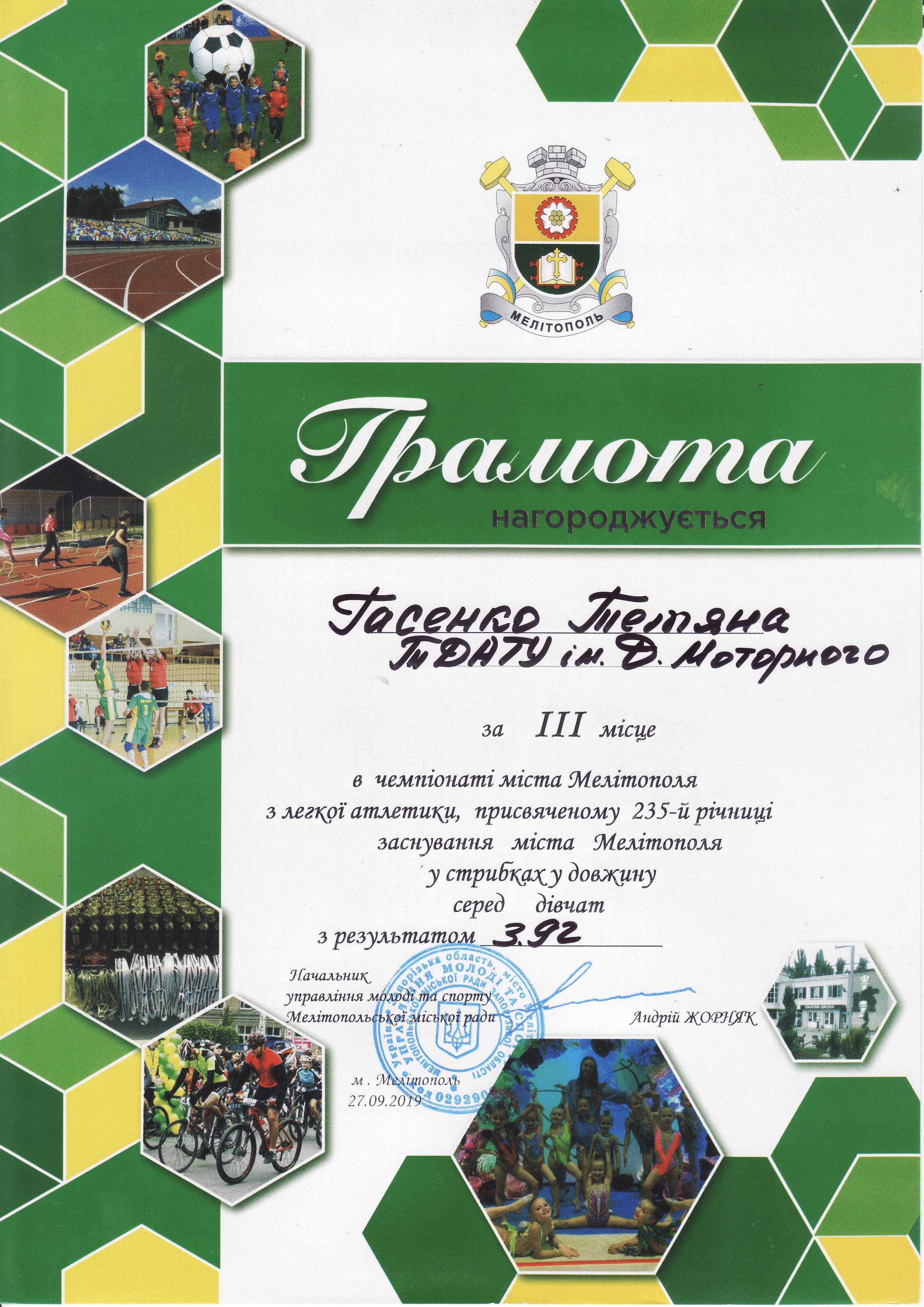 1. Чемпіонат з легкої атлетики серед юнаків та дівчат, присвячений 235-й річниці заснування міста Мелітополь (27.09.2019 р.)Новосельцев Ростислав – 11 АІ (І місце на дистанції 100 метрів серед юнаків), Геміджян Микита – 11 МН (І місце на дистанції 200 метрів серед юнаків), збірна команда ТДАТУ-1 (І місце в естафеті 4×100 метрів серед юнаків), збірна команда ТДАТУ (І місце в “шведській” естафеті 600+400+200+100 метрів серед юнаків), збірна команда ТДАТУ-1 (II місце в естафеті 4×100 метрів серед дівчат), збірна команда ТДАТУ-1 (II місце в змішаній естафеті 4×100 метрів серед юнаків і дівчат), Галкіна Єлизавета – 21 ГЗ (ІІ місце на дистанції 400 метрів серед дівчат), Чердаклієв Артем – 22 МБГМ (III місце на дистанції 400 метрів серед юнаків), Малишев Олександр – 31 ЕЕ (III місце на дистанції 100 м серед юнаків), Галкіна Єлизавета – 21 ГЗ (ІІІ місце на дистанції 100 метрів серед дівчат), Гасенко Тетяна – 21 АІ (ІІІ місце у стрибках у довжину серед дівчат) – ГРАМОТА 1ГРАМОТА 2ГРАМОТА 3, ГРАМОТА 4, ГРАМОТА 5ГРАМОТА 6ГРАМОТА 7ГРАМОТА 8ГРАМОТА 9ГРАМОТА 10ГРАМОТА 11