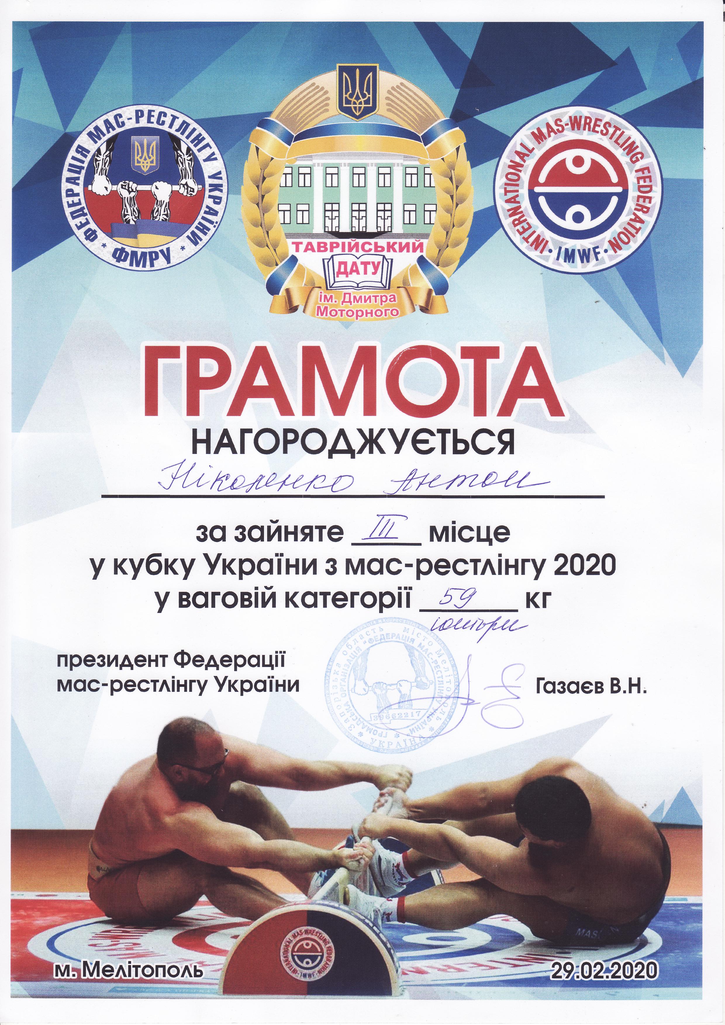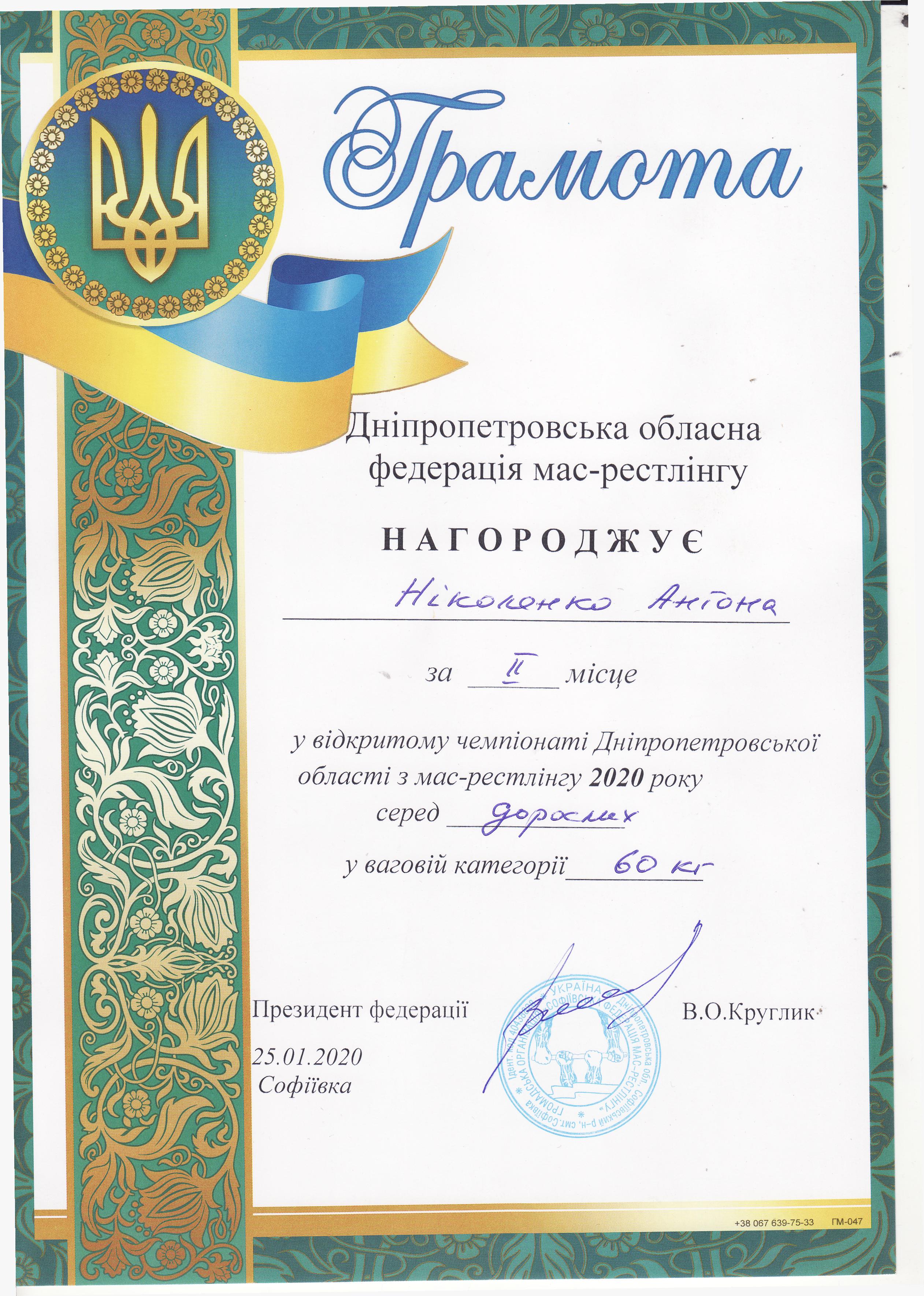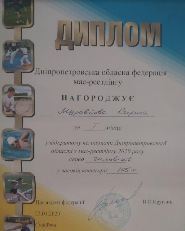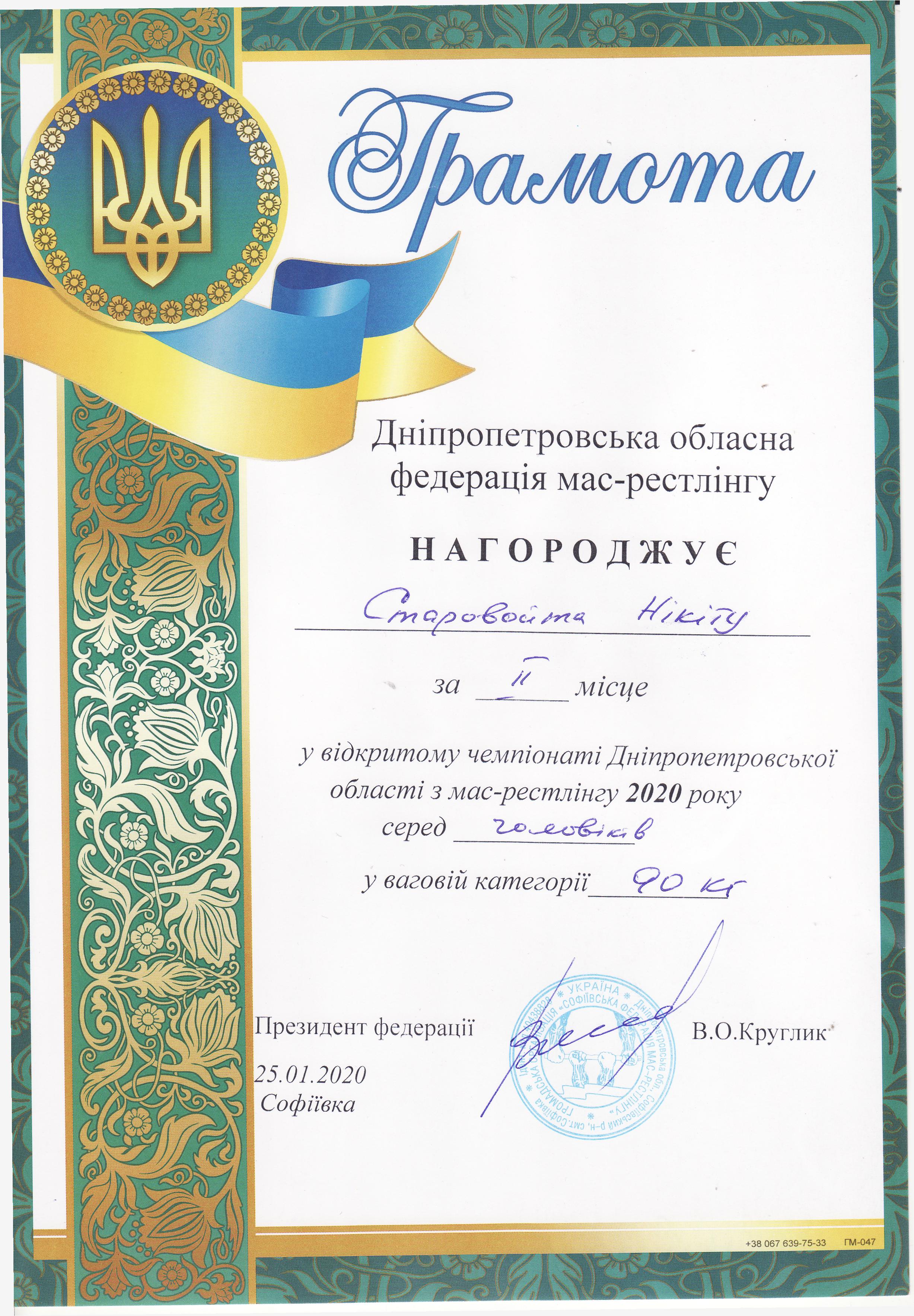 2. Відкритий чемпіонат Дніпропетровської області з мас-рестлінгу 2020, м. Софіївка, 25.01.2020 р.: Муравйов Кирило – 21 КН (І місце серед дорослих у ваговій категорії 105+), Старовойт Микита – 12 МБГМ (ІІ місце серед дорослих у ваговій категорії до 90 кг), Ніколенко Антон – 31 МК (ІІ місце серед дорослих у ваговій категорії до 60 кг) – ГРАМОТА 1ГРАМОТА 2ГРАМОТА 3