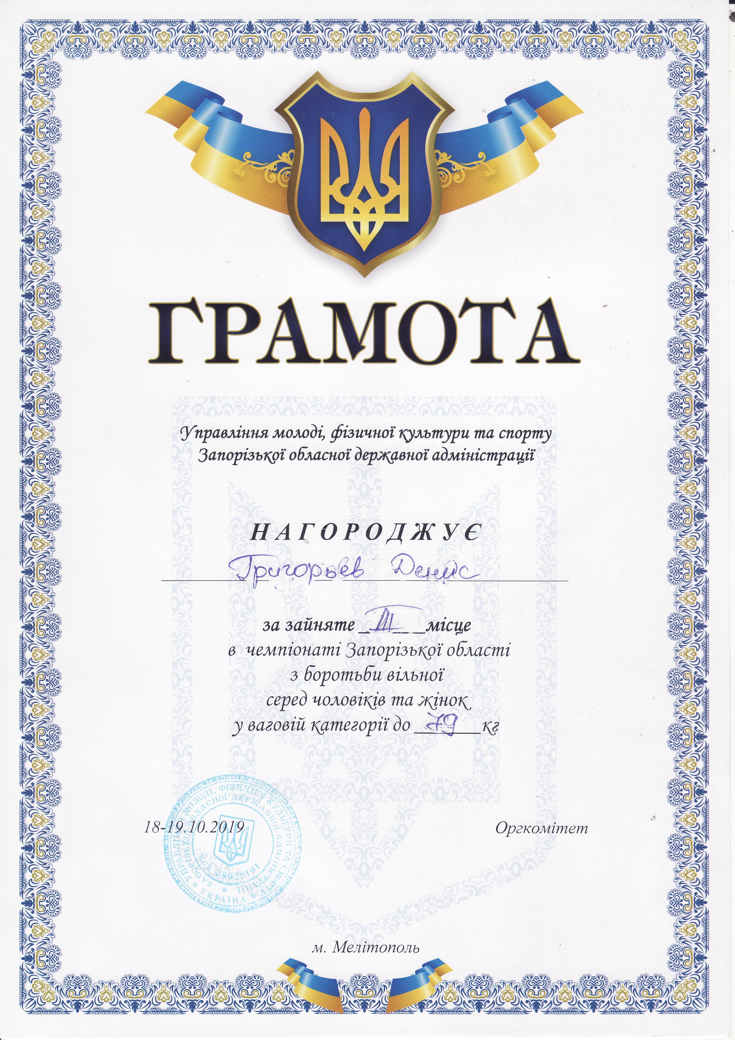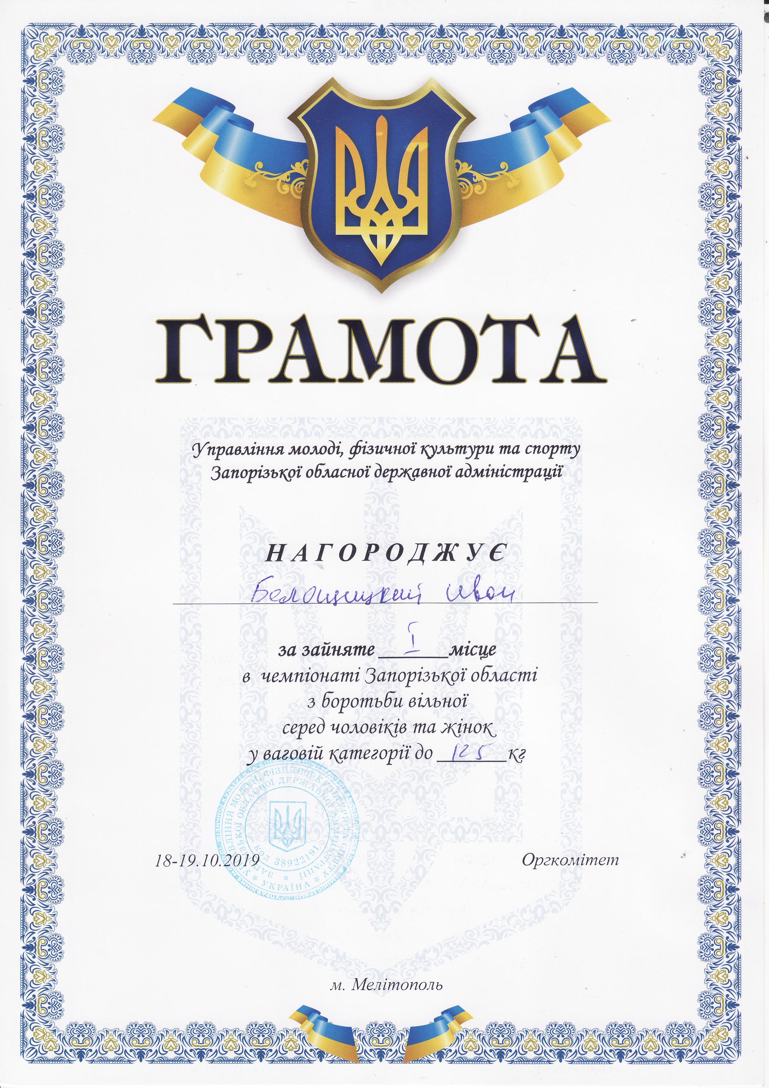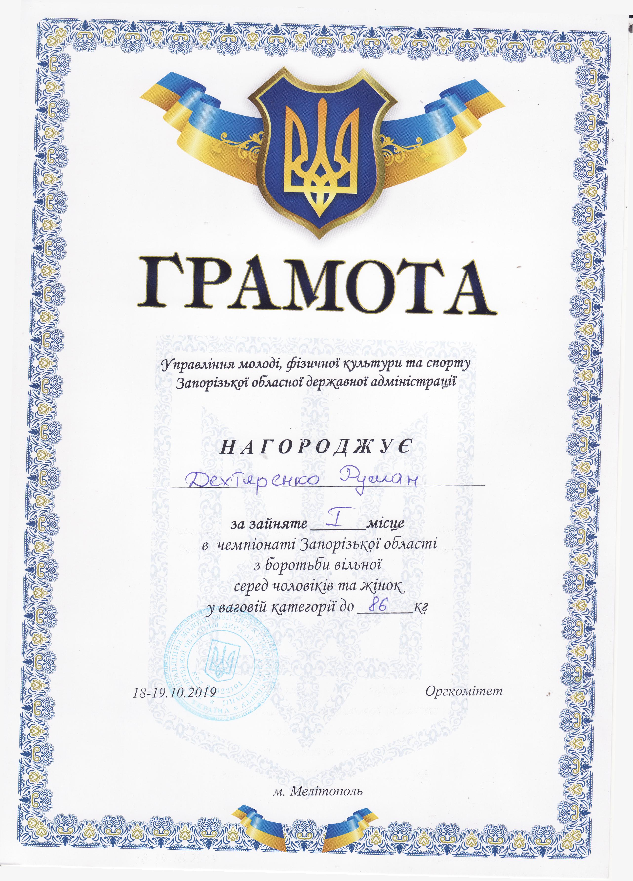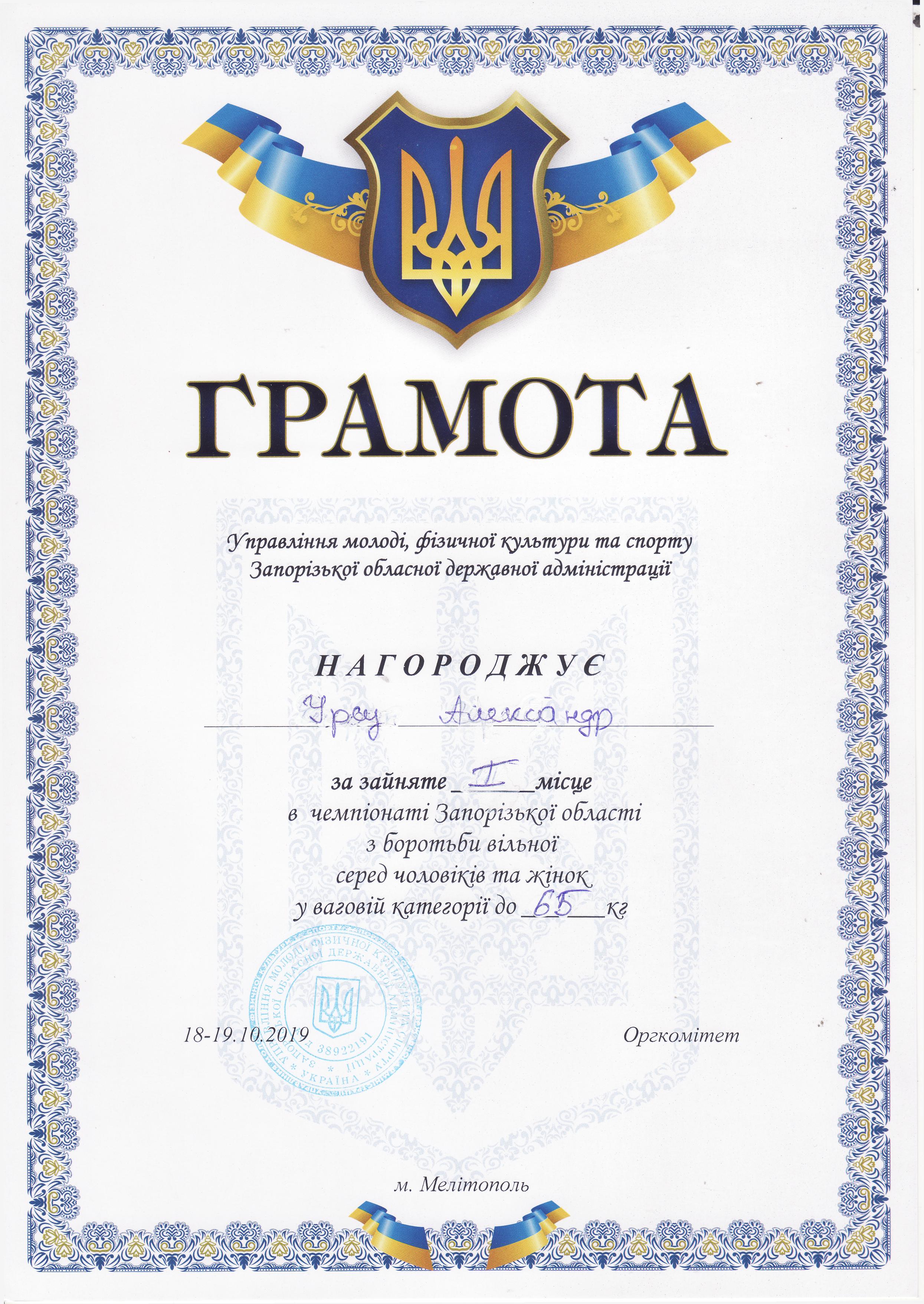 6. Чемпіонат Запорізької області з вільної боротьби серед чоловіків та жінок (м. Мелітополь, 18-19.10.2019 р.)Дехтяренко Руслан – 31 ЕЕ (І місце у ваговій категорії до 86 кг), Урсу Олександр – 22 САІ (І місце у ваговій категорії до 65 кг), Копоть В’ячеслав – 12 СЕЕ (І місце у ваговій категорії до 79 кг), Білошицький Іван – 31 ГМ (І місце у ваговій категорії до 125 кг), Григор’єв Денис – 13 САІ (ІІІ місце у ваговій категорії до 79 кг), В’юнік Герман – 21 АГ (ІІІ місце у ваговій категорії до 61 кг) – ГРАМОТА 1ГРАМОТА 2ГРАМОТА 3ГРАМОТА 4ГРАМОТА 5ГРАМОТА 6