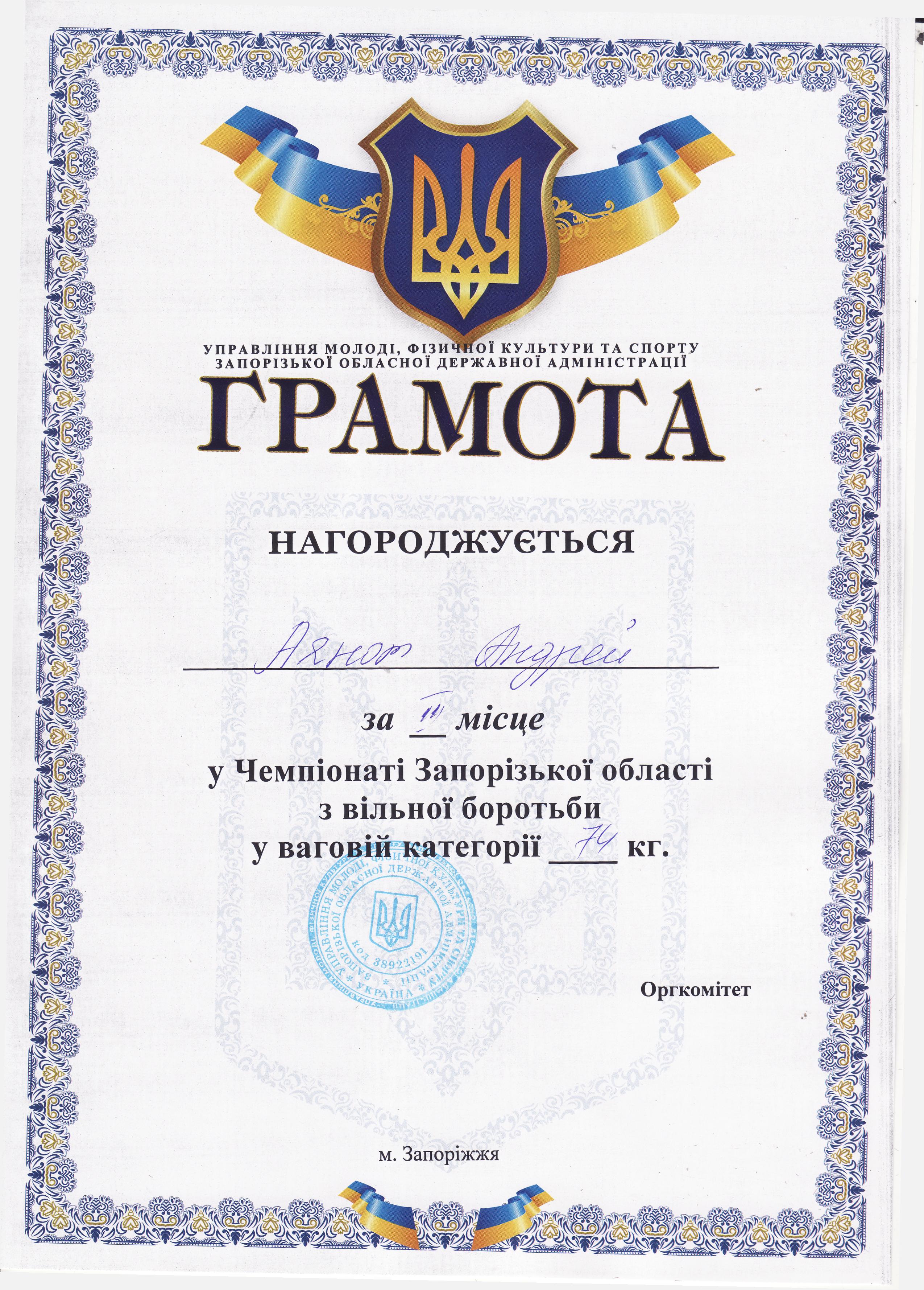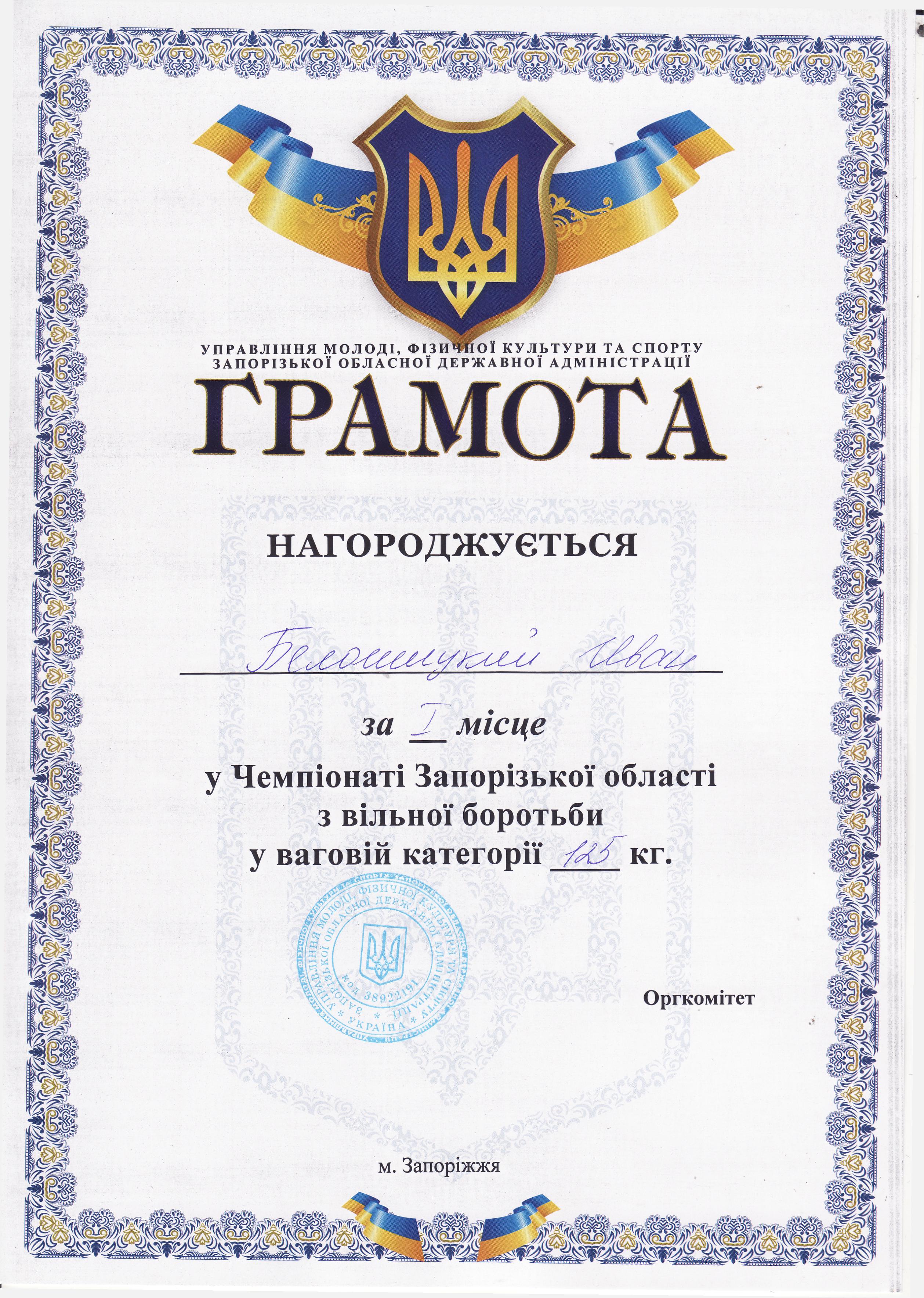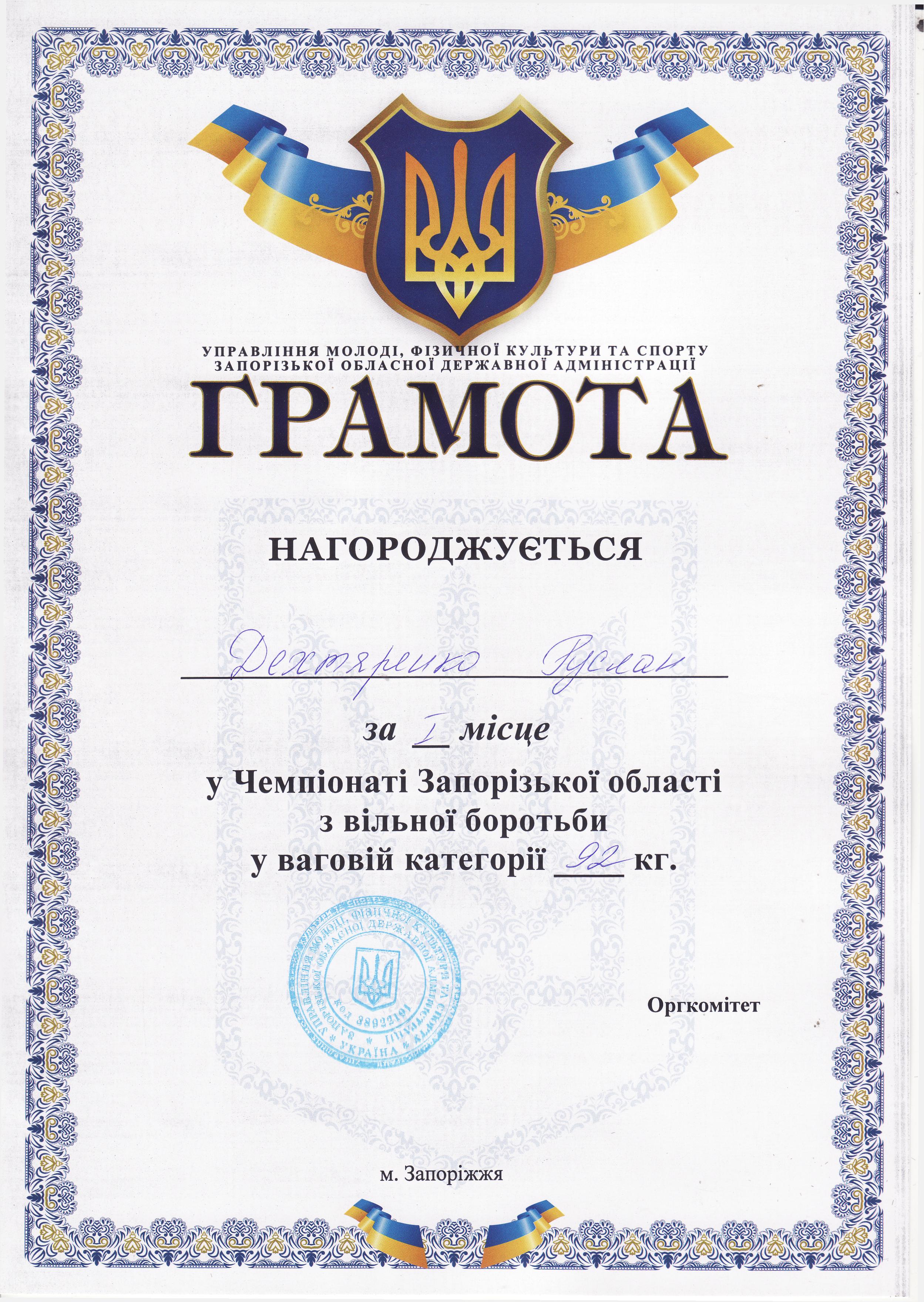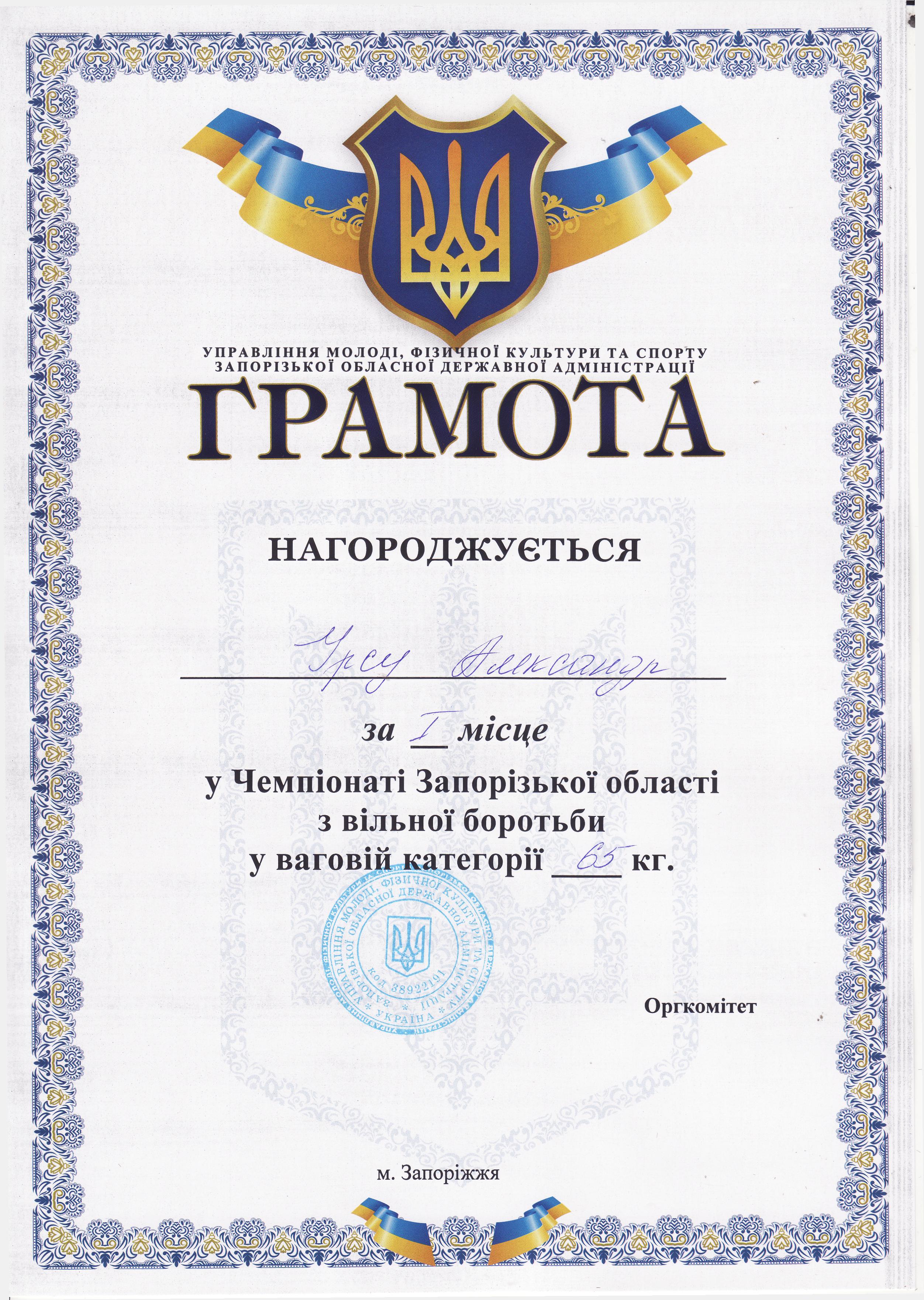 6. Чемпіонат Запорізької області з вільної боротьби серед чоловіків та жінок (м. Мелітополь, 18-19.10.2019 р.)Дехтяренко Руслан – 31 ЕЕ (І місце у ваговій категорії до 86 кг), Урсу Олександр – 22 САІ (І місце у ваговій категорії до 65 кг), Копоть В’ячеслав – 12 СЕЕ (І місце у ваговій категорії до 79 кг), Білошицький Іван – 31 ГМ (І місце у ваговій категорії до 125 кг), Григор’єв Денис – 13 САІ (ІІІ місце у ваговій категорії до 79 кг), В’юнік Герман – 21 АГ (ІІІ місце у ваговій категорії до 61 кг) – ГРАМОТА 1ГРАМОТА 2ГРАМОТА 3ГРАМОТА 4ГРАМОТА 5ГРАМОТА 6