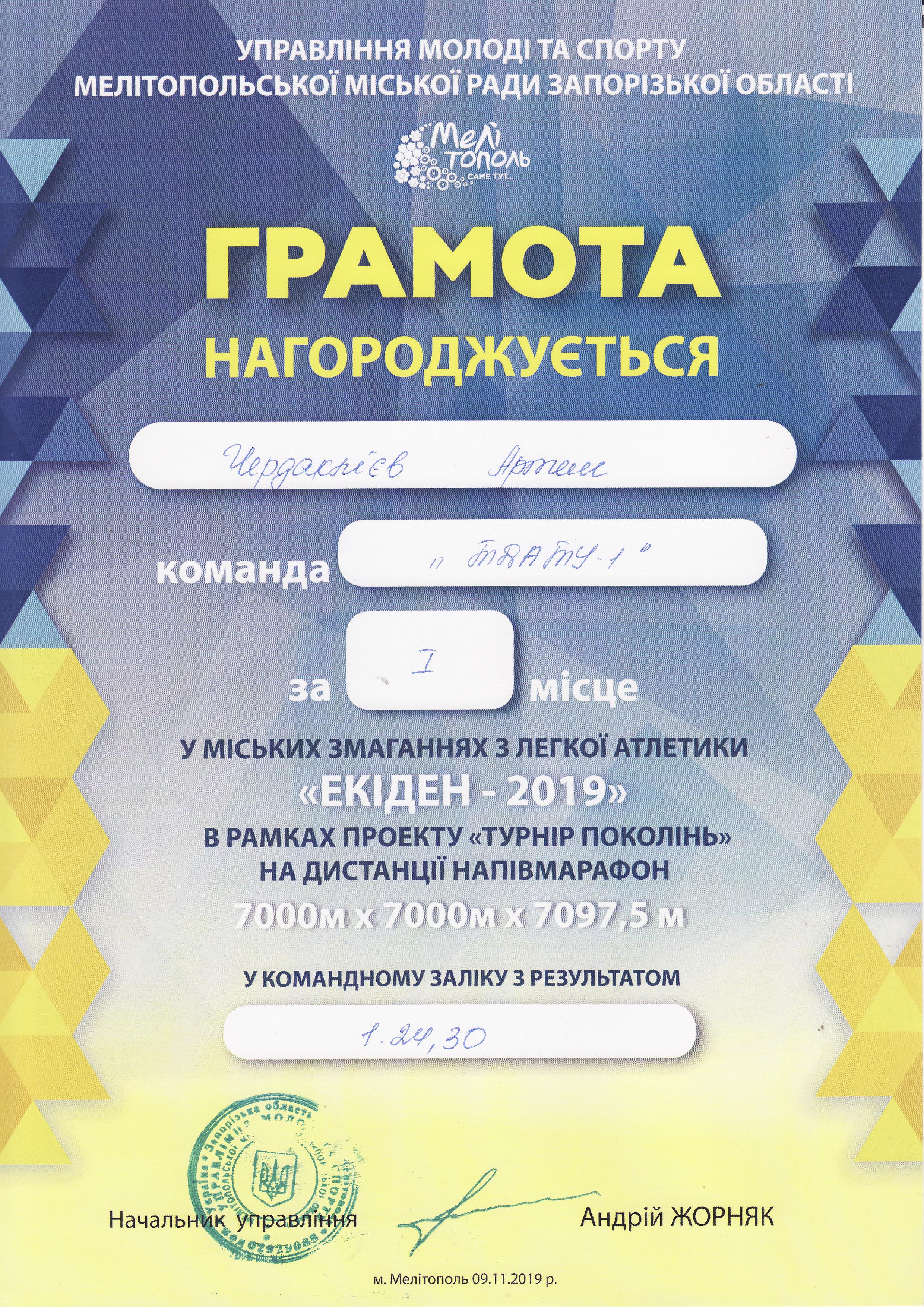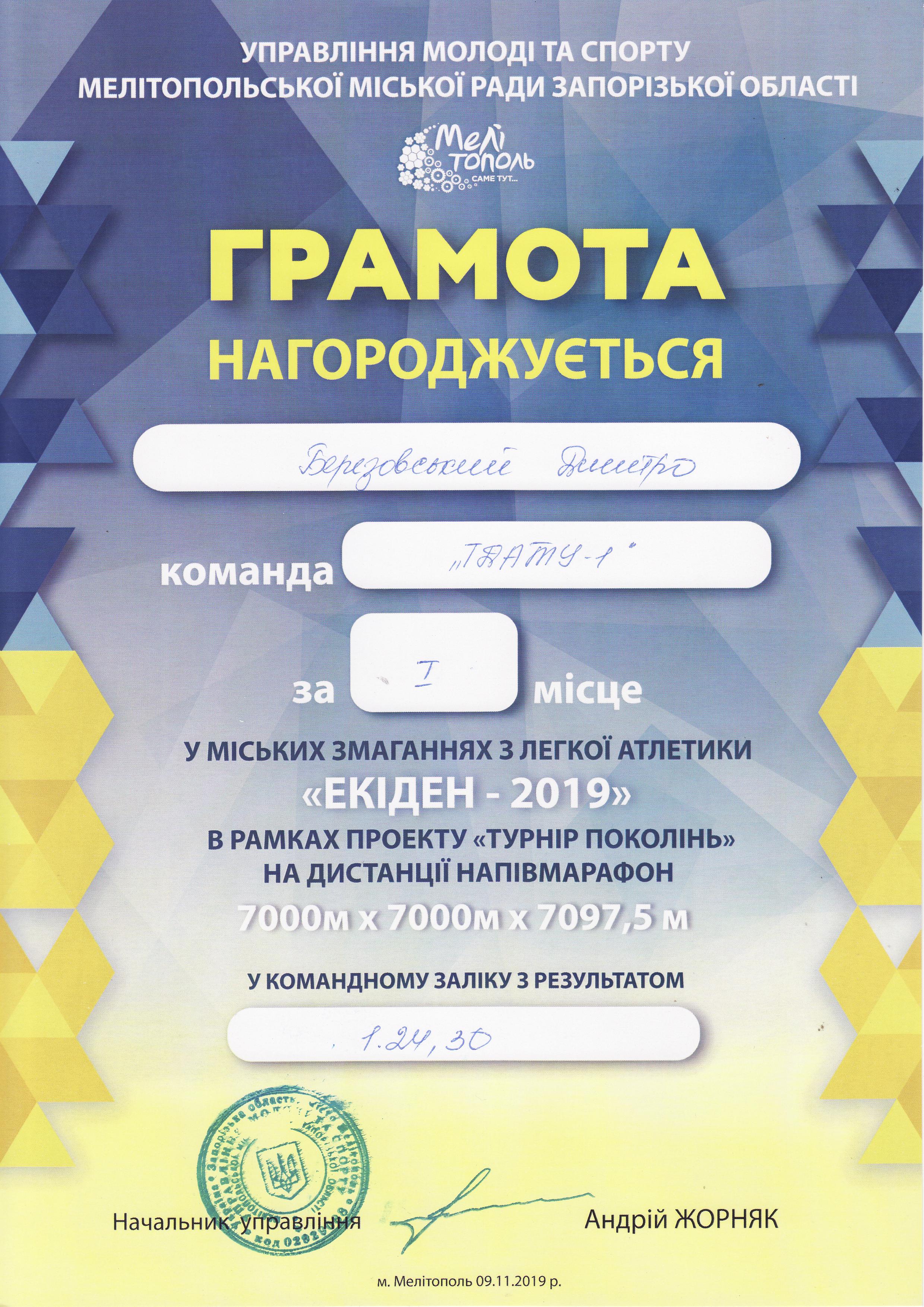 2. Міські змагання з легкої атлетики “Екіден-2019” в рамках проєкту “Турнір поколінь” на дистанції півмарафон 7000м×7000м×7097,5 метрів (м. Мелітополь. 9.11.2019 р.)збірна команда ТДАТУ-1 (І місце) – ГРАМОТА 1ГРАМОТА 2, ГРАМОТА 3
