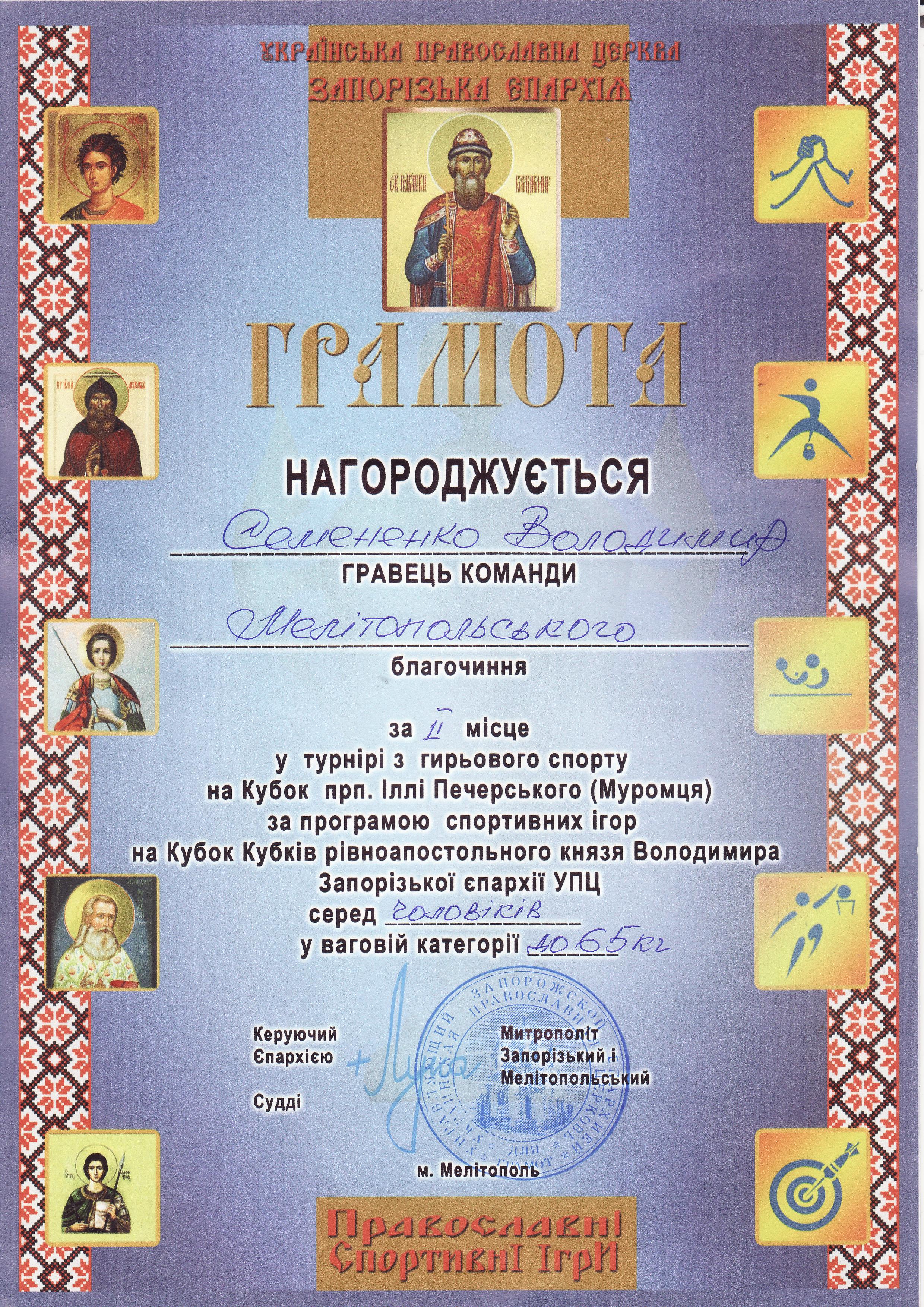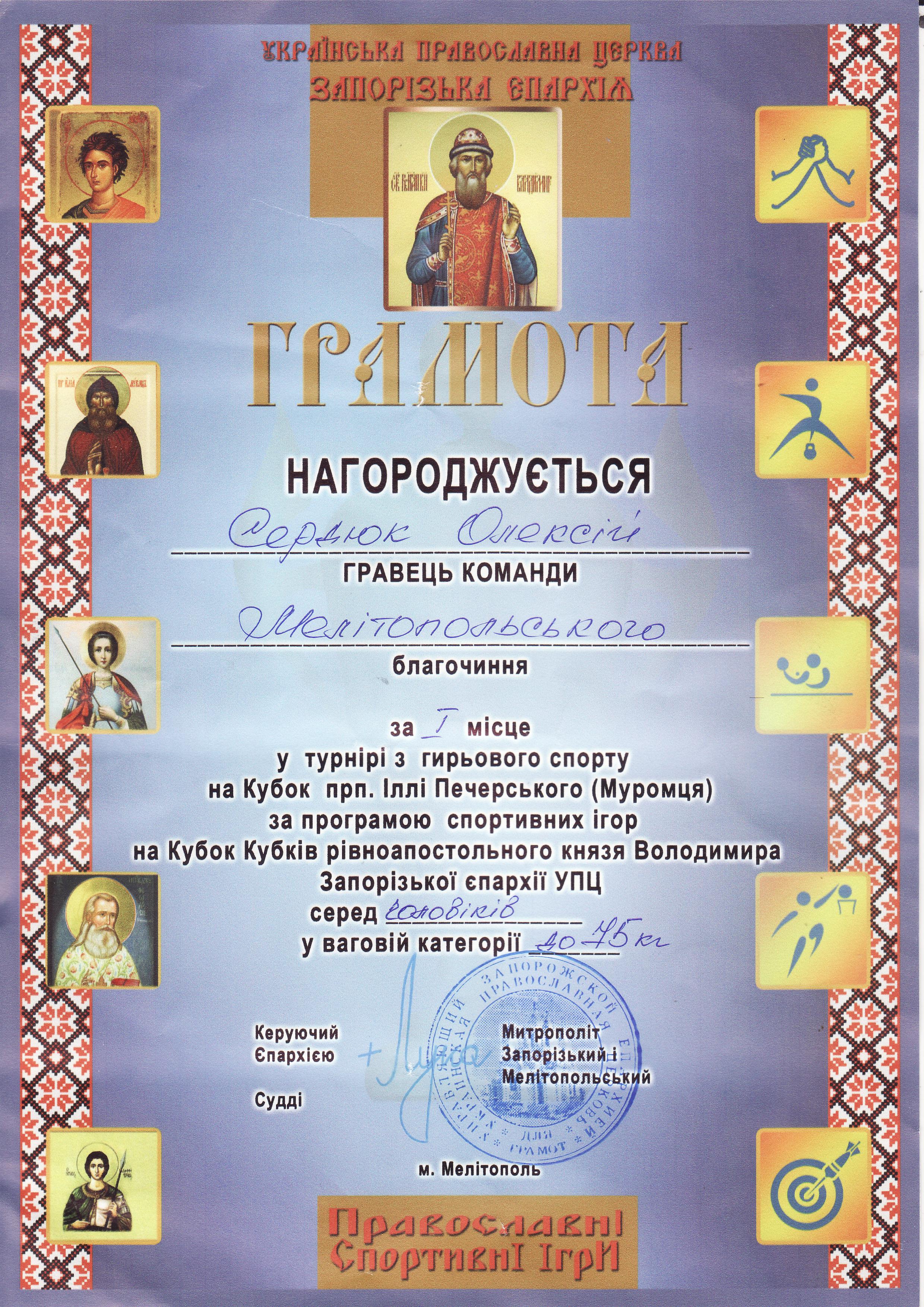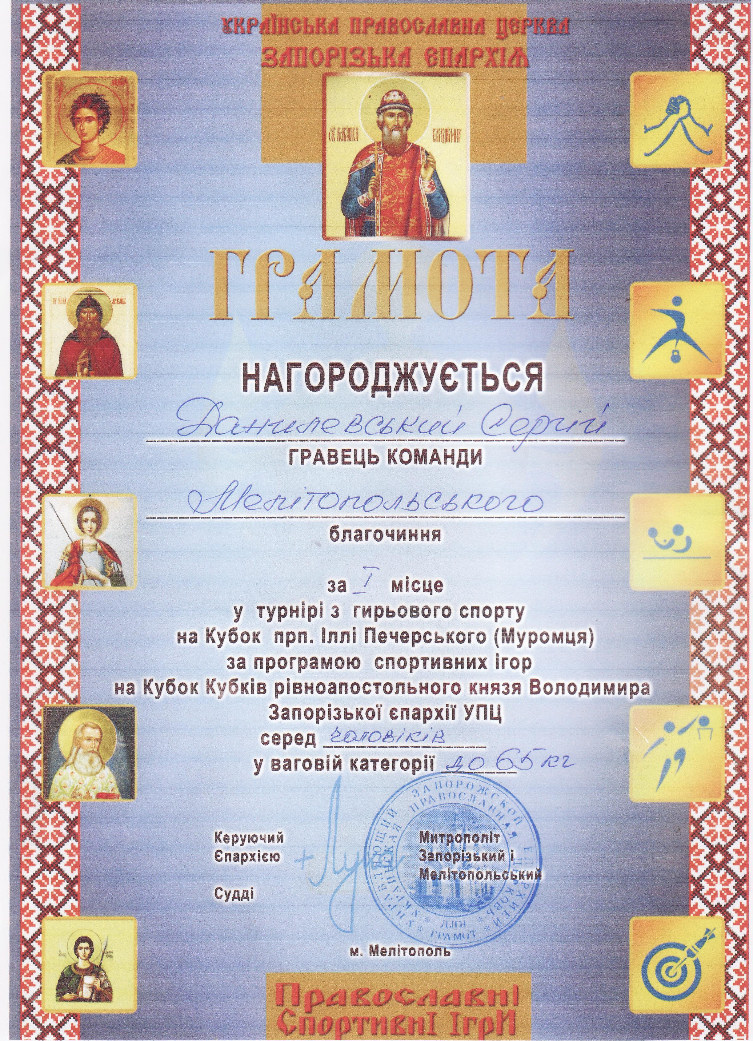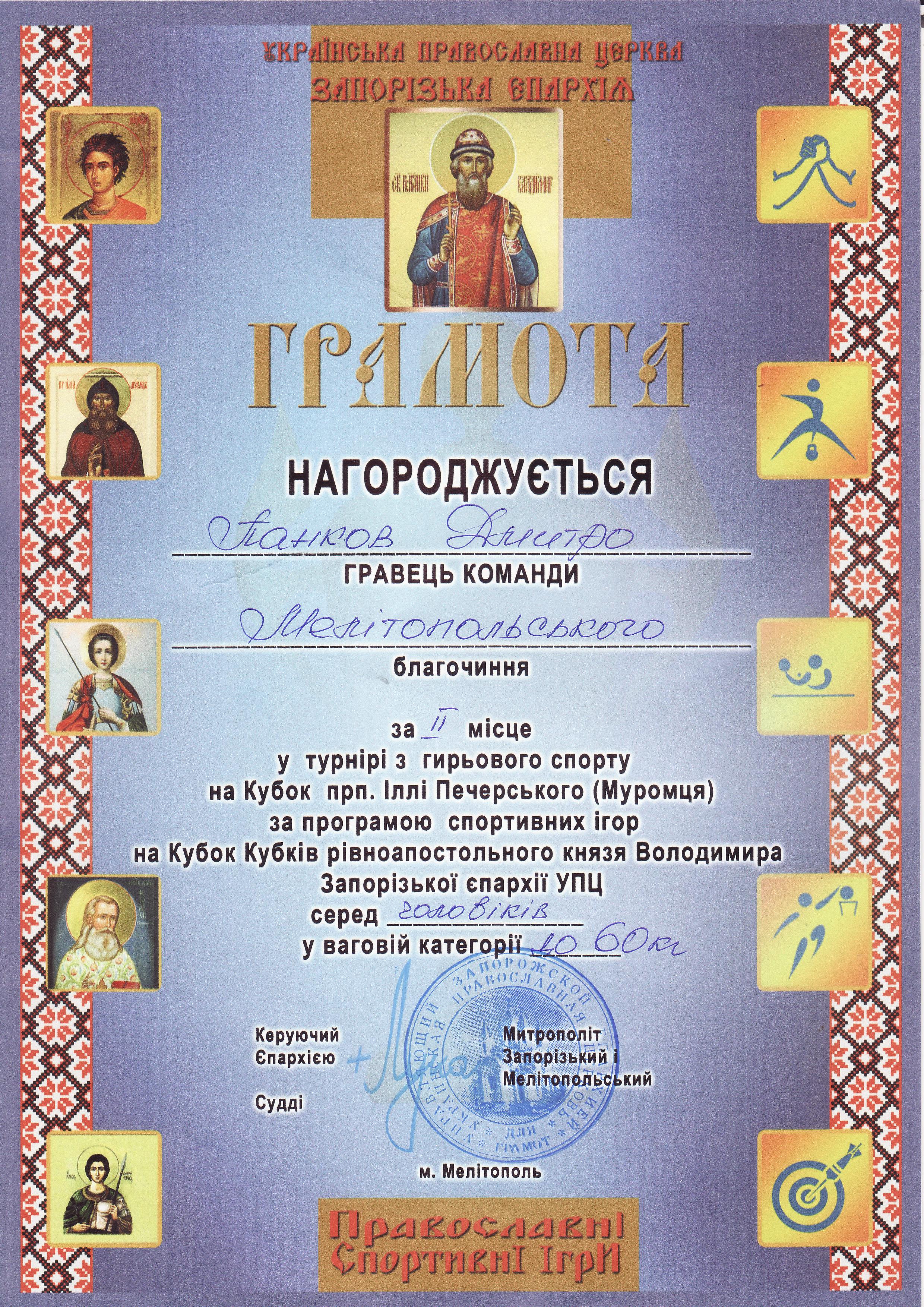 1. Турнір з гирьового спорту на Кубок прп. Іллі Печерського (Муромця) за програмою спортивних ігор на Кубок Кубків рівноапостольного князя Володимира Запорізької єпархії УПЦ серед чоловіків (м. Мелітополь, 19.10.2019 р.)Данилевський Сергій – 11 МБАІ (І місце у ваговій категорії до 65 кг), Сердюк Олексій – 11 АІ (І місце у ваговій категорії до 75 кг), Москаленко Ольга – 31 ХТ (ІІ місце у ваговій категорії 70+ кг), Панков Дмитро – 31 ЕЕ (ІІ місце у ваговій категорії до 60 кг), Гончаров Віктор – 11 МБГМ (ІІ місце у ваговій категорії до 70 кг), Семененко Володимир – 12 АІ (ІІ місце у ваговій категорії до 65 кг) – ГРАМОТА 1ГРАМОТА 2ГРАМОТА 3ГРАМОТА 4ГРАМОТА 5ГРАМОТА 6