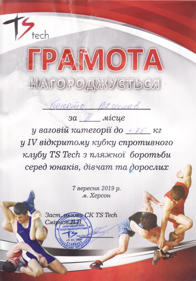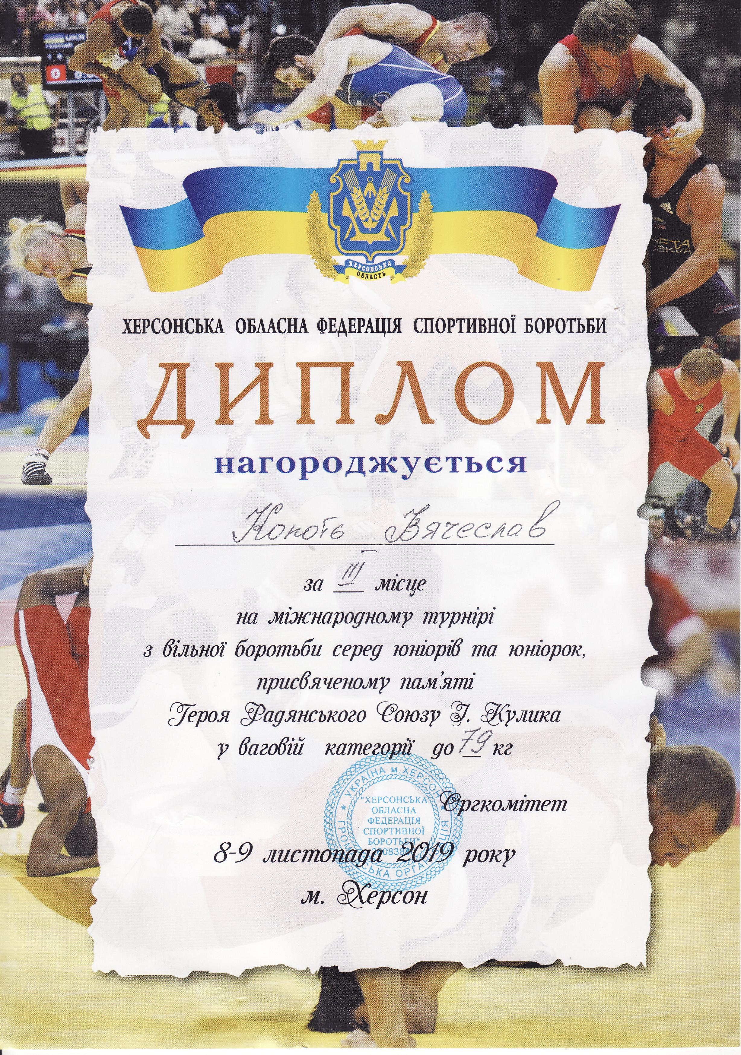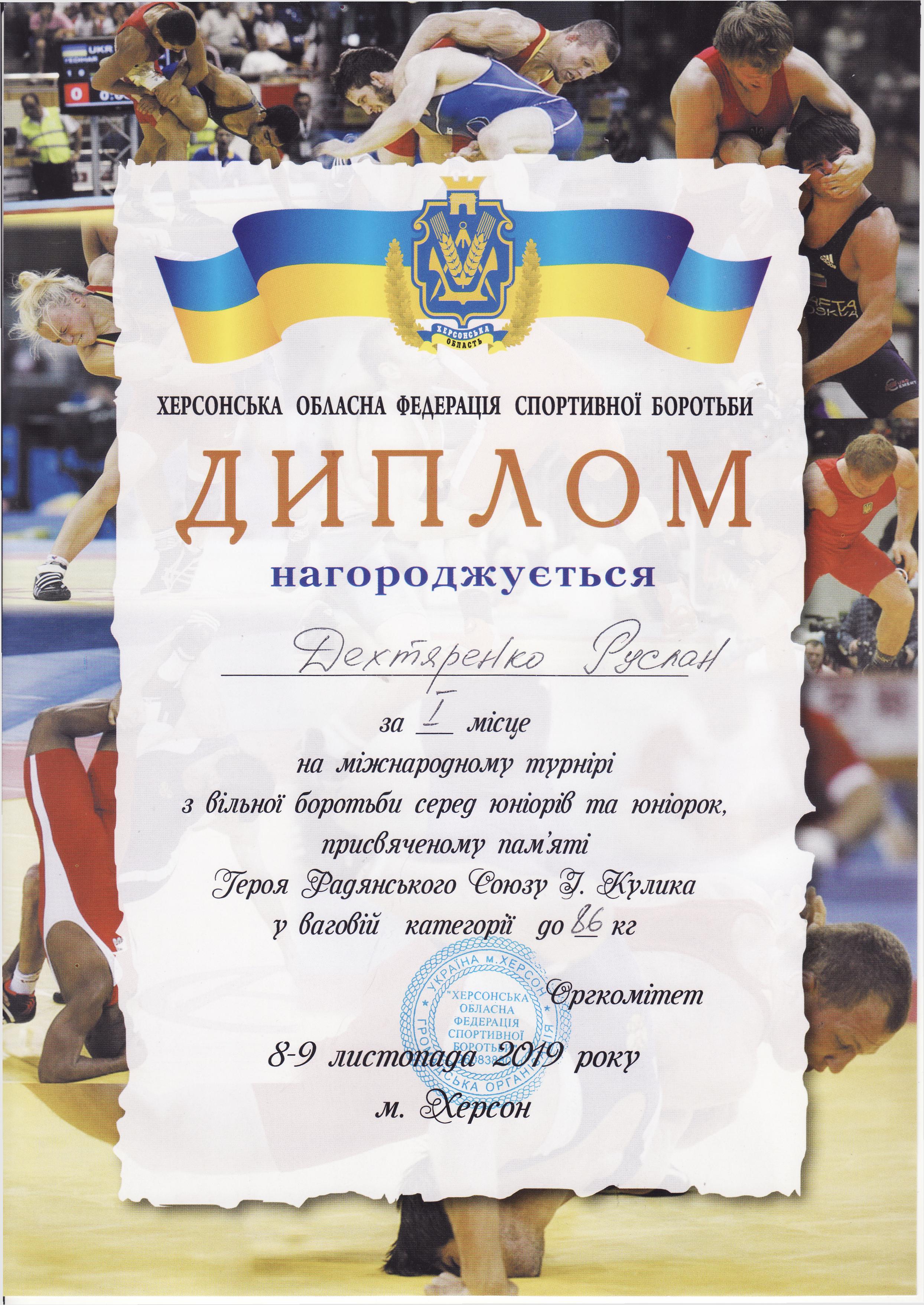 4. Міжнародний турнір з вільної боротьби серед юніорів та юніорок, присвячений пам’яті Героя Радянського Союзу І. Кулика (м. Херсон, 8-9.11.2019 р.)Дехтяренко Руслан – 31 ЕЕ (І місце у ваговій категорії до 86 кг, виконав НОРМАТИВ “МАЙСТЕР СПОРТУ УКРАЇНИ З ВІЛЬНОЇ БОРОТЬБИ”), Копоть В’ячеслав – 12 СЕЕ (ІІІ місце у ваговій категорії до 79 кг) – ГРАМОТА 1ГРАМОТА 2