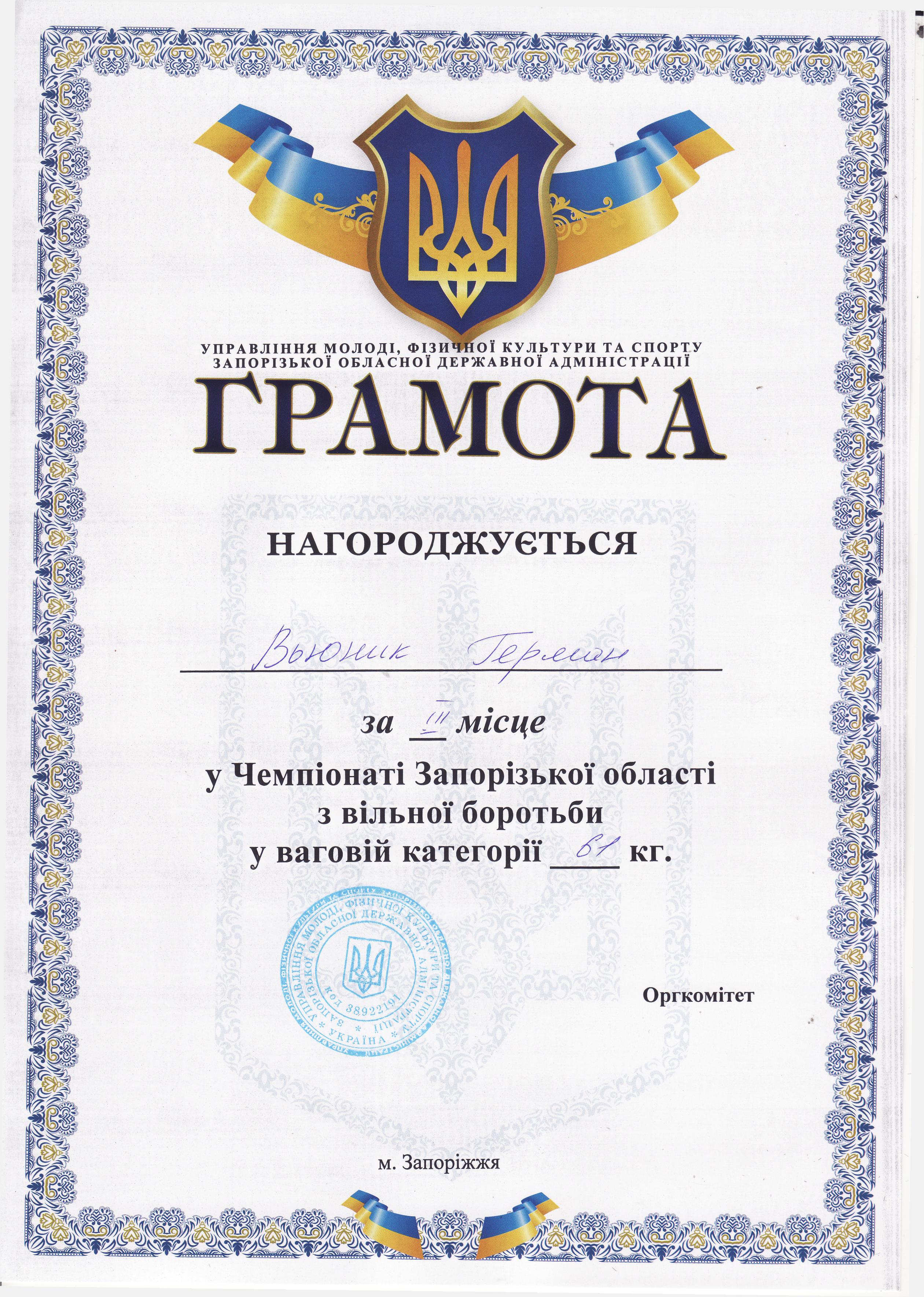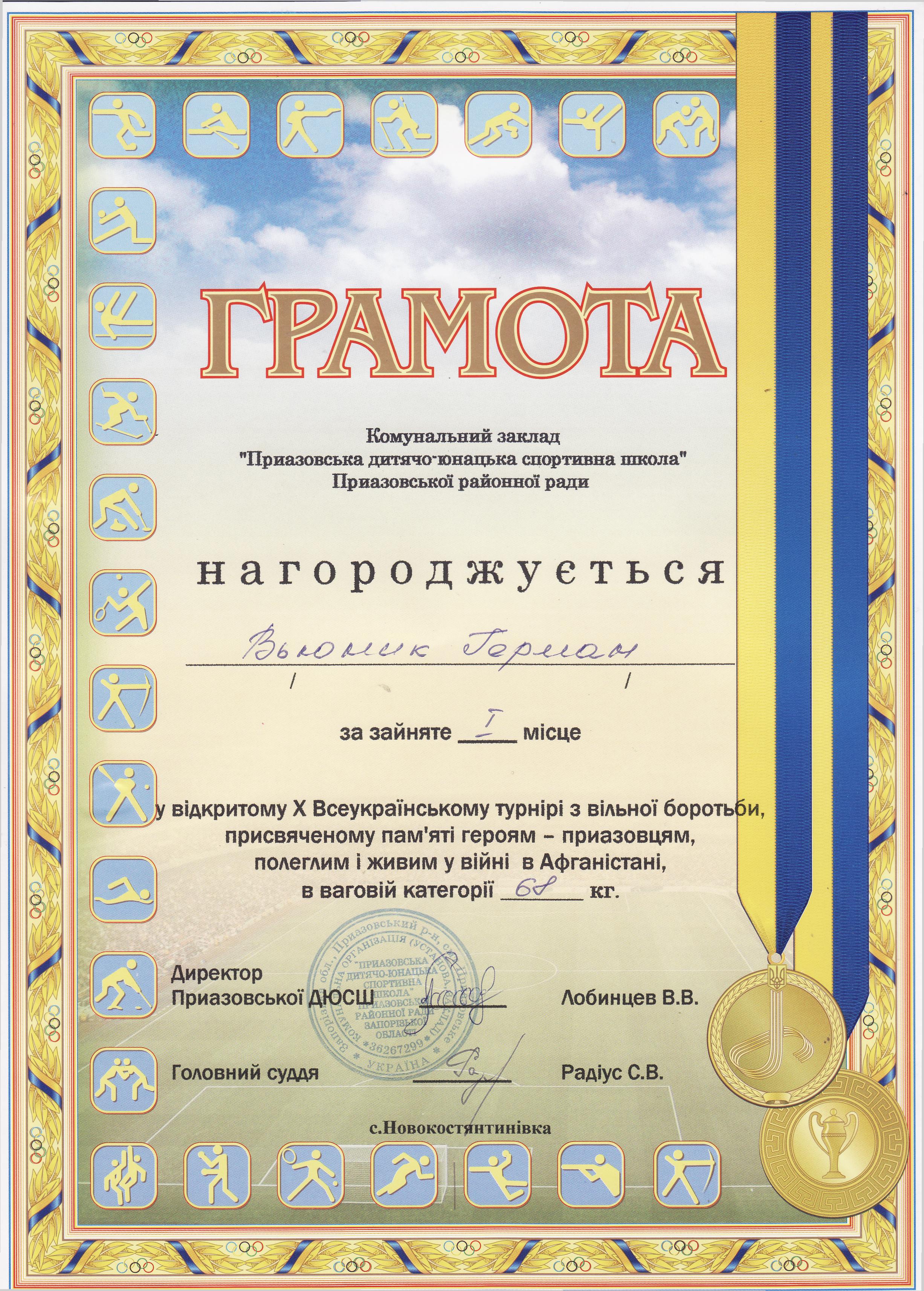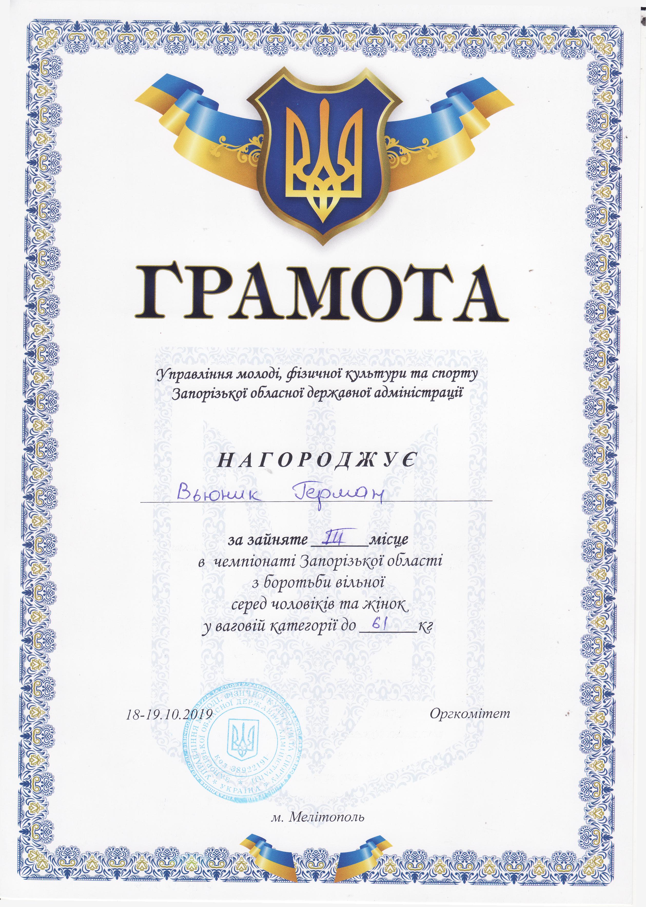 2. Відкритий X Всеукраїнський турнір з вільної боротьби, присвячений пам’яті героям-приазовцям, полеглим і живим у війні в Афганістані (с. Новокостянтинівка Херсонської області, 14.09.2019 р.)В’юнік Герман – 21 АГ (І місце у ваговій категорії до 68 кг) – ГРАМОТА