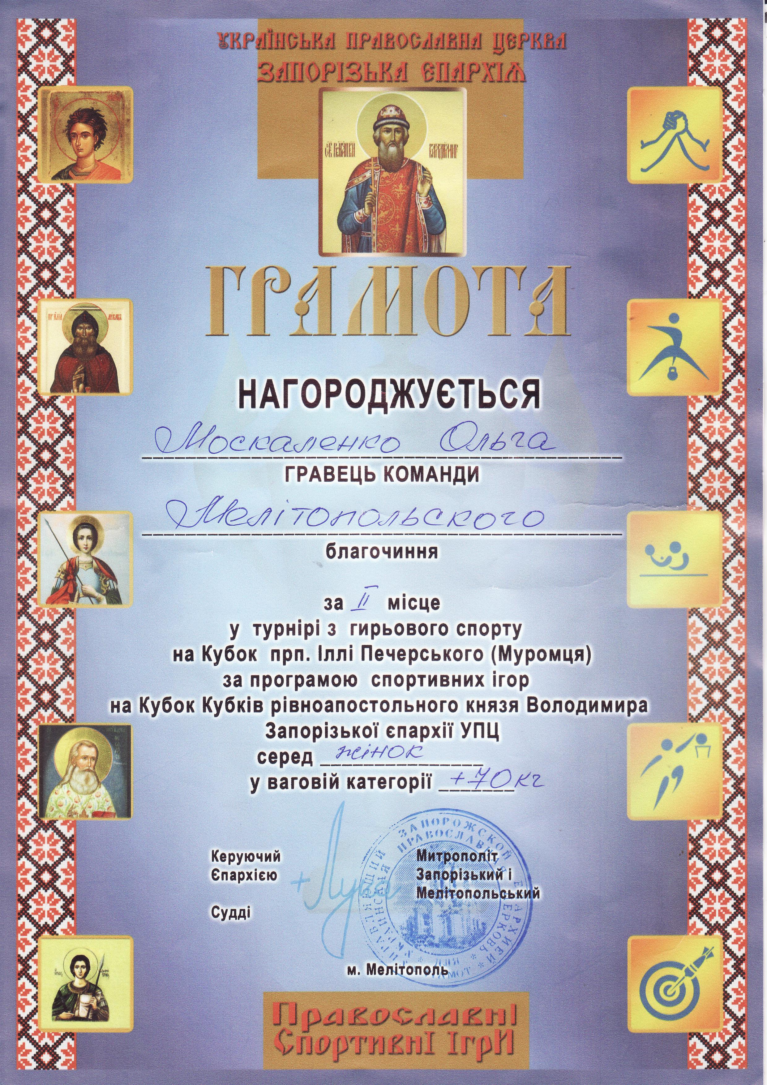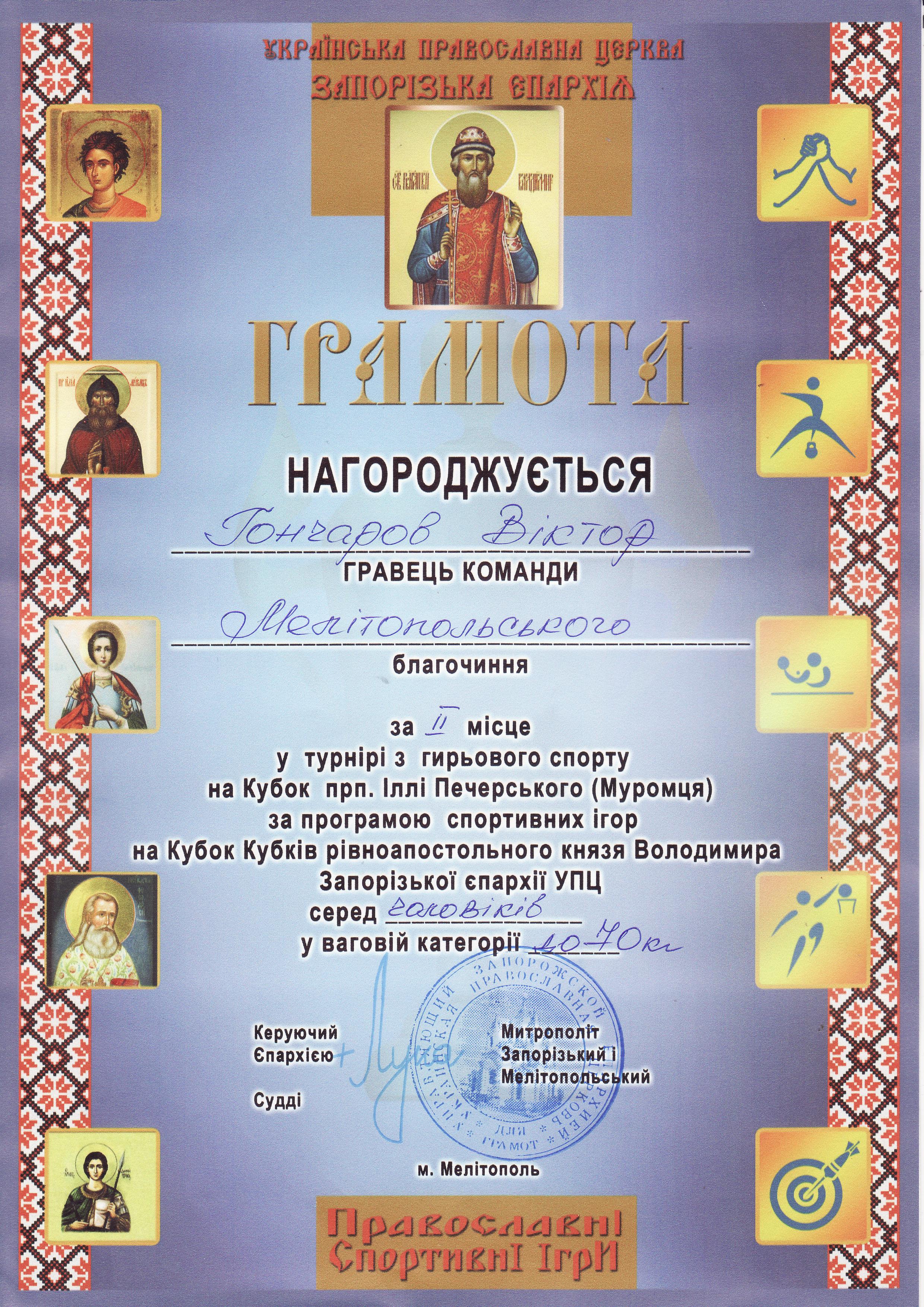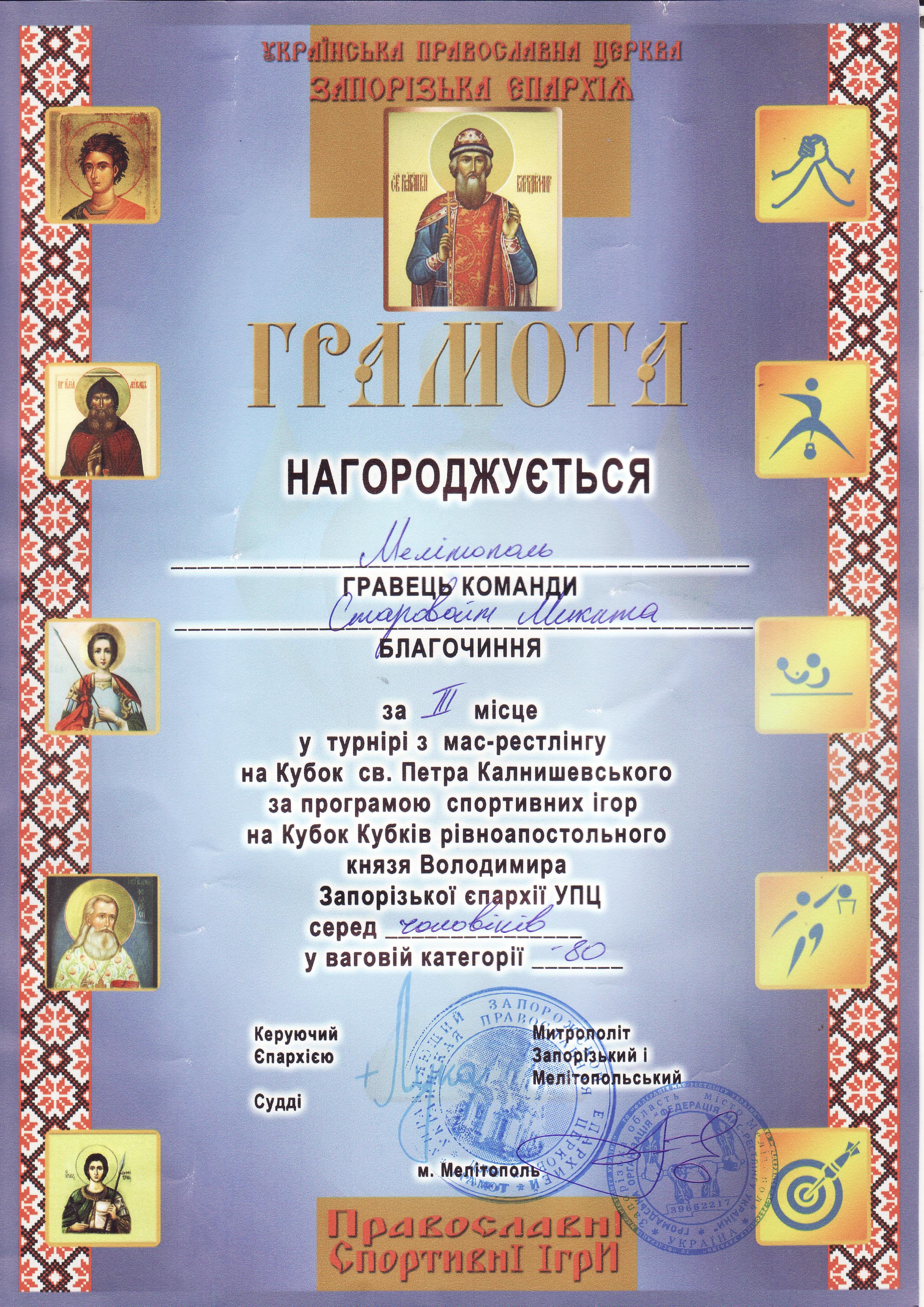 2. Турнір з мас-рестлінгу на Кубок св. Петра Калнишевського за програмою спортивних ігор на Кубок Кубків рівноапостольного князя Володимира Запорізької єпархії УПЦ серед чоловіків, м. Мелітополь, 19.10.2019 р.Муравйов Кирило – 21 КН (ІІ місце у ваговій категорії 90-105 кг), Старовойт Микита – 12 МБГМ (ІІІ місце у ваговій категорії до 80 кг) – ГРАМОТА 1, ГРАМОТА 2