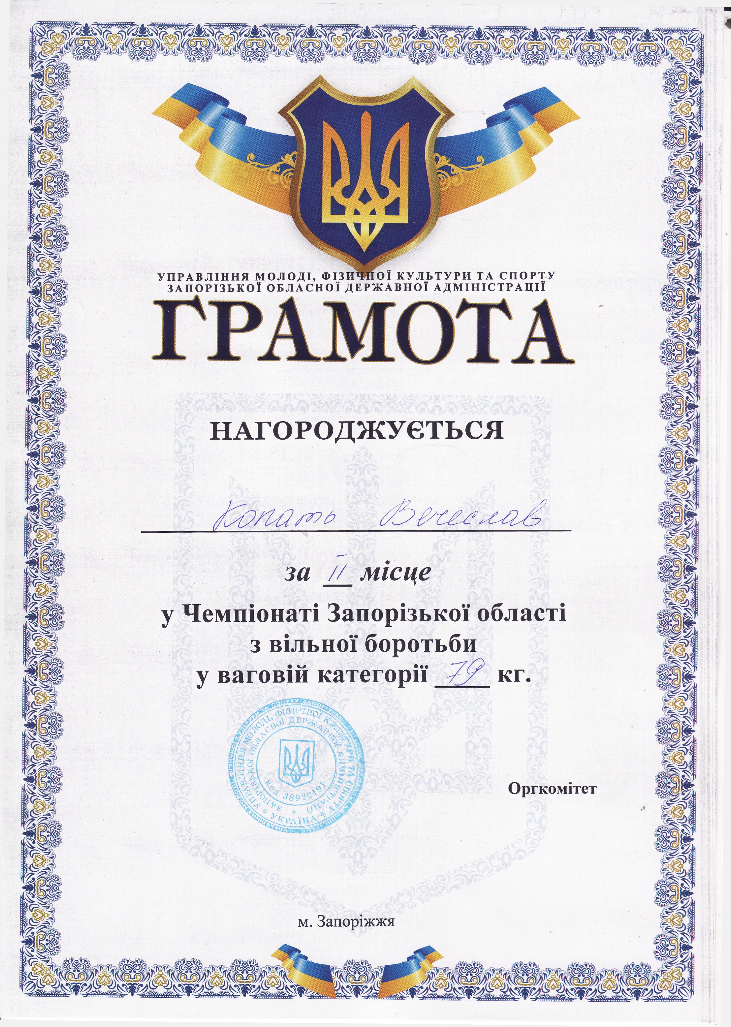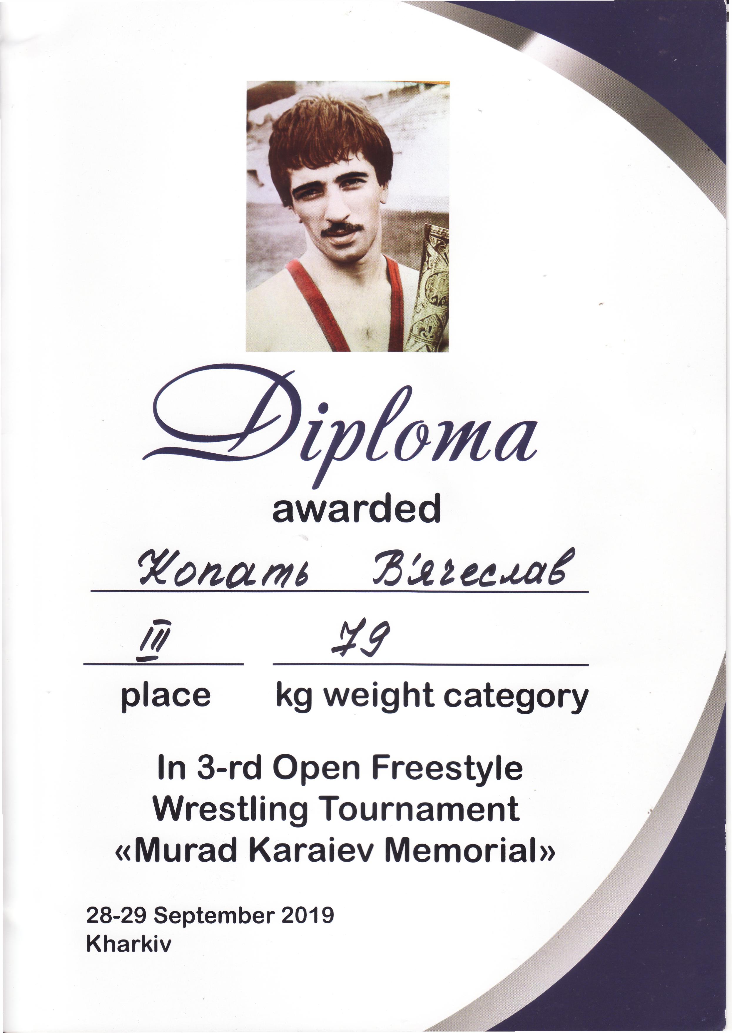 3. Відкритий Всеукраїнський турнір з вільної боротьби серед чоловіків до 23 років пам’яті майстра спорту міжнародного класу Мурада Караєва (м. Харків, 28-29.09.2019 р.)Копоть В’ячеслав – 12 СЕЕ (ІІІ місце у ваговій категорії до 79 кг) – ГРАМОТА