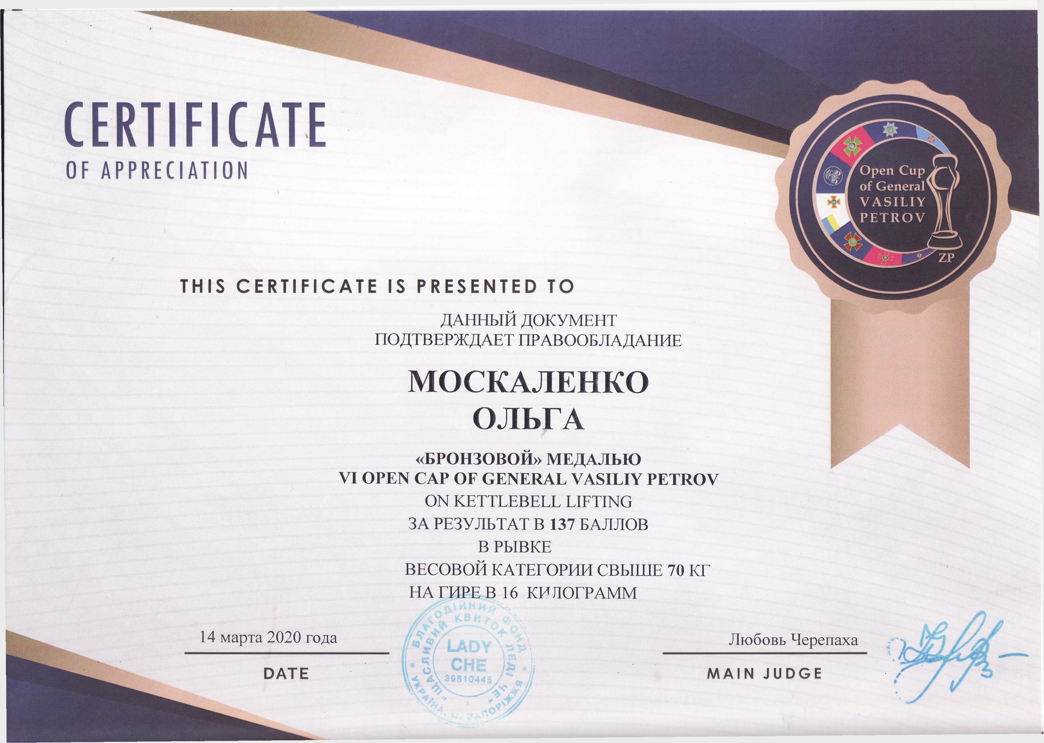 3. VI Відкритий Кубок генерала Василя Петрова з гирьового спорту (м. Запоріжжя, 14.03.2020 р.)Москаленко Ольга – 31 ХТ (ІІІ місце у ваговій категорії 70+ кг) – ГРАМОТА