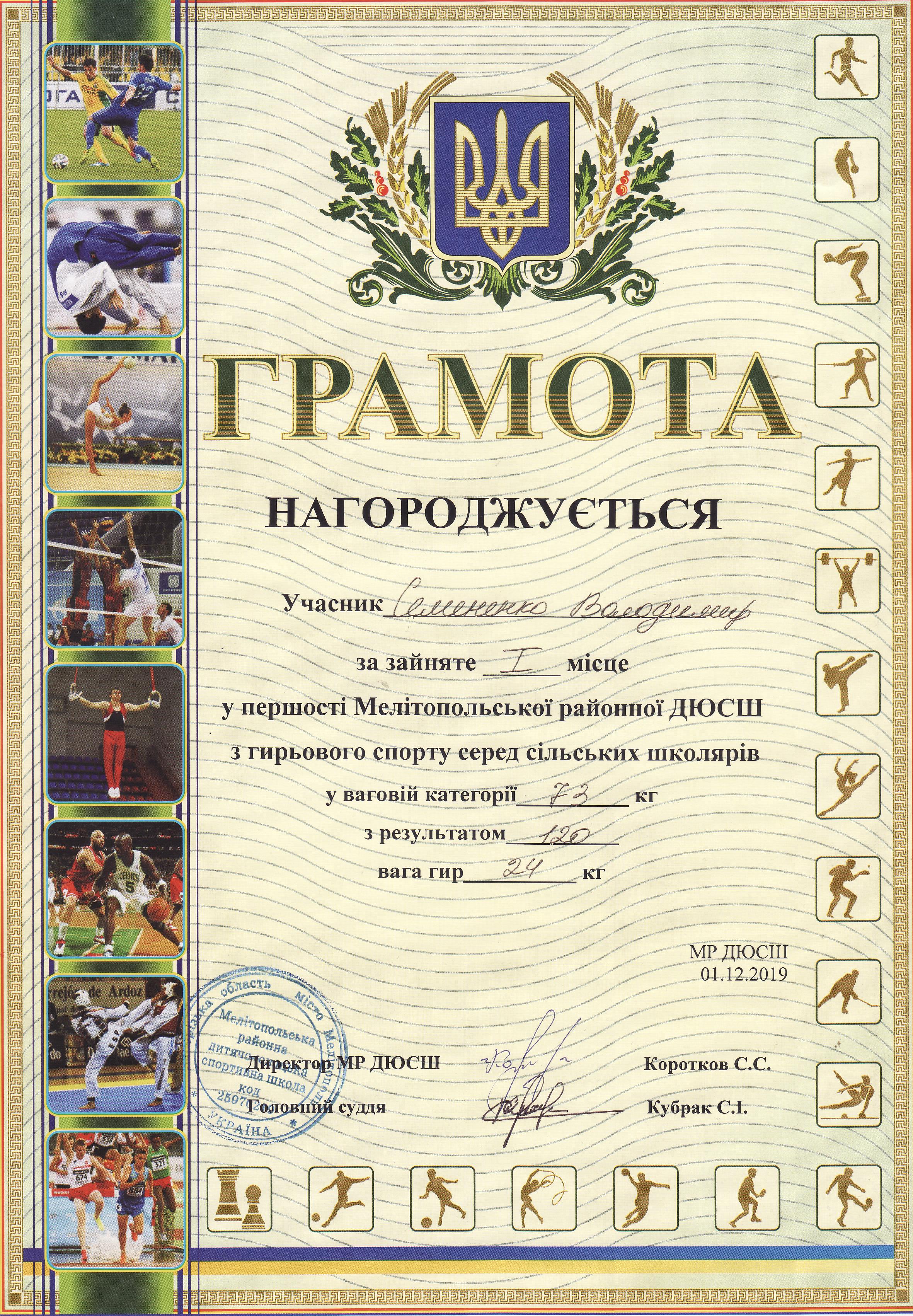2. Відкрита першість Мелітопольської районної ДЮСШ з гирьового спорту серед юнаків і дівчат (с. Костянтинівка Запорізької області, 01.12.2019 р.Семененко Володимир – 12 АІ (І місце у ваговій категорії до 73 кг) – ГРАМОТА