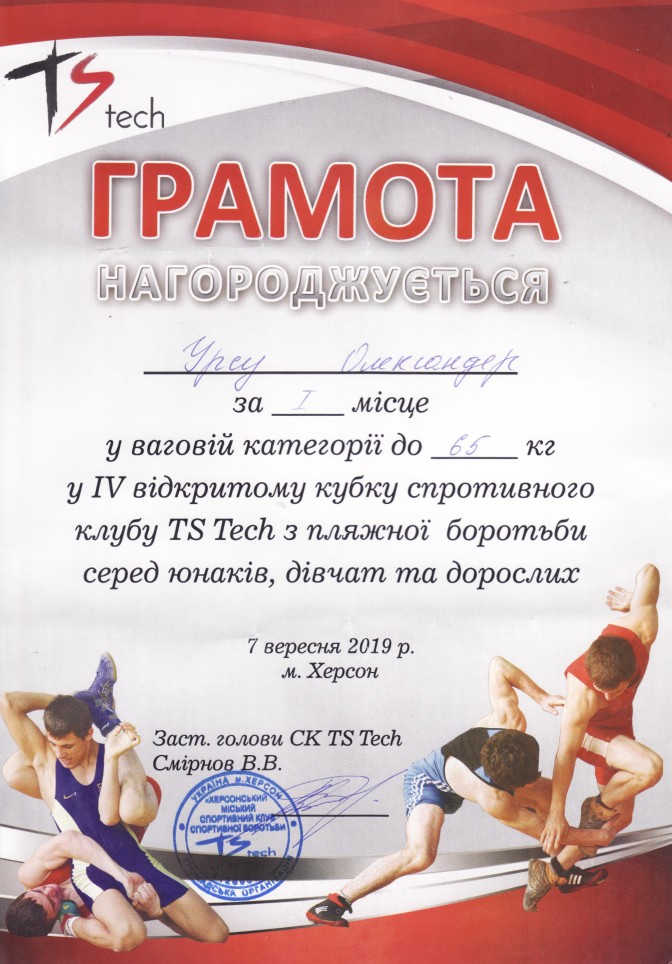 1. IV відкритий Кубок спортивного клубу TS Tech з пляжної боротьби серед юнаків, дівчат та дорослих (м. Херсон, 7.09.2019 р.)Урсу Олександр – 22 САІ (І місце у ваговій категорії до 65 кг), Копоть В’ячеслав – 12 СЕЕ (ІІІ місце у ваговій категорії до 75 кг) – ГРАМОТА 1ГРАМОТА 2
