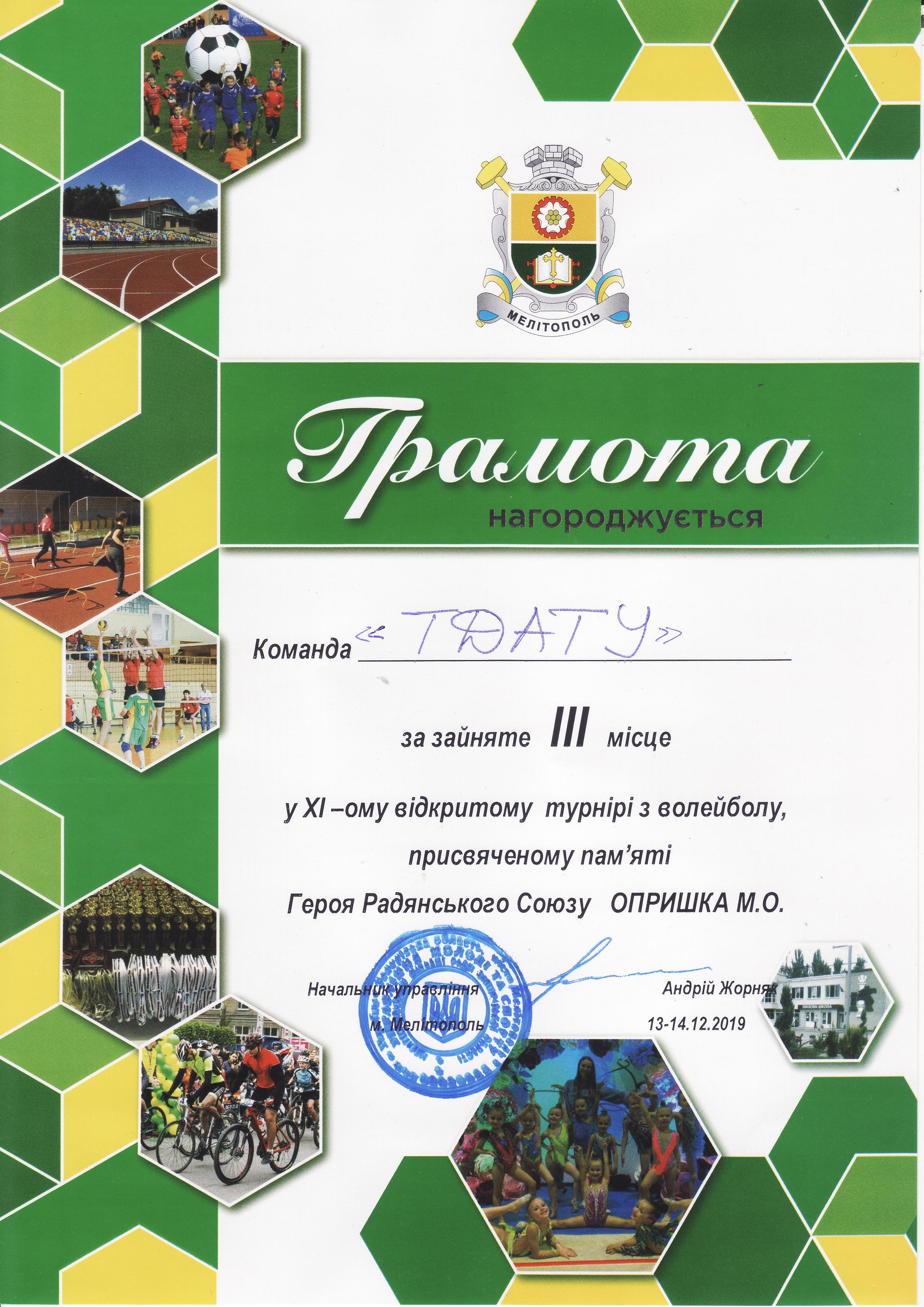 2. XI турнір-меморіал з волейболу пам’яті генерала авіації М.О. Опришко (м. Мелітополь, 13-14.12.2019 р.) – збірна команда ТДАТУ (III місце) – ГРАМОТА
