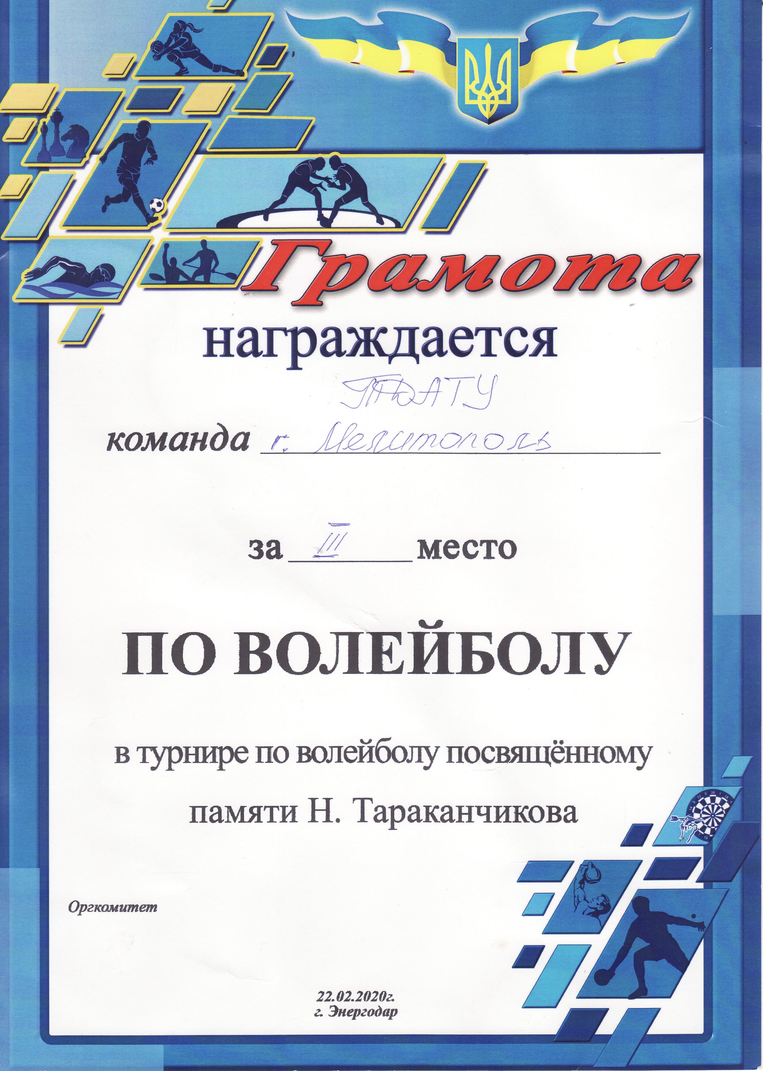2. Турнір по волейболу, присвяченому пам’яті Миколи Тараканчикова (м. Енергодар Запорізької області, 22.02.2020 р.) – збірна команда ТДАТУ (III місце) – ГРАМОТА