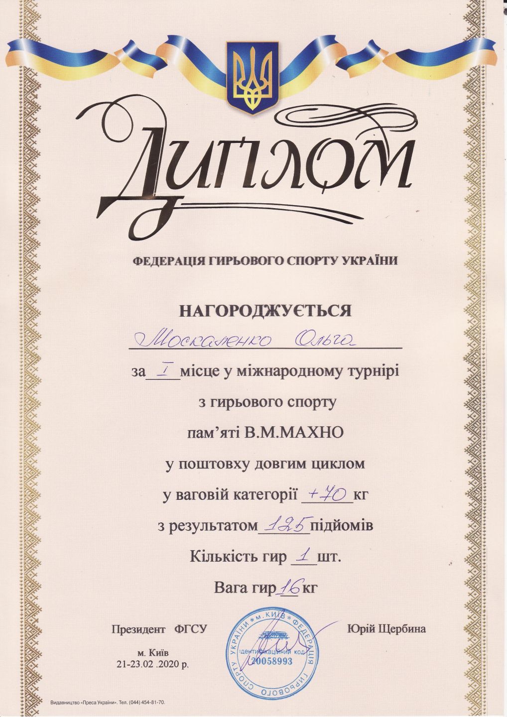 2. Міжнародний турнір з гирьового спорту серед чоловіків, жінок, ветеранів пам’яті В. М. Махна (м. Київ, 22-23.02.2020 р.): Москаленко Ольга – 31 ХТ (І місце у ваговій категорії 70+ кг, виконала НОРМАТИВ “МАЙСТЕР СПОРТУ УКРАЇНИ З ГИРЬОВОГО СПОРТУ”), Кубрак Сергій Іванович (І місце у ваговій категорії до 70 кг серед ветеранів) – ГРАМОТА 1ГРАМОТА 2