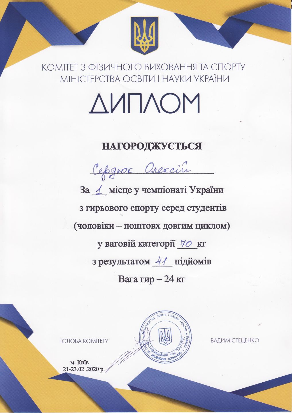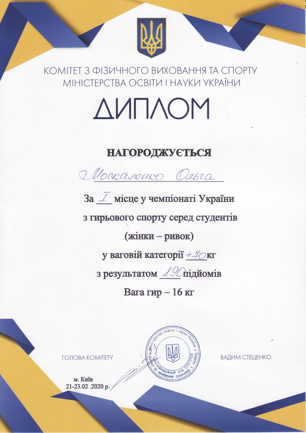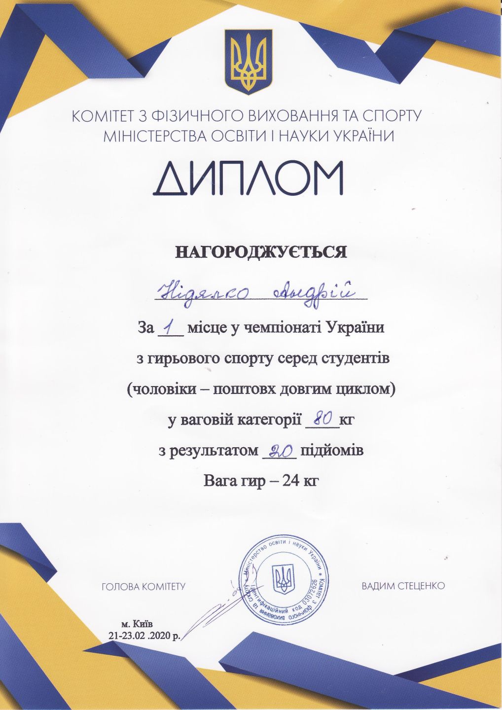 1. Чемпіонат України з гирьового спорту серед студентів (м. Київ, 21-23.02.2020 р.)Сердюк Олексій – 11 АІ (І місце у ваговій категорії до 70 кг), Нідялко Андрій – 31 ЦБ (І місце у ваговій категорії до 80 кг), Москаленко Ольга – 31 ХТ (І місце у ваговій категорії 70+ кг) – ГРАМОТА 1ГРАМОТА 2ГРАМОТА 3