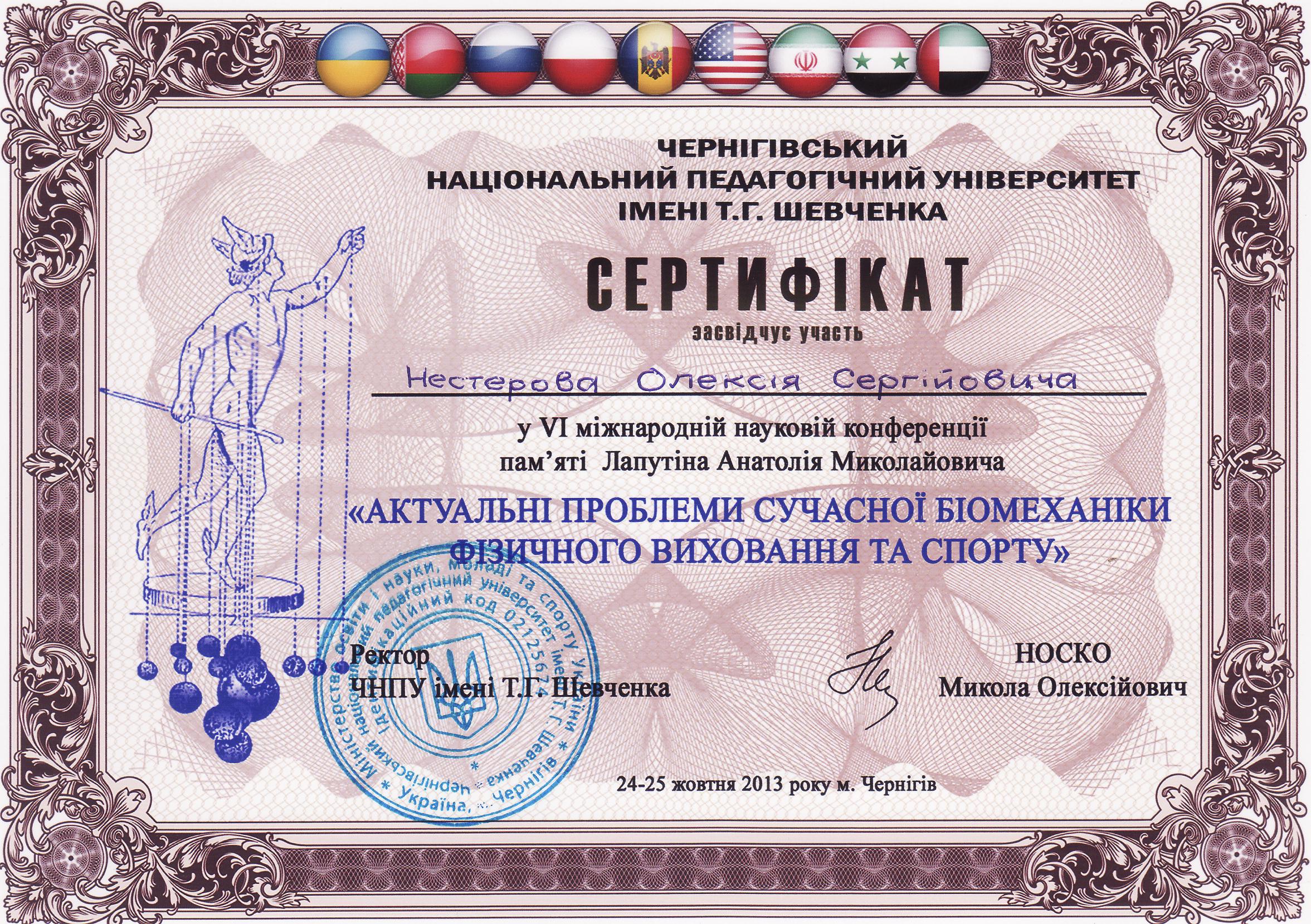 24-25 жовтня 2013 року, м. Чернігів, старший викладач Нестеров О.С. взяв участь у VI міжнародній науковій конференції пам’яті Лапутіна Анатолія Миколайовича “Актуальні проблеми сучасної біомеханіки фізичного виховання та спорту” та отримав сертифікат учасника.