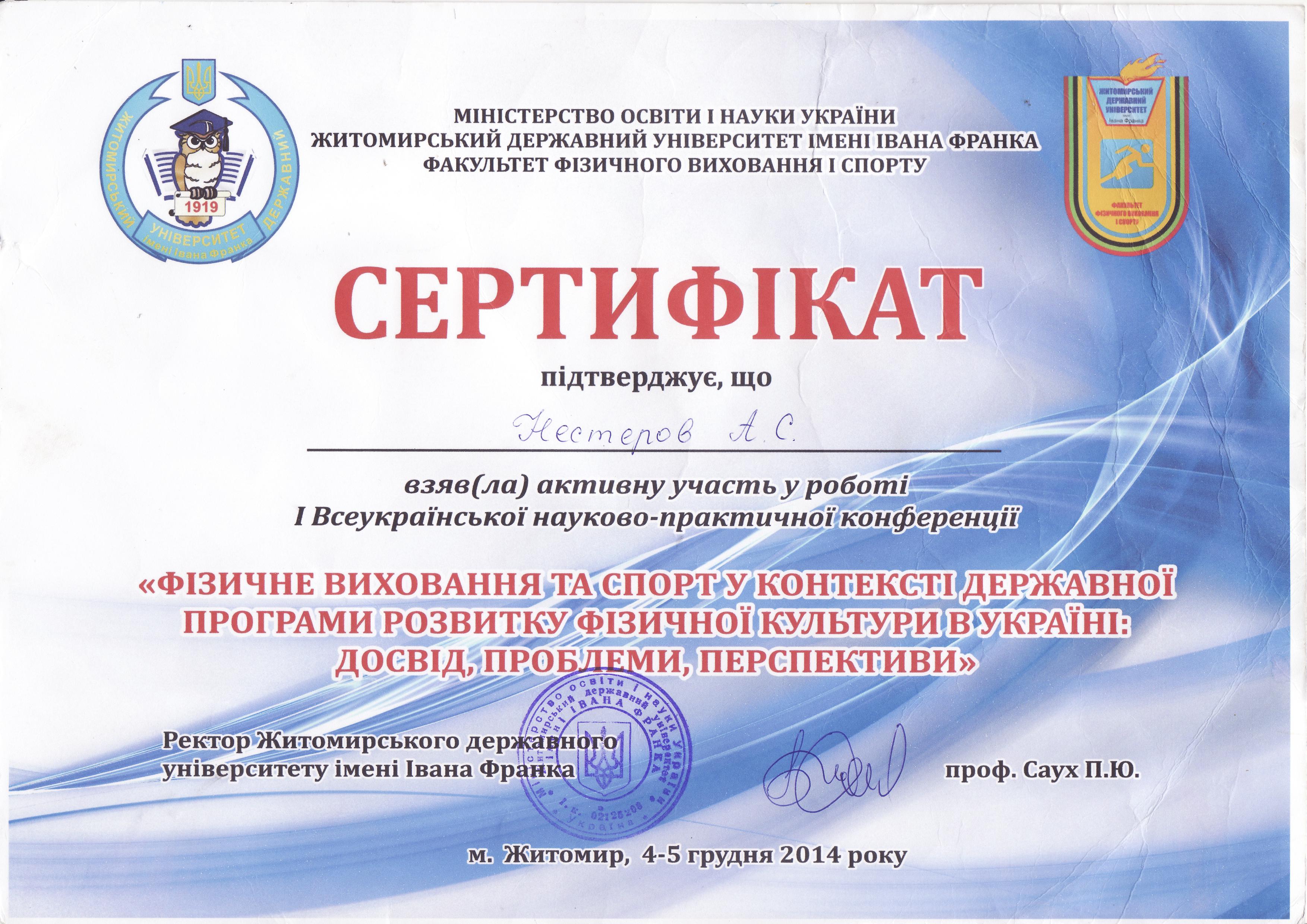 4-5 грудня 2014 року, м. Житомир, старший викладач Нестеров О.С. взяв участь у роботі І Всеукраїнської науково-практичної конференції “Фізичне виховання та спорт у контексті державної програми розвитку фізичної культури в Україні : досвід, проблеми, перспективи” та отримав сертифікат учасника.