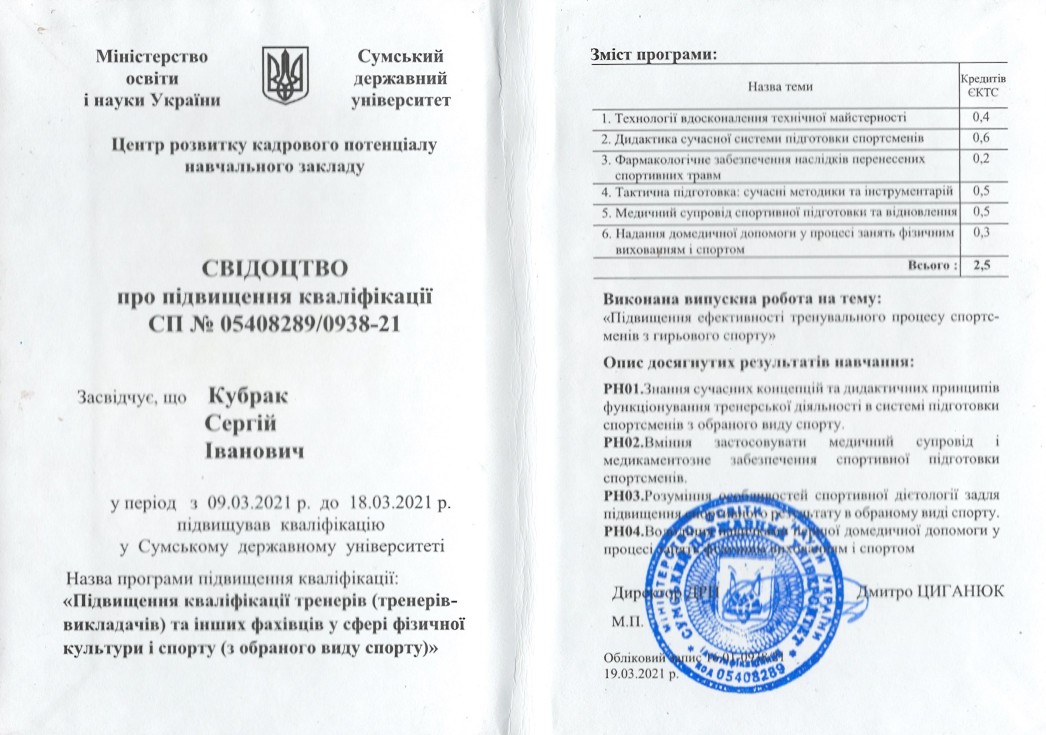 З 9 по 18 березня 2021 року старший викладач Кубрак С.І. підвищив кваліфікацію у Центрі розвитку кадрового потенціалу Сумського державного університету (назва програми підвищення кваліфікації “Підвищення кваліфікації тренерів (тренерів-викладачів) та інших фахівців у сфері фізичної культури і спорту (з обраного виду спорту)”, зміст програми – 2,5 кредити ЄКТС) і отримав свідоцтво про підвищення кваліфікації СП № 05408289/0938-21 від 19.03.2021 р. – ПІДТВЕРДЖЕННЯ