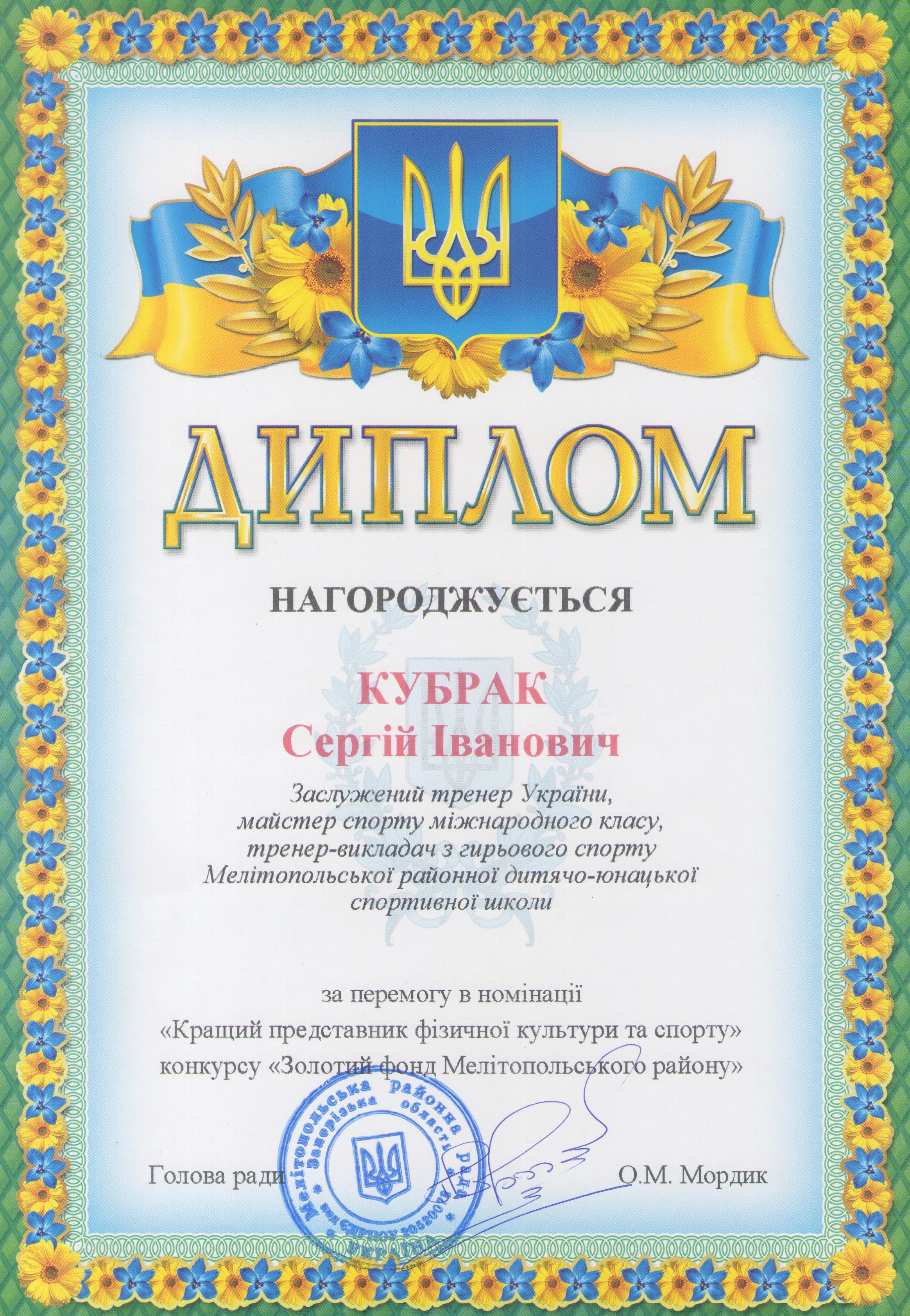 У вересні 2020 року старший викладач Кубрак С.І. від Мелітопольської районної ради отримав Диплом за перемогу в номінації “Кращий представник фізичної культури та спорту” конкурсу “Золотий фонд Мелітопольського району”