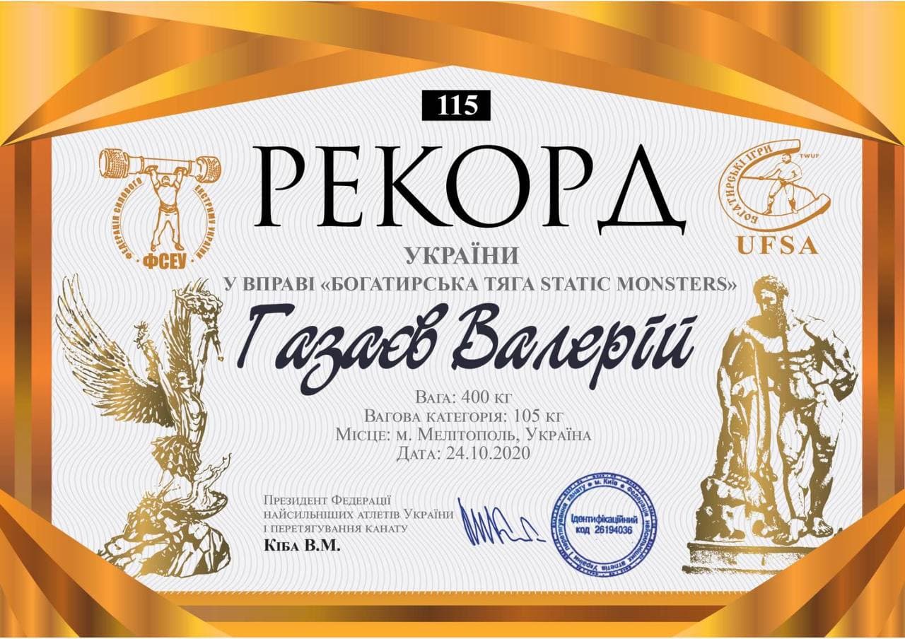 24 жовтня 2020 року на Чемпіонаті України по богатирському двоєборству Static Monsters (м. Мелітополь) завідувач кафедри Газаєв В.Н. установив 2 рекорди України (1. У сумі двоборства “Static Monsters”, вага – 535,2 кг, вагова категорія – до 105 кг, 2. У вправі “Богатирська тяга Static Monsters”, вага – 400 кг, вагова категорія – до 105 кг) – РЕКОРД 1, РЕКОРД 2