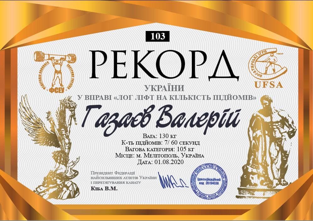 1 серпня 2020 року на Гран-прі України з богатирського багатоборства (м. Мелітополь) завідувач кафедри Газаєв В.Н. установив рекорд України у вправі “Лог ліфт на кількість підйомів” (вага – 130 кг, кількість підйомів – 7 за 60 секунд, вагова категорія до 105 кг).