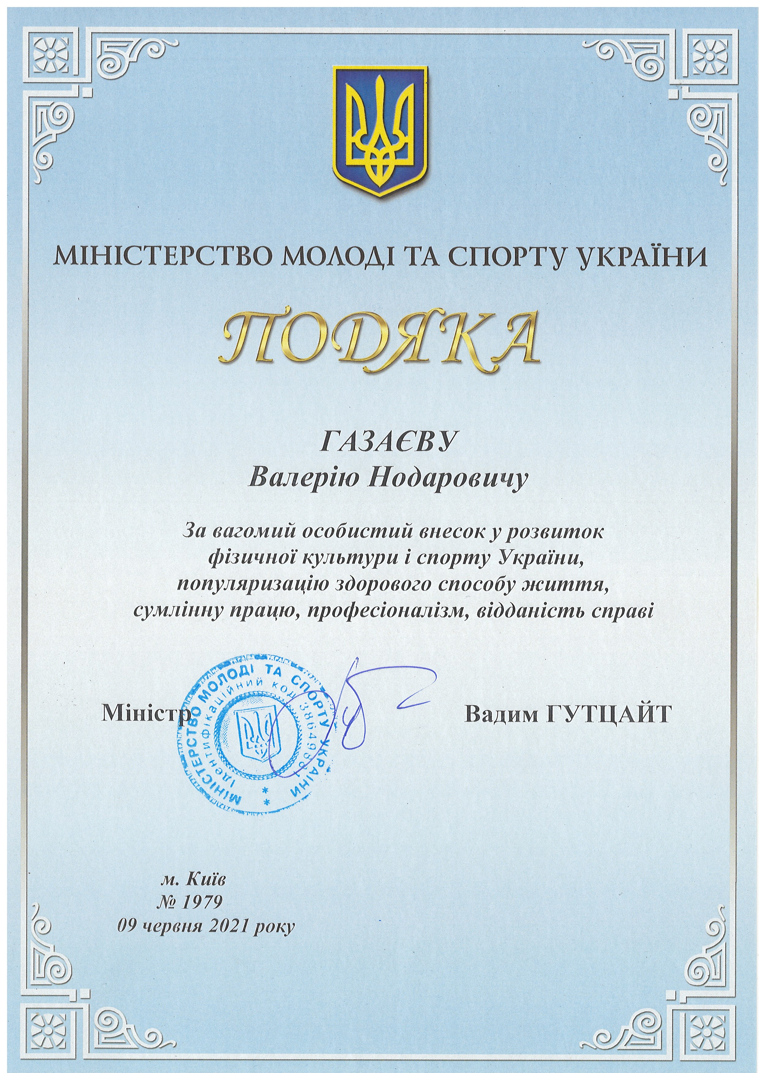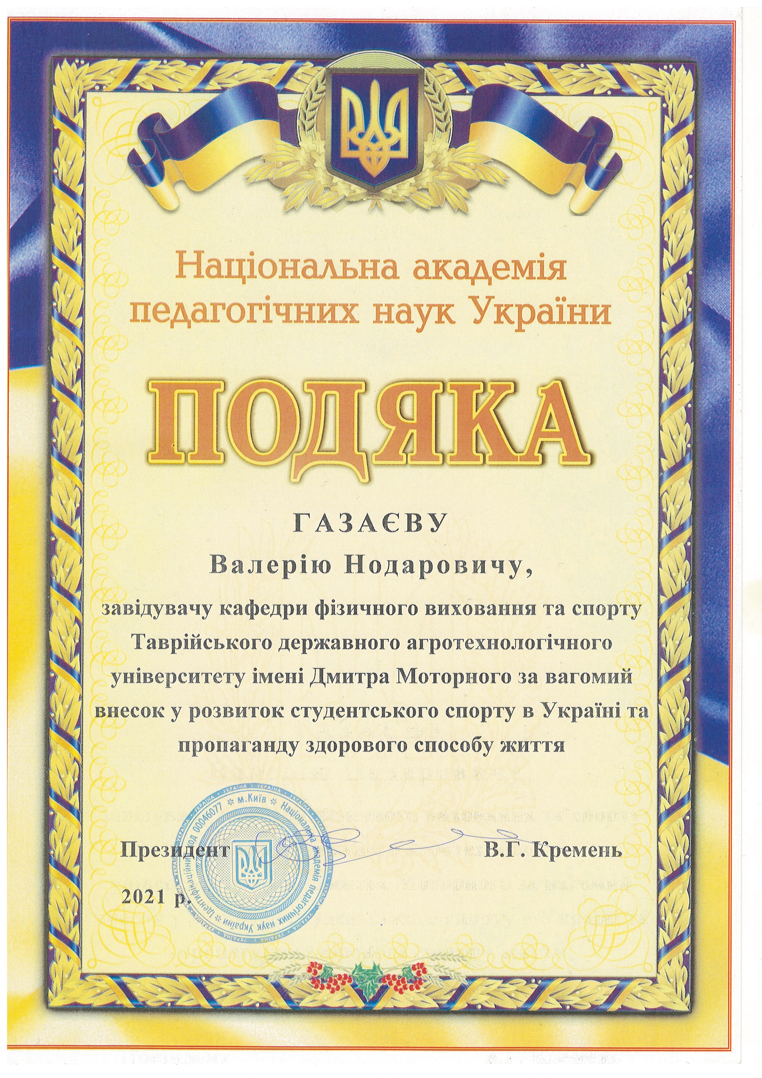 16 червня 2021 року завідувач кафедри Газаєв В.Н. на церемонії відкриття оновленої сучасної дитячо-юнацької спортивної школи №3 (м. Мелітополь) отримав особисто від міністра молоді та спорту України Гутцайта В.М. Подяку за вагомий особистий внесок у розвиток фізичної культури і спорту України, популяризацію здорового способу життя, сумлінну працю, професіоналізм, відданість справі від Міністерства молоді та спорту України