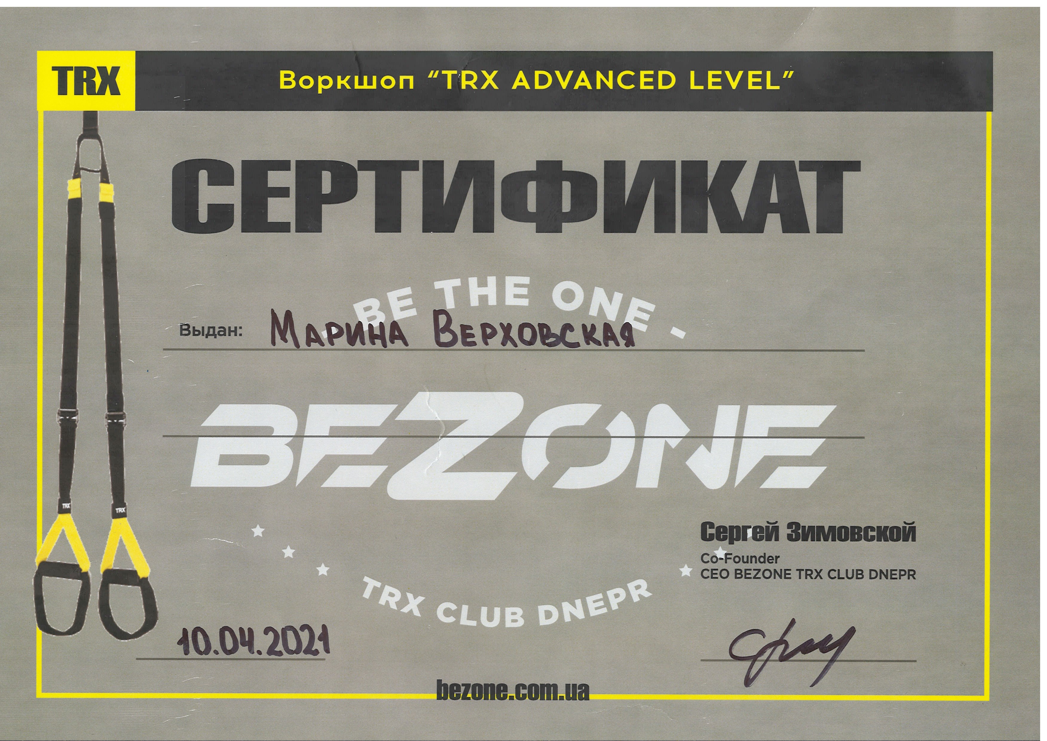 10 квітня 2021 року, м. Дніпро, к.пед.н., старший викладач Верховська М.В. отримала сертифікат про проходження курсу з TRX (воркшоп “TRX Advanced Level”)
