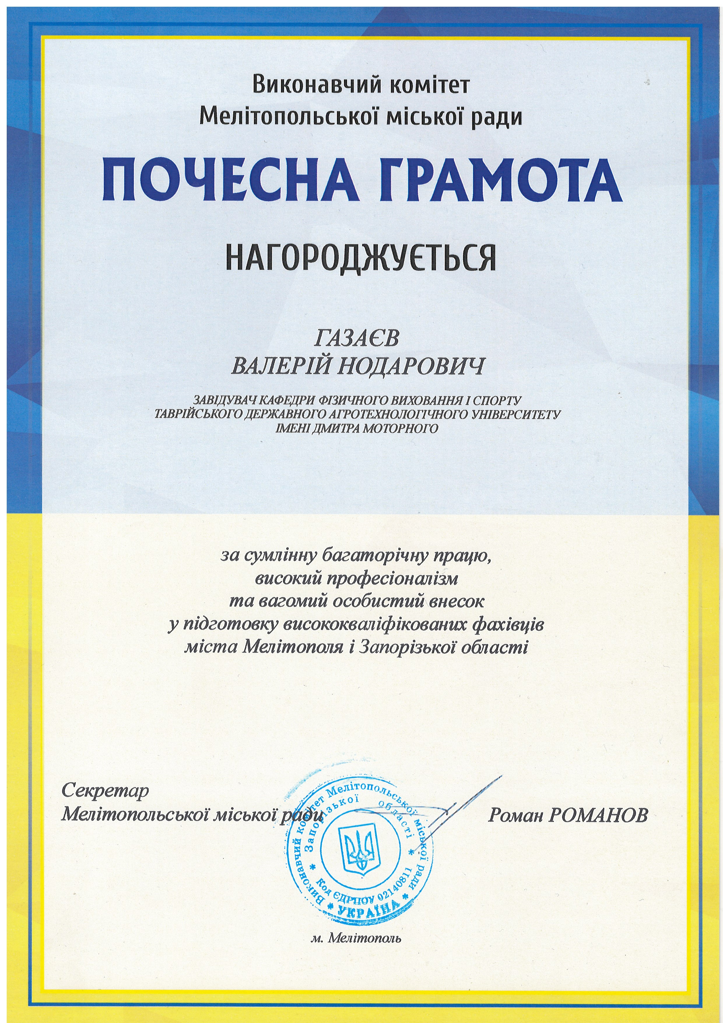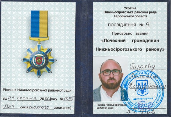 21 серпня 2020 року рішенням Нижньосірогозької районної ради №1095 (XLVII сесія 7-го скликання) завідувачу кафедри Газаєву В.Н. присвоєно звання “Почесний громадянин Нижньосірогозького району” (посвідчення №9) – НОВИНА