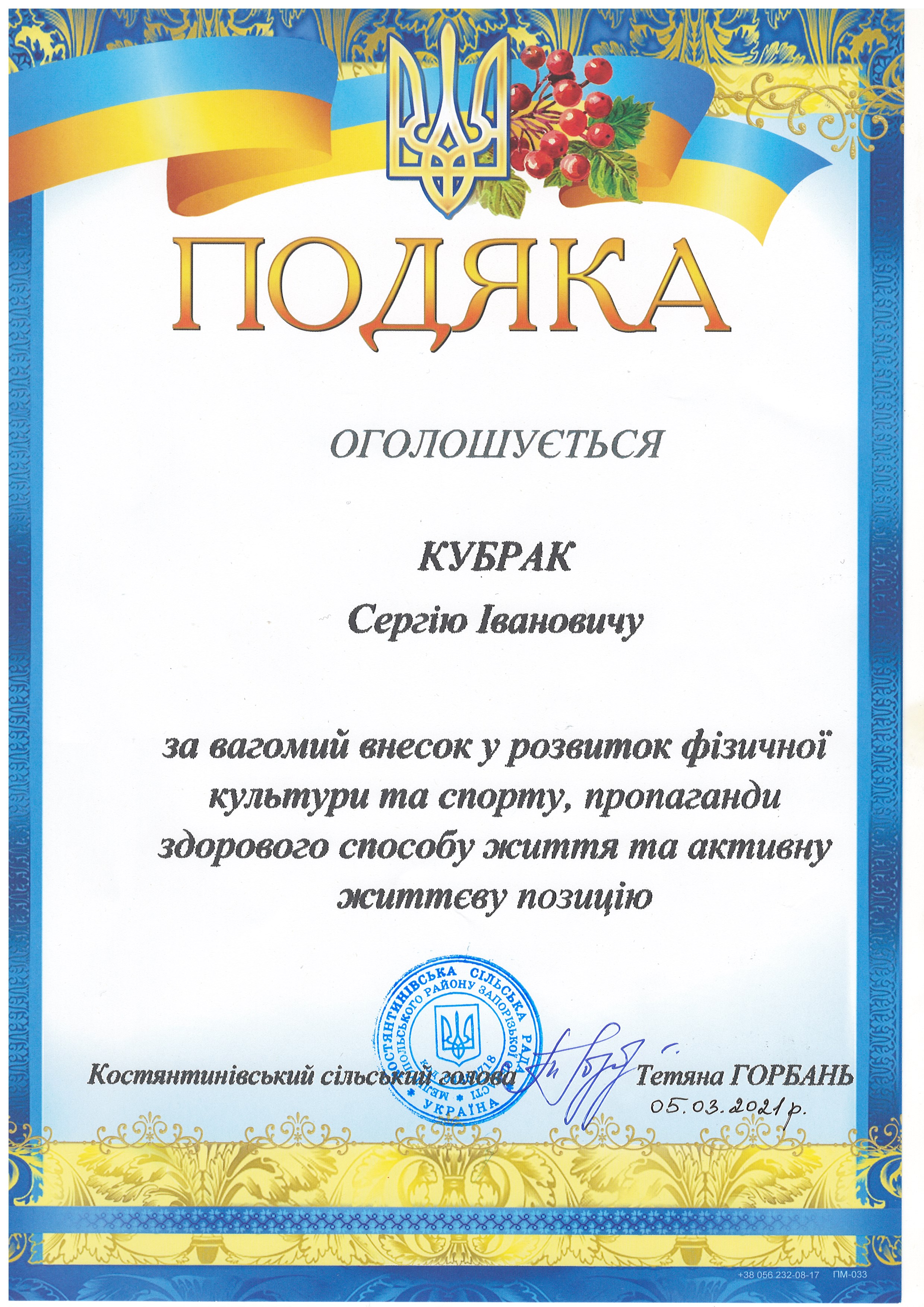 5 березня 2021 року старший викладач Кубрак С.І. отримав від Костянтинівської міської ради Мелітопольського району Запорізької області Подяку за вагомий внесок у розвиток фізичної культури та спорту, пропаганди здорового способу життя та активну життєву позицію