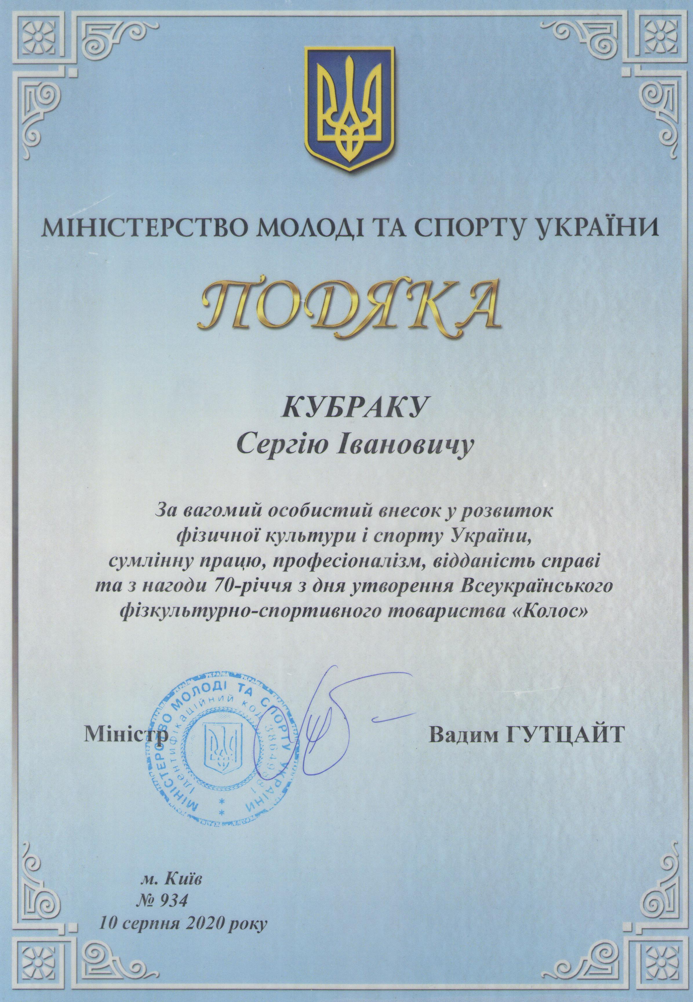 10 серпня 2020 року старший викладач Кубрак С.І. отримав Подяку Міністерства молоді та спорту України за вагомий особистий внесок у розвиток фізичної культури і спорту України, сумлінну працю, професіоналізм, відданість справі та з нагоди 70-річчя з дня утворення Всеукраїнського фізкультурно-спортивного товариства “Колос”