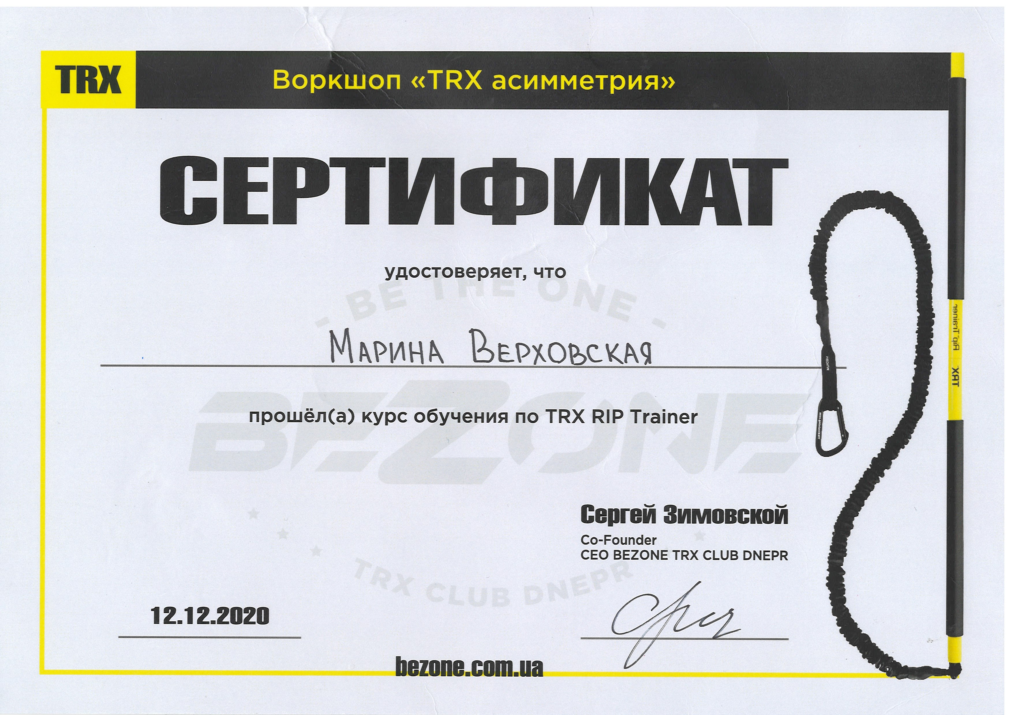 12 грудня 2020 року, м. Дніпро, к.пед.н., старший викладач Верховська М.В. отримала сертифікат про те, що вона пройшла курс навчання по TRX RIP Trainer (воркшоп “TRX асиметрія”)