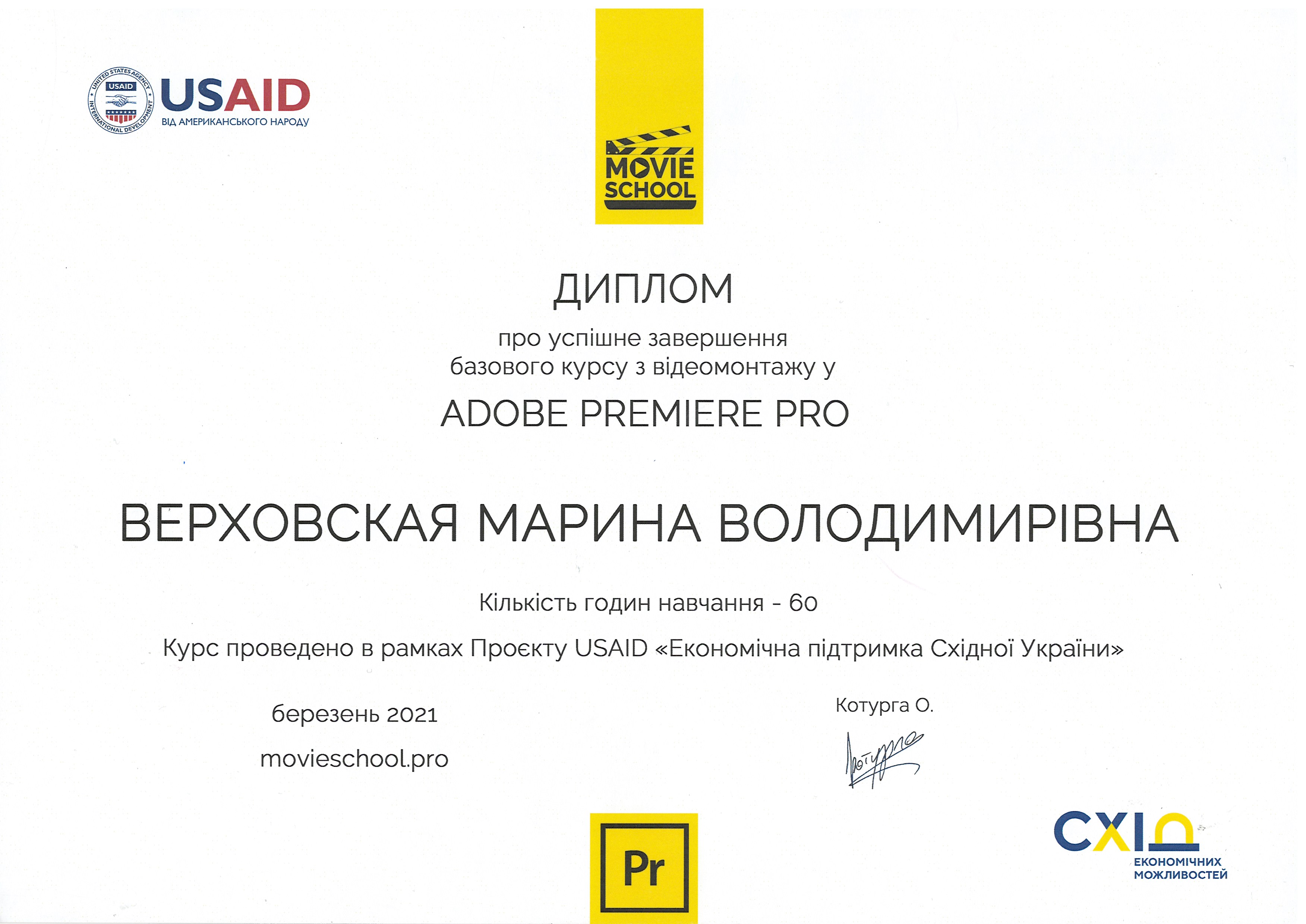 В березні 2021 року, м. Мелітополь, к.пед.н., старший викладач Верховська М.В. отримала Диплом про успішне завершення базового курсу з відеомонтажу у Adobe Premier Pro (кількість годин навчання – 60, курс проведено в рамках проєкту USAID “Економічна підтримка Східної України”).