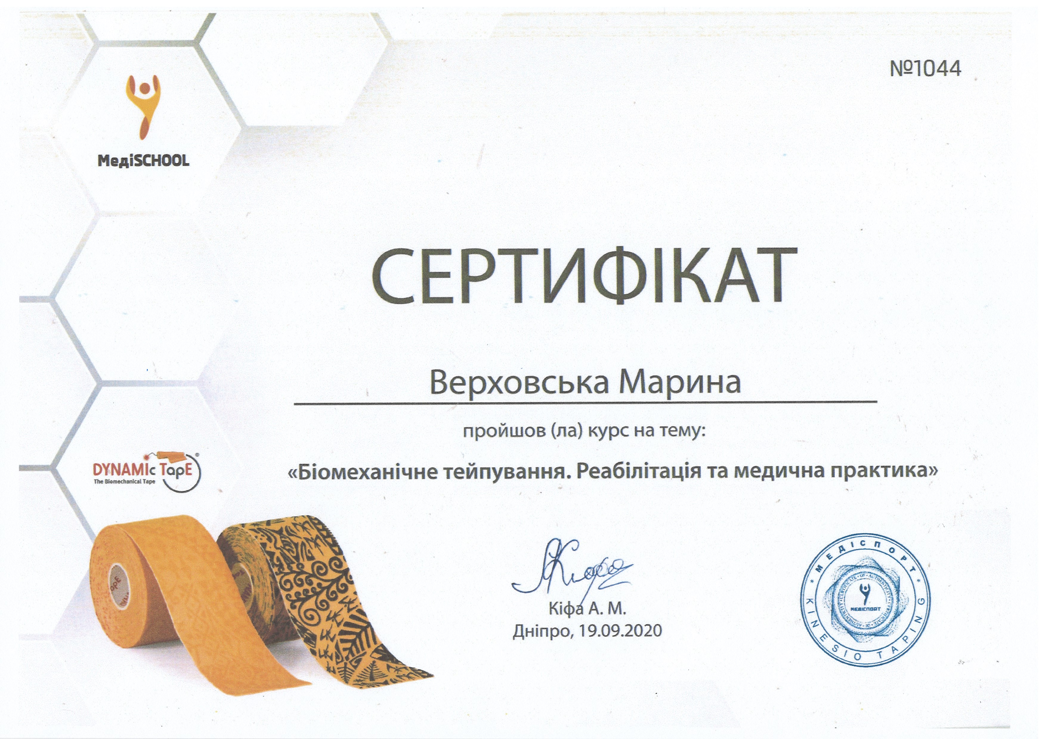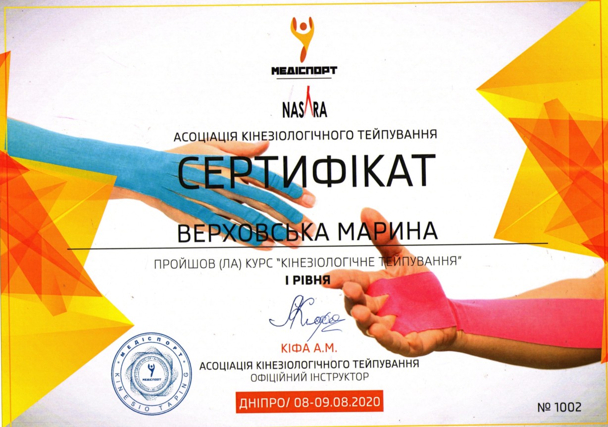 19 вересня 2020 року, м. Дніпро, к.пед.н., старший викладач Верховська М.В. отримала сертифікат №1044 про проходження курсу на тему: “Біомеханічне тейпування. Реабілітація та медична практика”