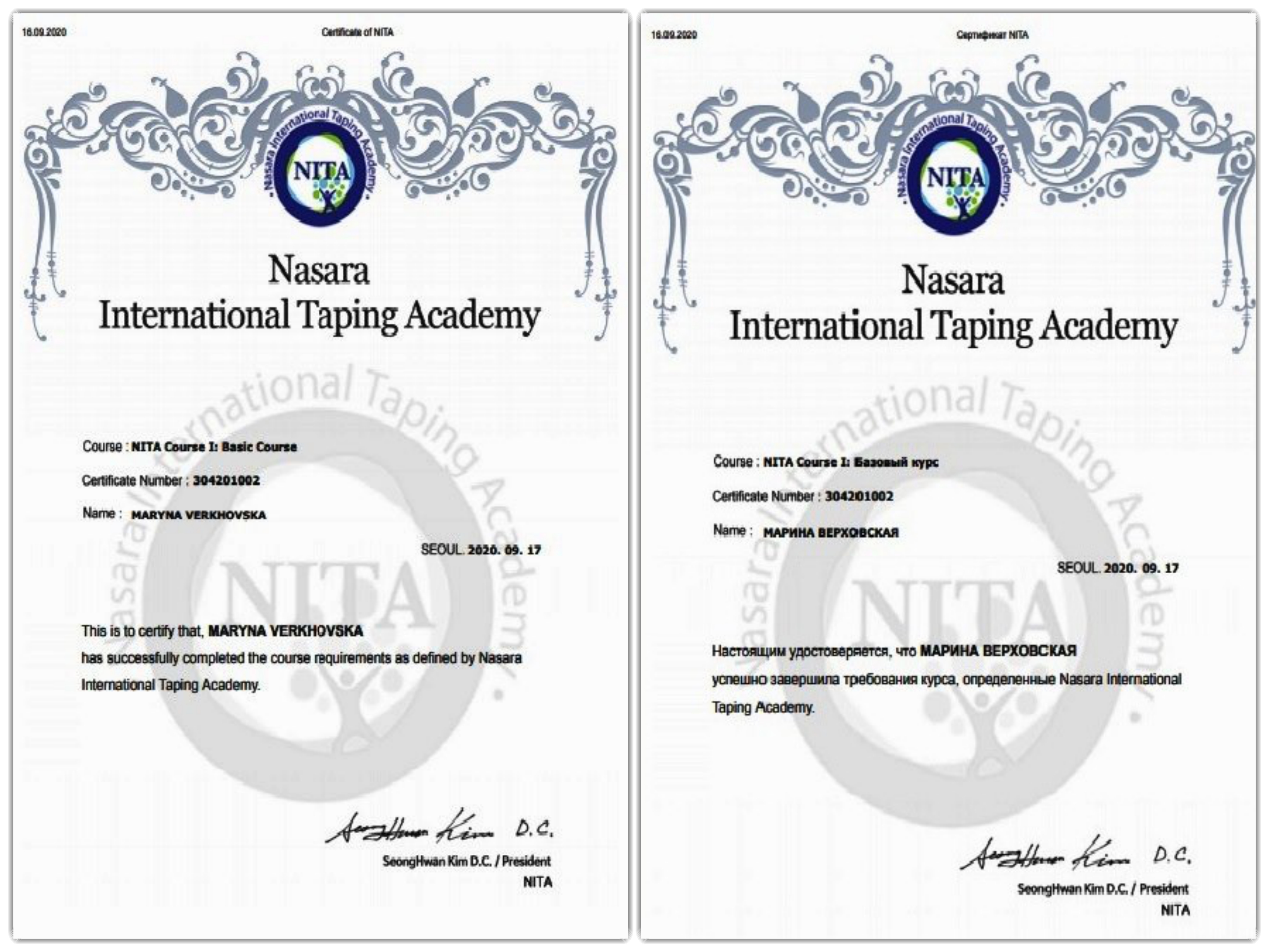 17 вересня 2020 року, м. Сеул (Південна Корея), к.пед.н., старший викладач Верховська М.В. отримала міжнародний сертифікат NITA, Міжнародної академії тейпування NASARA (Nasara International Taping Academy) про те, що вона пройшла базовий курс з кінезіологічного тейпування.