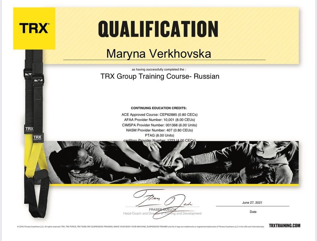 27 червня 2021 року к.пед.н., старший викладач Верховська М.В. отримала міжнародний сертифікат про проходження курсу про отримання кваліфікації тренера з групових тренувань на TRX-петлях (TRX Group Training Course – Russian)