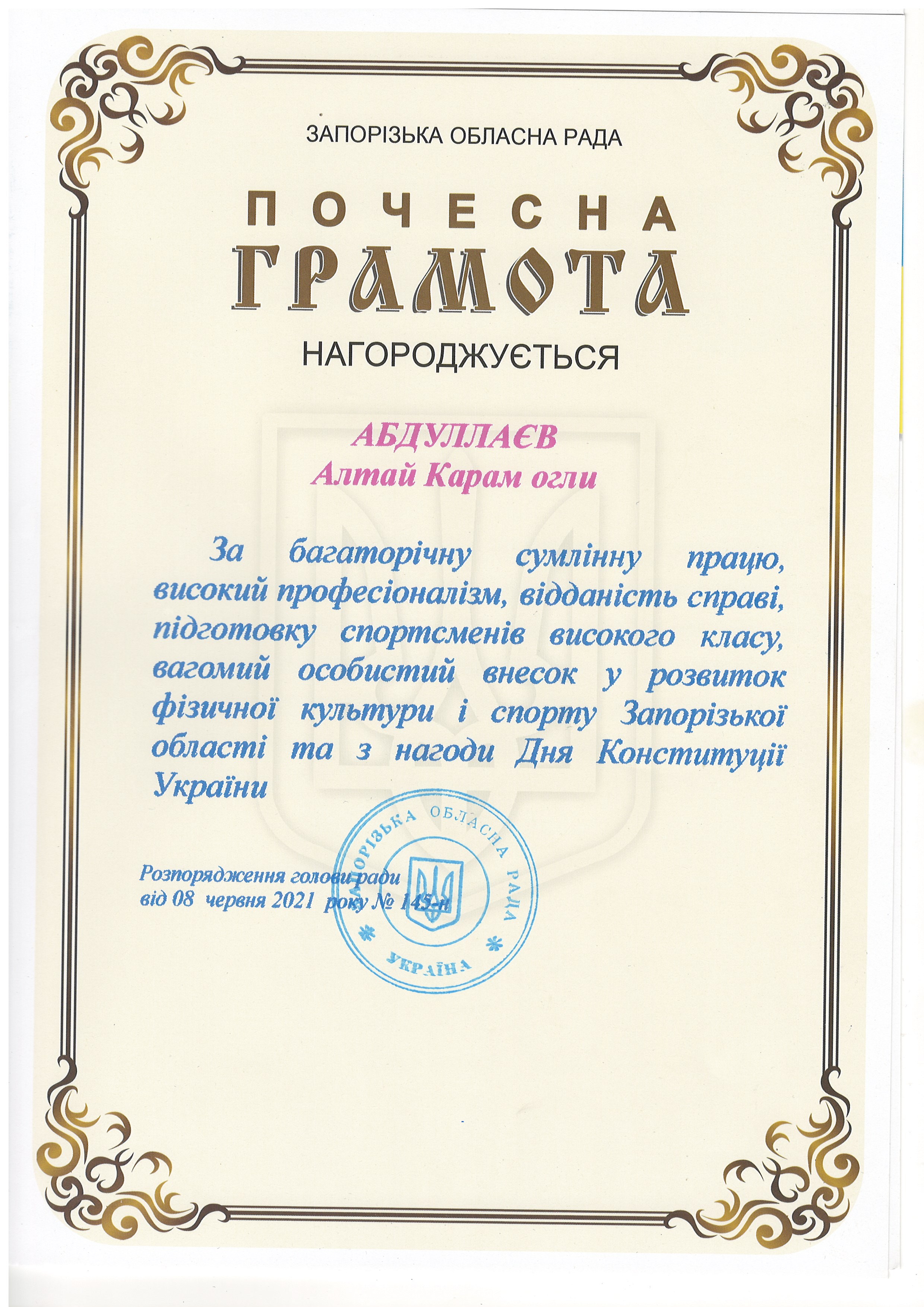 8 червня 2021 року старший викладач Абдуллаєв А.К. отримав від Запорізької обласної ради Почесну грамоту за багаторічну сумлінну працю, високий професіоналізм, відданість справі, підготовку спортсменів високого класу, вагомий особистий внесок у розвиток фізичної культури і спорту Запорізької області та з нагоди Дня Конституції України