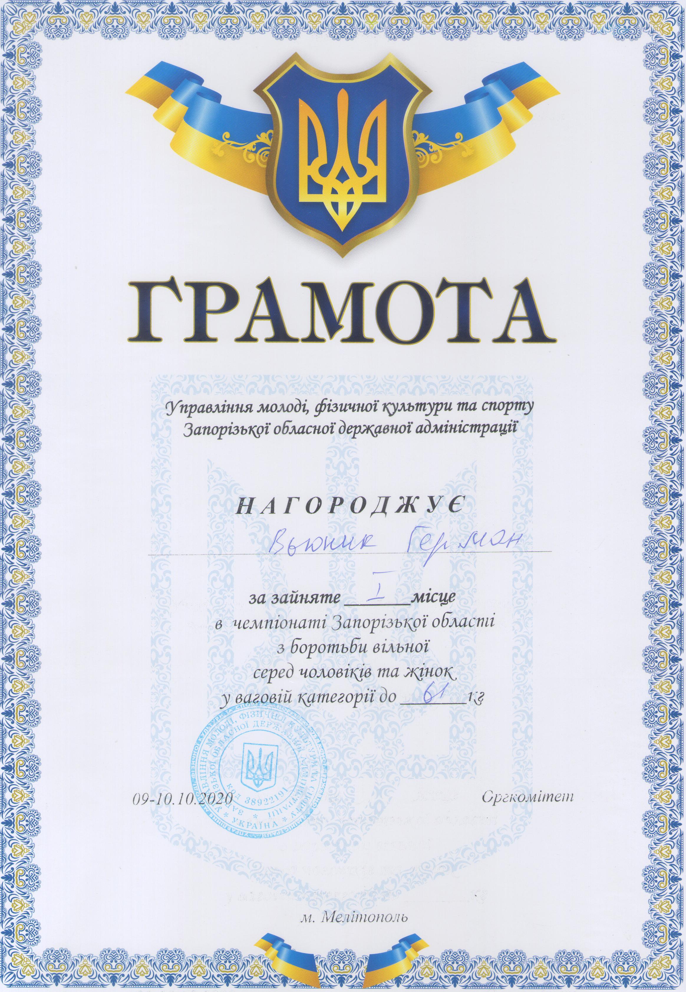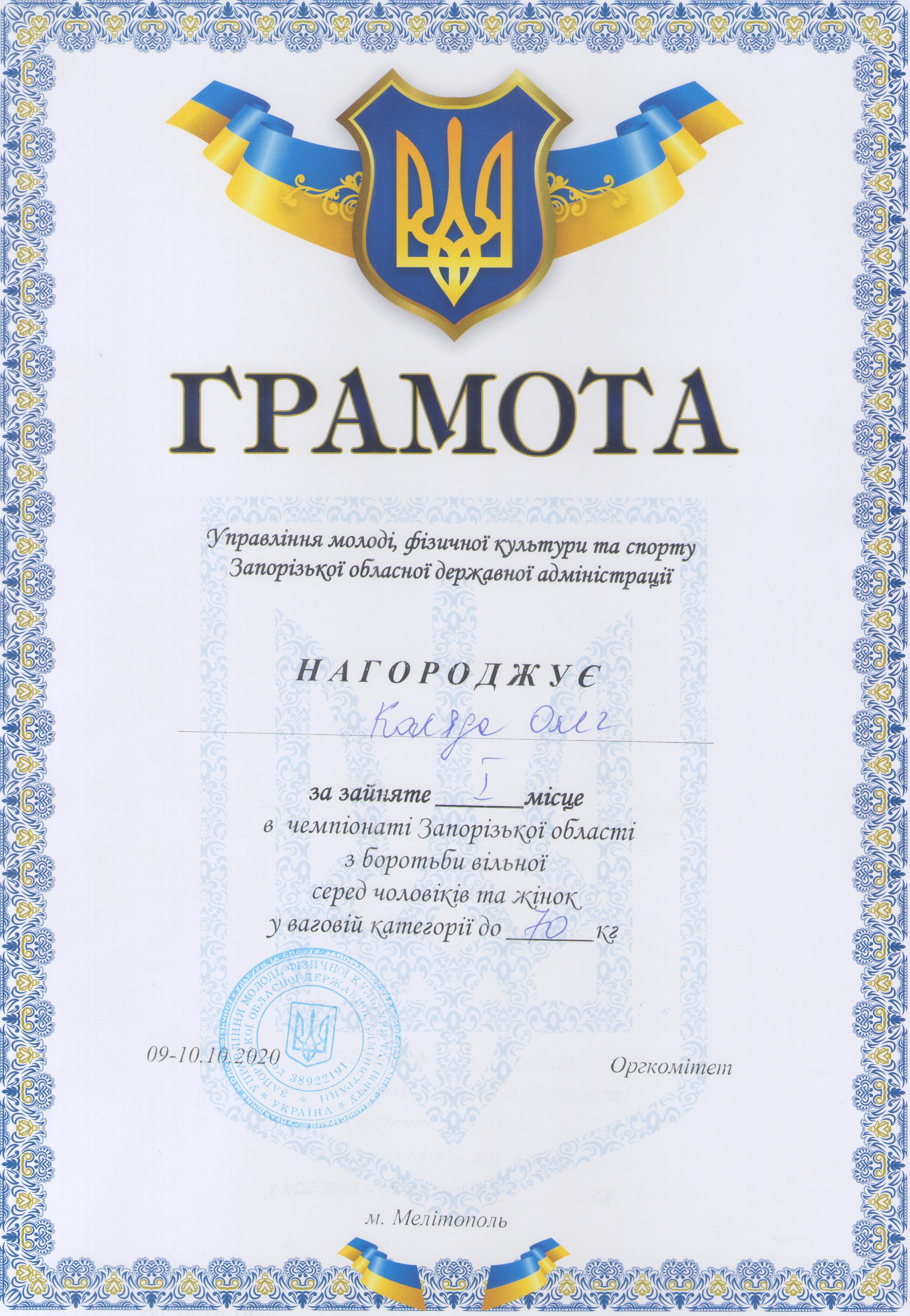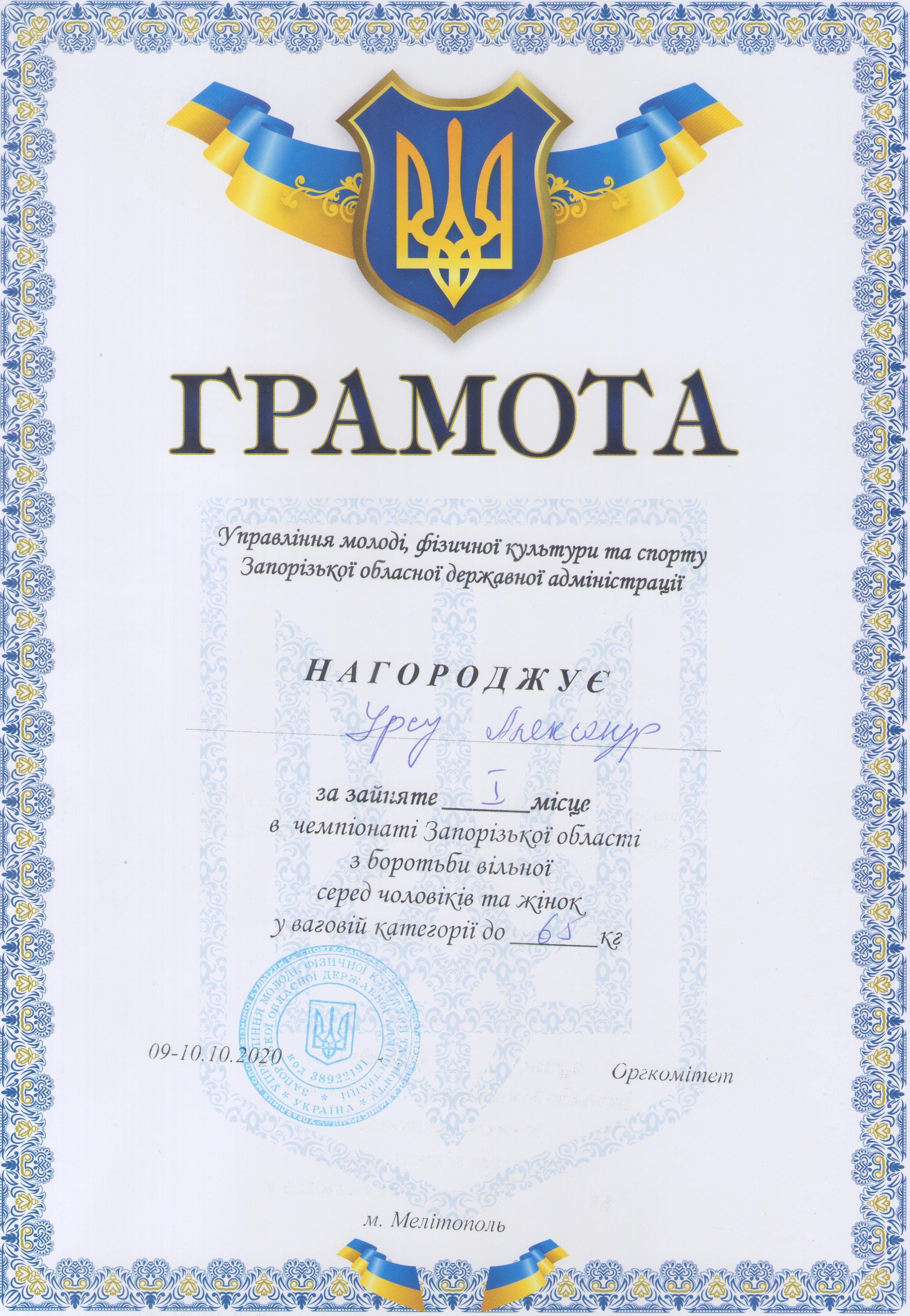 3.Чемпіонат Запорізької області з вільної боротьби серед чоловіків та жінок (м. Мелітополь, 09-10.10.2020 р.): Дехтяренко Руслан – 41 ЕЕ (І місце у ваговій категорії до 86 кг), Урсу Олександр – 12 МБАІ (І місце у ваговій категорії до 65 кг), В’юник Герман – 31 АГ (І місце у ваговій категорії до 61 кг), Коляда Олег – 13 САІ (І місце у ваговій категорії до 70 кг), Білошицький Іван – 41 ГМ (І місце у ваговій категорії до 125 кг), Копоть В’ячеслав – 22 СЕЕ (II місце у вагові категорії до 79 кг), Мирошниченко Артур – 11 САГ (II місце у ваговій категорії до 74 кг), Касап Іван – 21 СЕЕ (III місце у ваговій категорії до 74 кг) – ГРАМОТА 1, ГРАМОТА 2, ГРАМОТА 3, ГРАМОТА 4, ГРАМОТА 5, ГРАМОТА 6, ГРАМОТА 7, ГРАМОТА 8