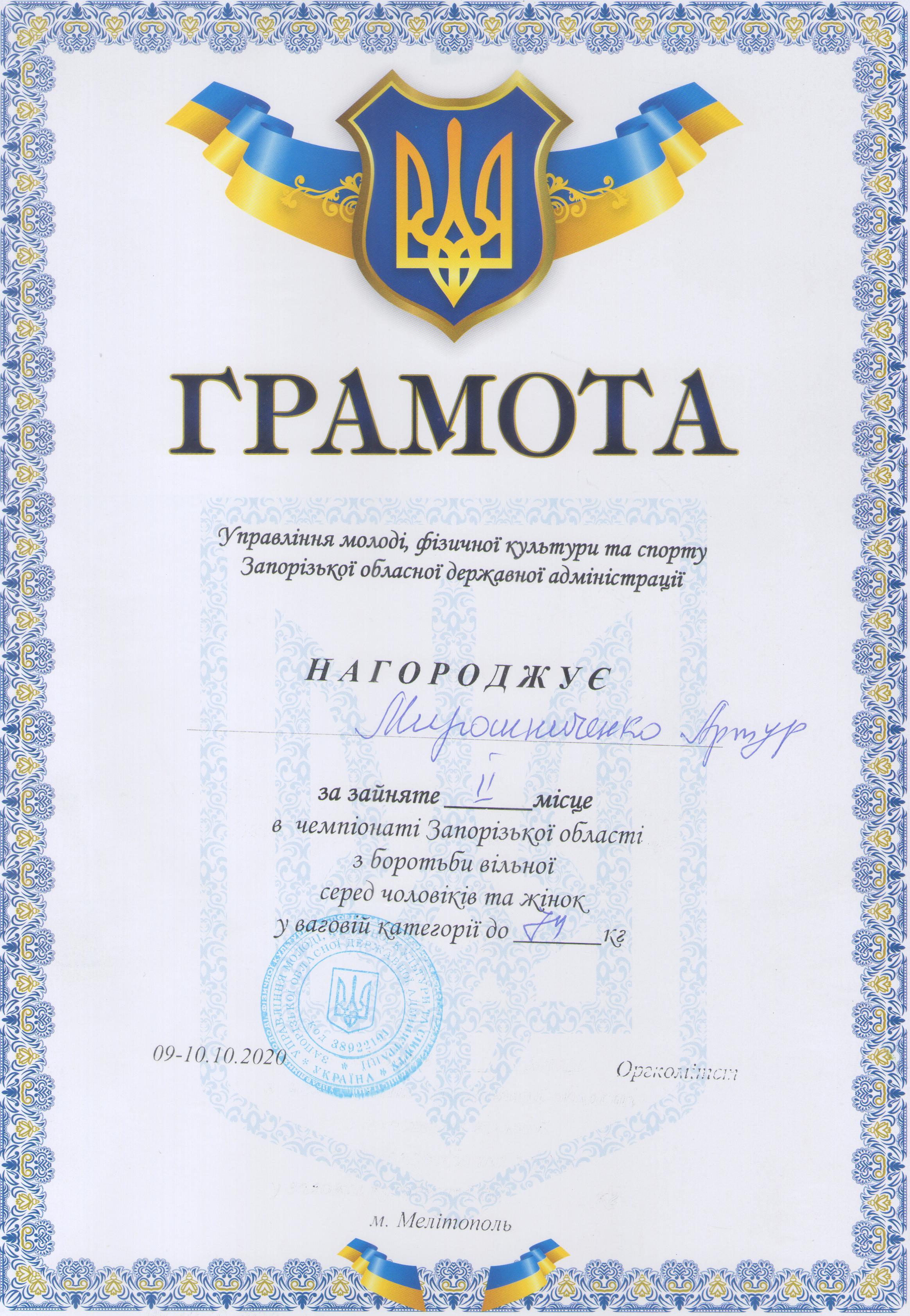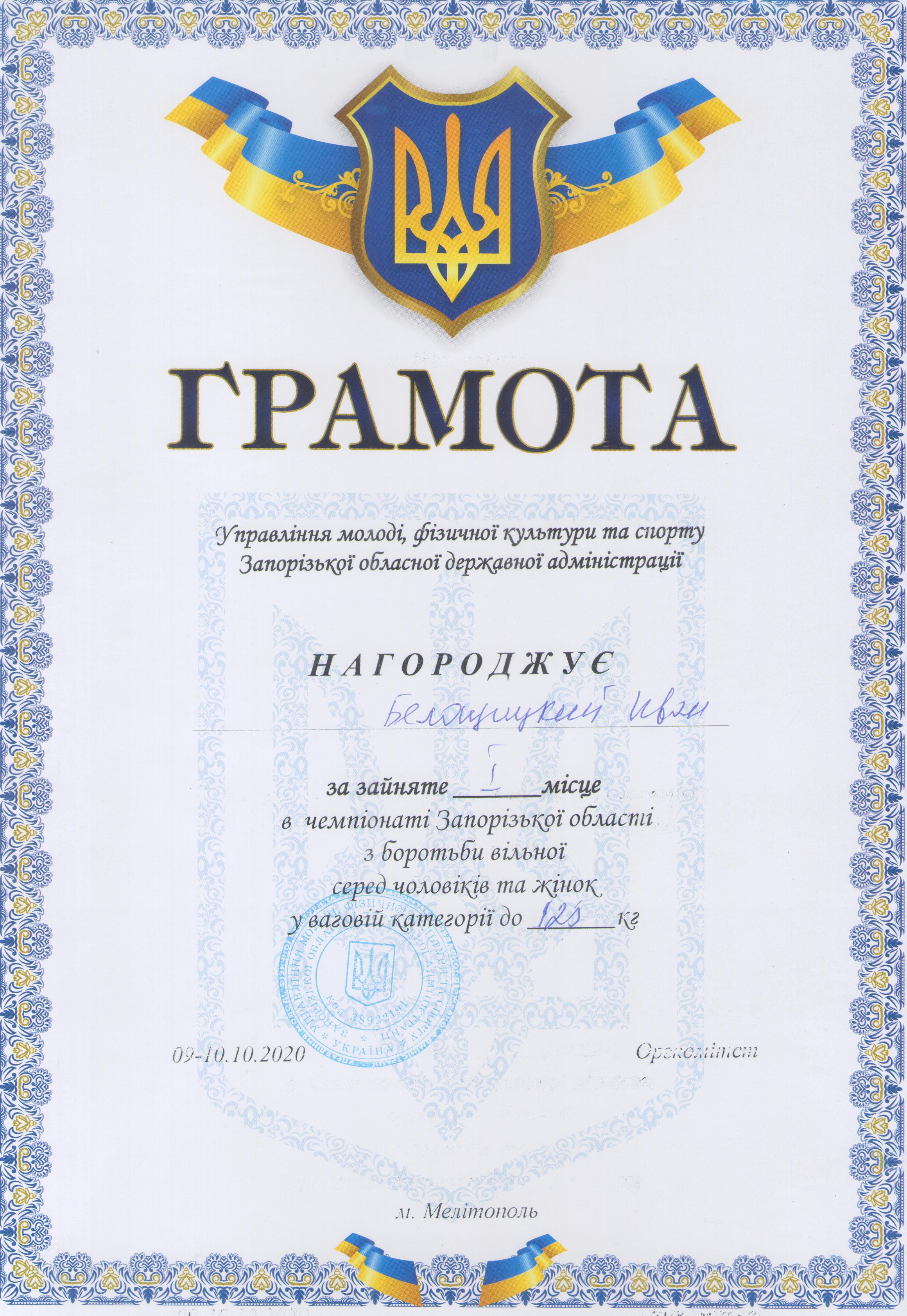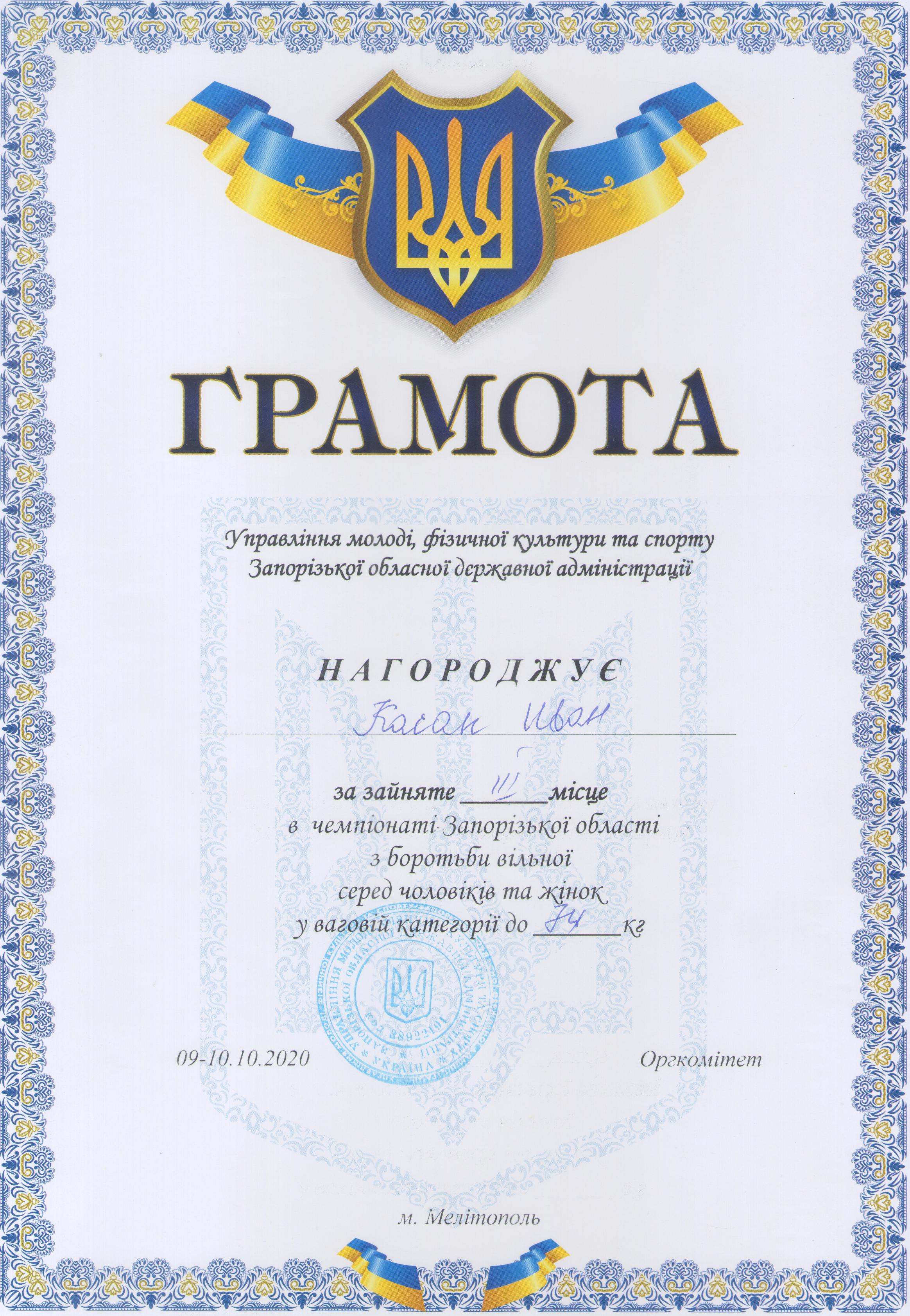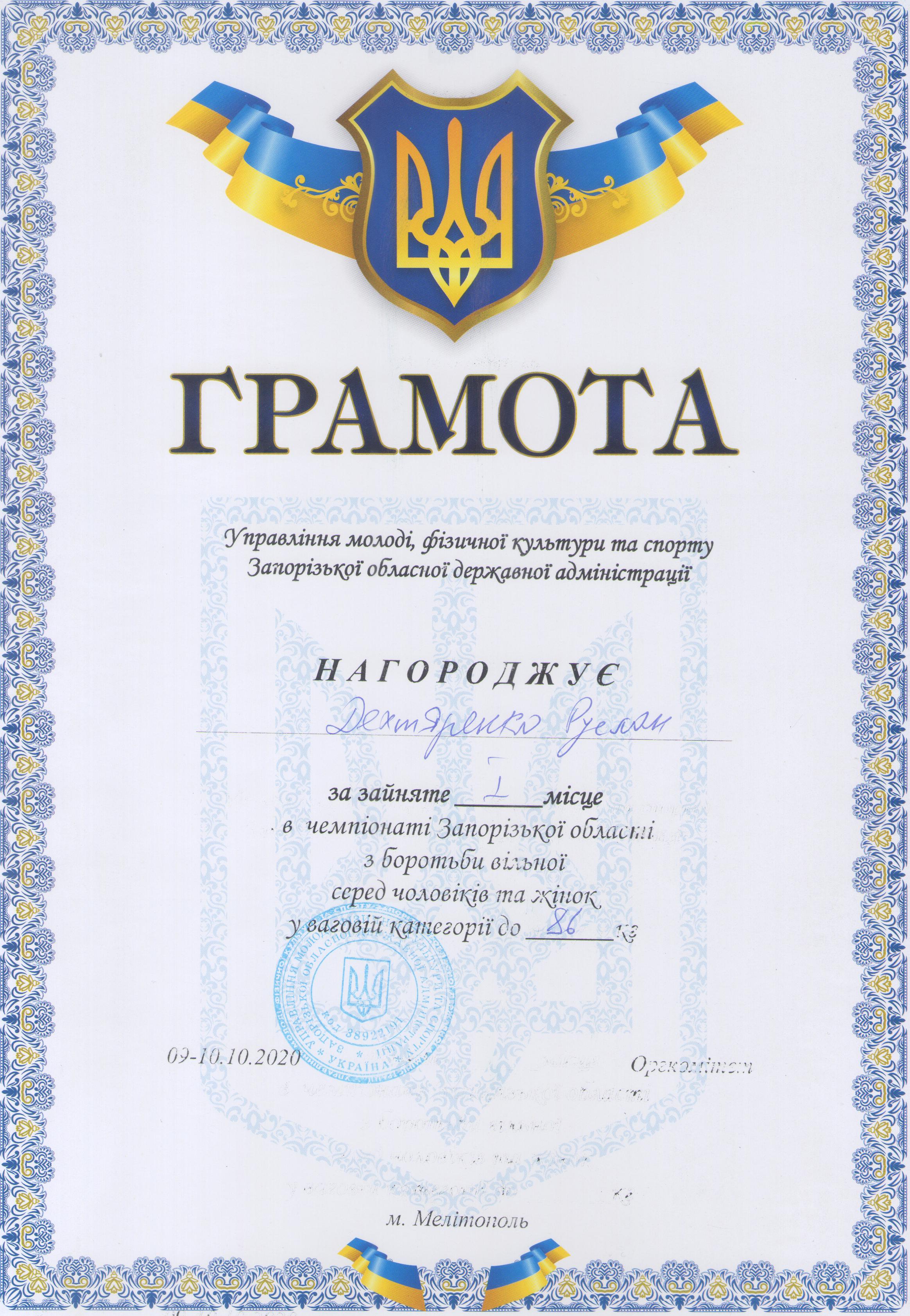 3.Чемпіонат Запорізької області з вільної боротьби серед чоловіків та жінок (м. Мелітополь, 09-10.10.2020 р.): Дехтяренко Руслан – 41 ЕЕ (І місце у ваговій категорії до 86 кг), Урсу Олександр – 12 МБАІ (І місце у ваговій категорії до 65 кг), В’юник Герман – 31 АГ (І місце у ваговій категорії до 61 кг), Коляда Олег – 13 САІ (І місце у ваговій категорії до 70 кг), Білошицький Іван – 41 ГМ (І місце у ваговій категорії до 125 кг), Копоть В’ячеслав – 22 СЕЕ (II місце у вагові категорії до 79 кг), Мирошниченко Артур – 11 САГ (II місце у ваговій категорії до 74 кг), Касап Іван – 21 СЕЕ (III місце у ваговій категорії до 74 кг) – ГРАМОТА 1, ГРАМОТА 2, ГРАМОТА 3, ГРАМОТА 4, ГРАМОТА 5, ГРАМОТА 6, ГРАМОТА 7, ГРАМОТА 8