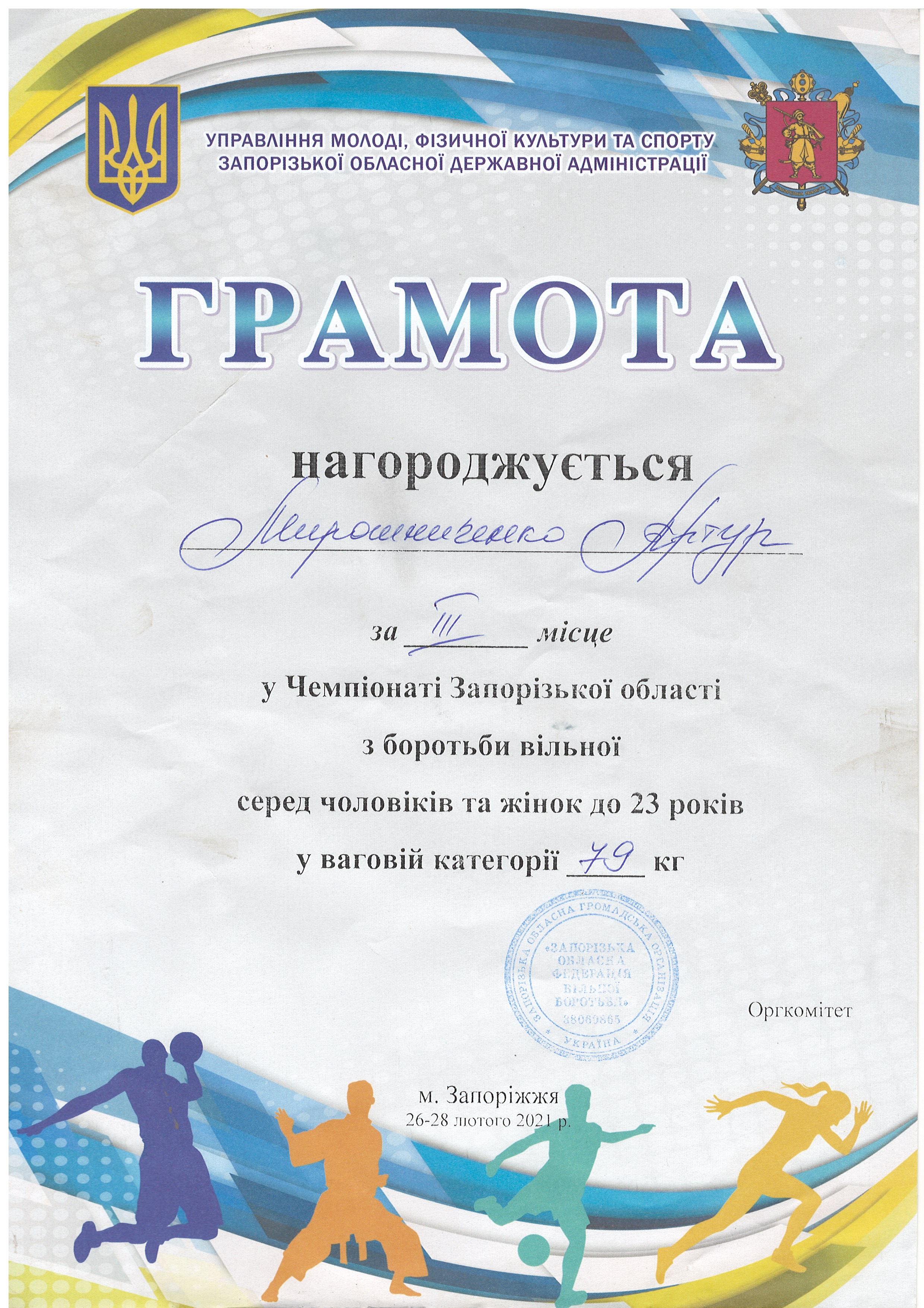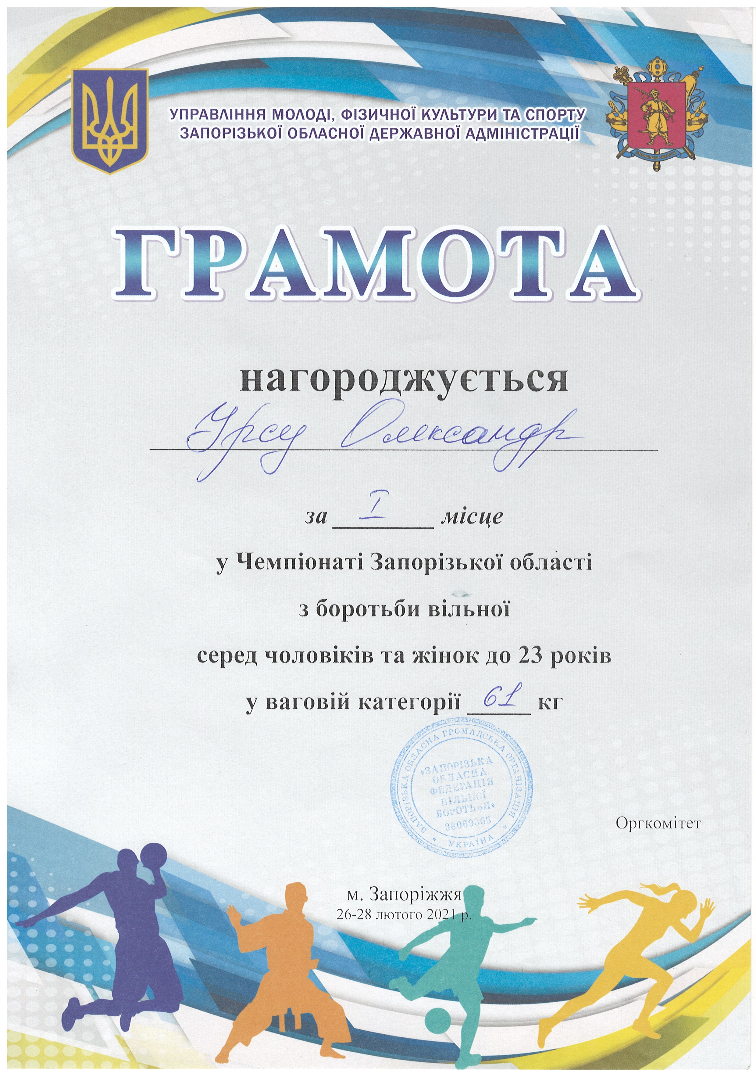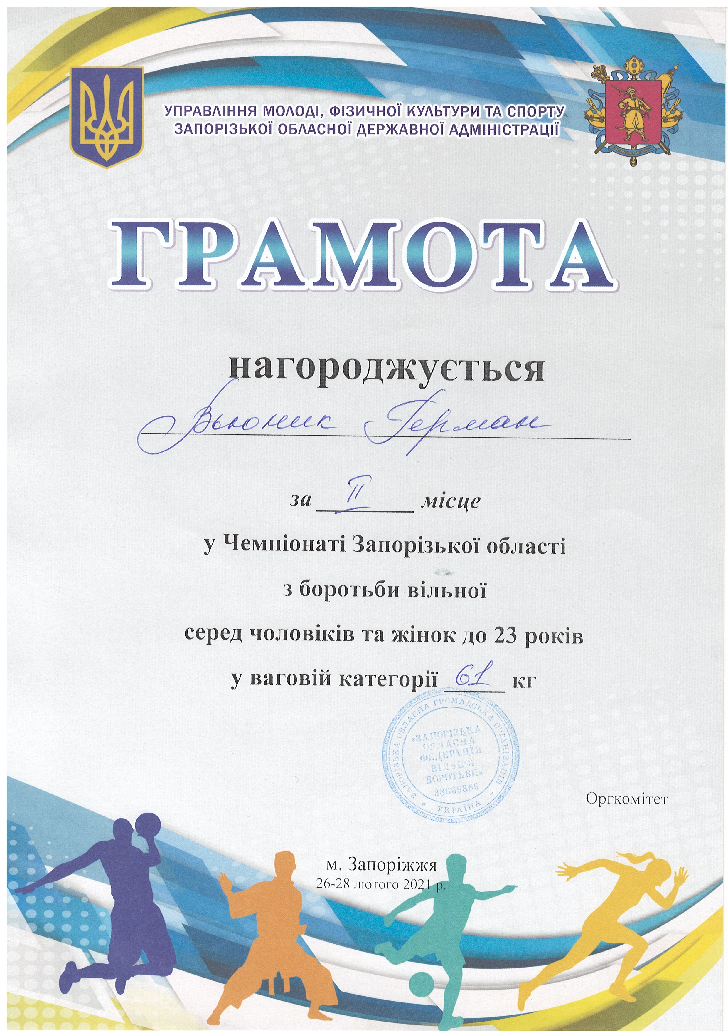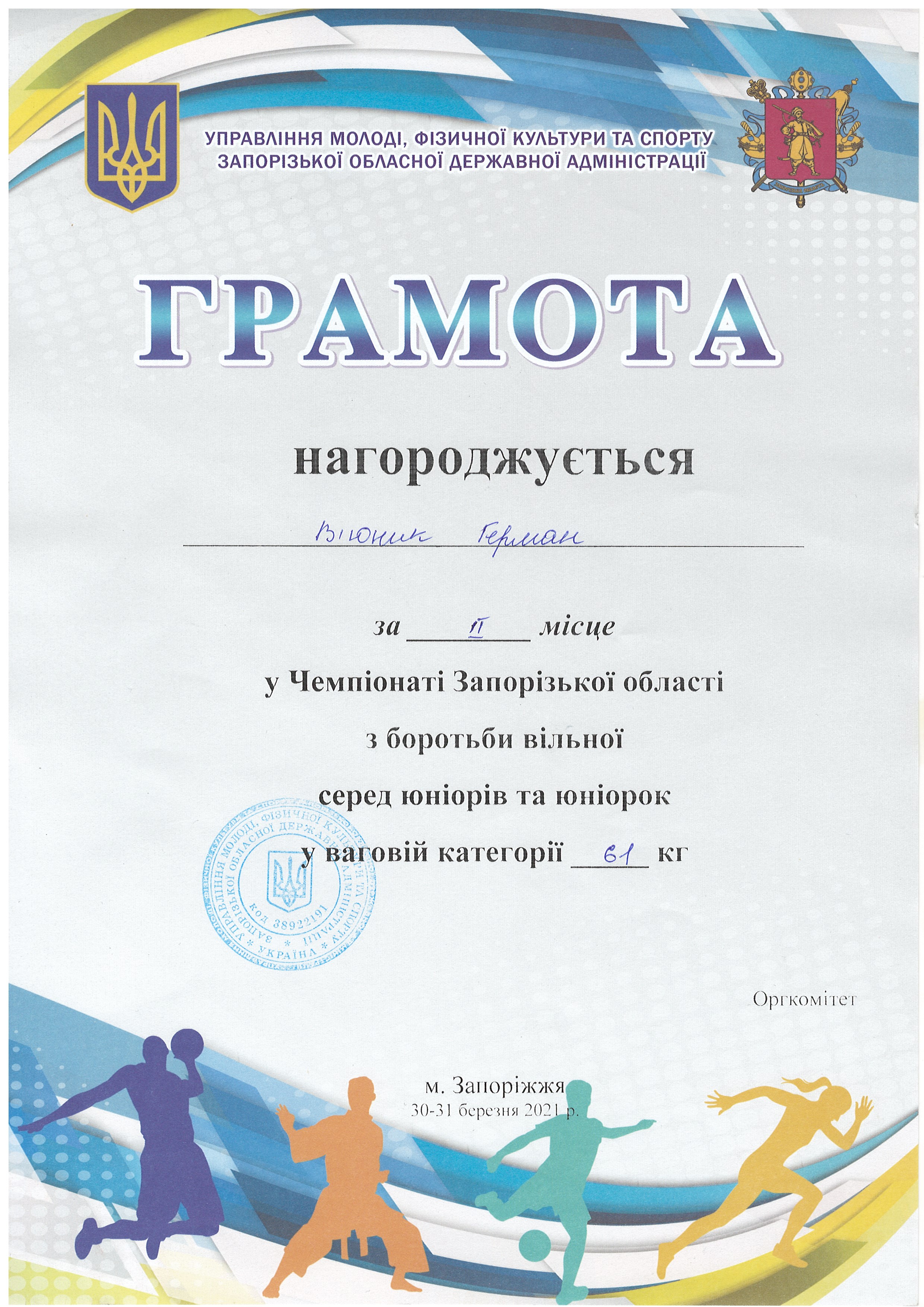 1. Чемпіонат Запорізької з боротьби вільної серед юніорів та юніорок (м. Запоріжжя, 30-31.03.2021 р.): В’юник Герман – 31 АГ (II місце у ваговій категорії до 61 кг) – ГРАМОТА