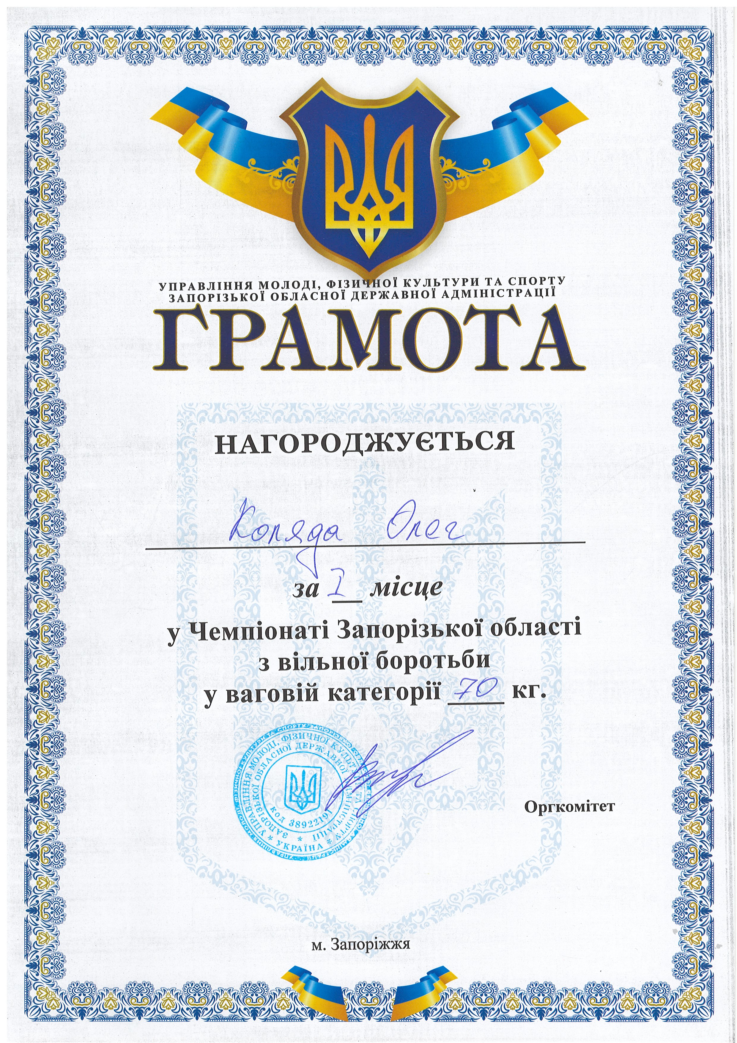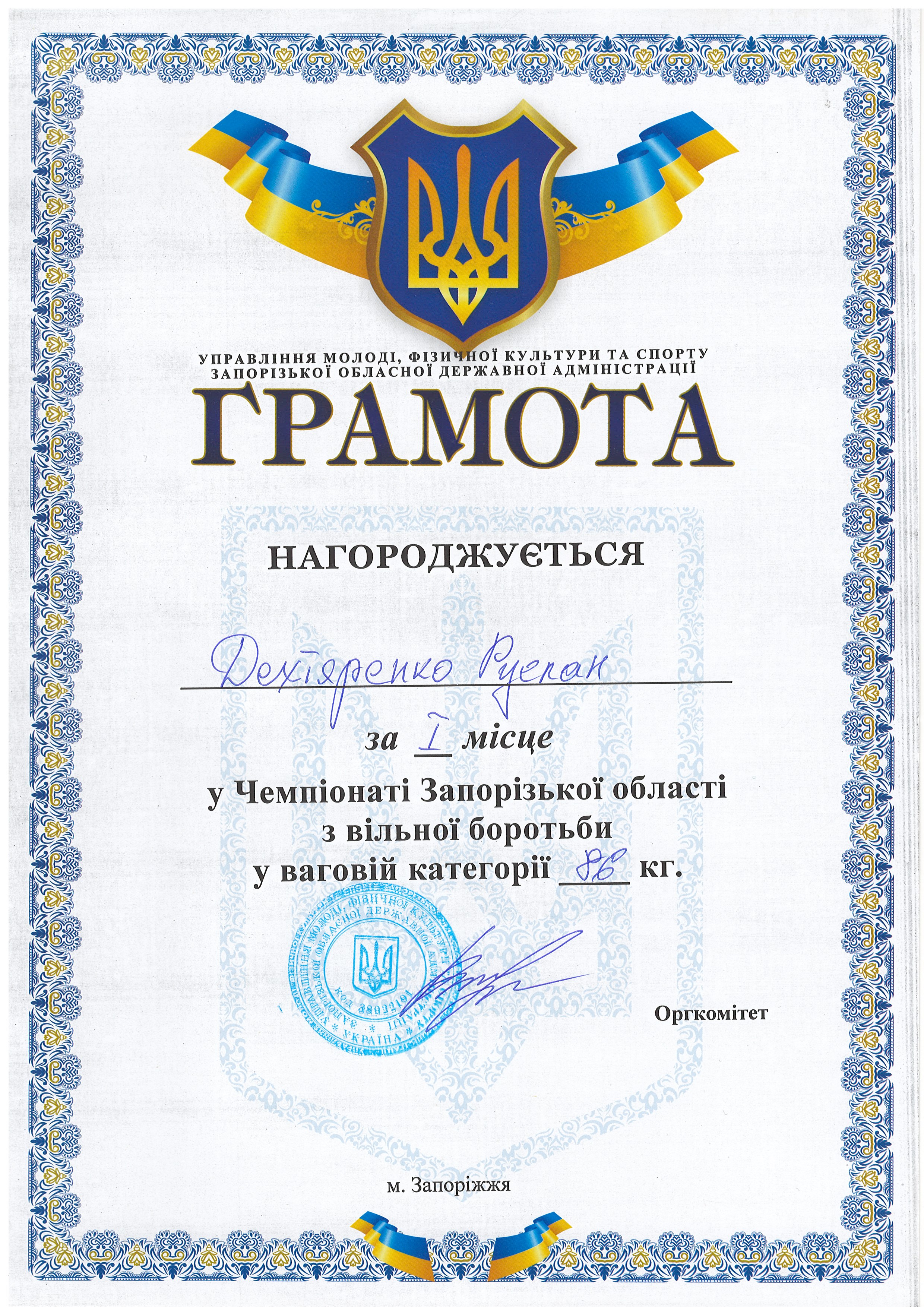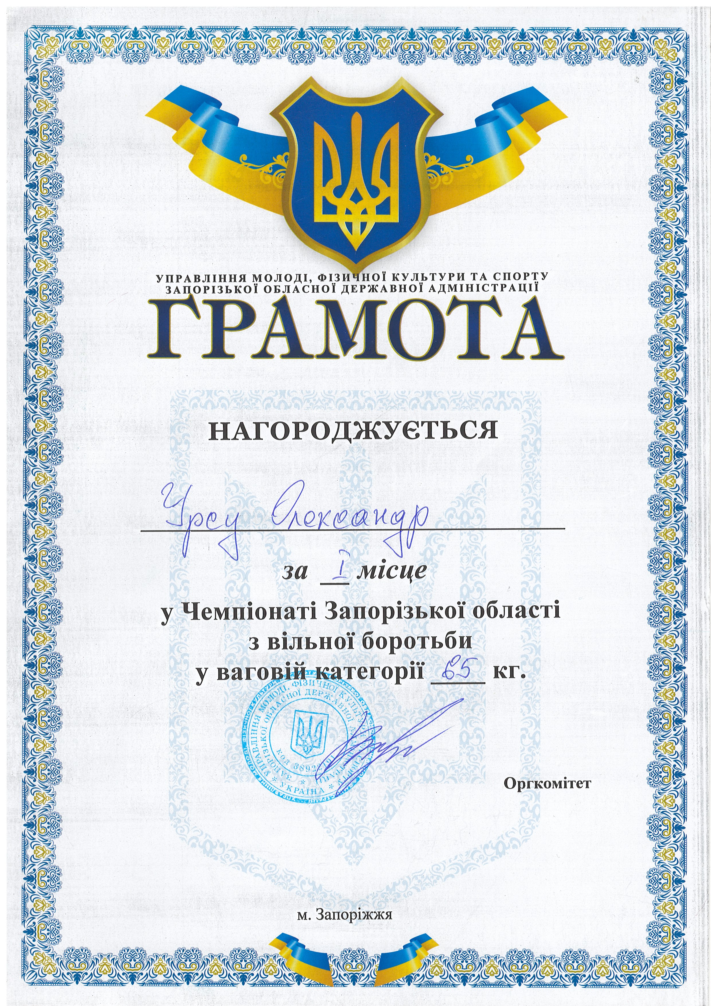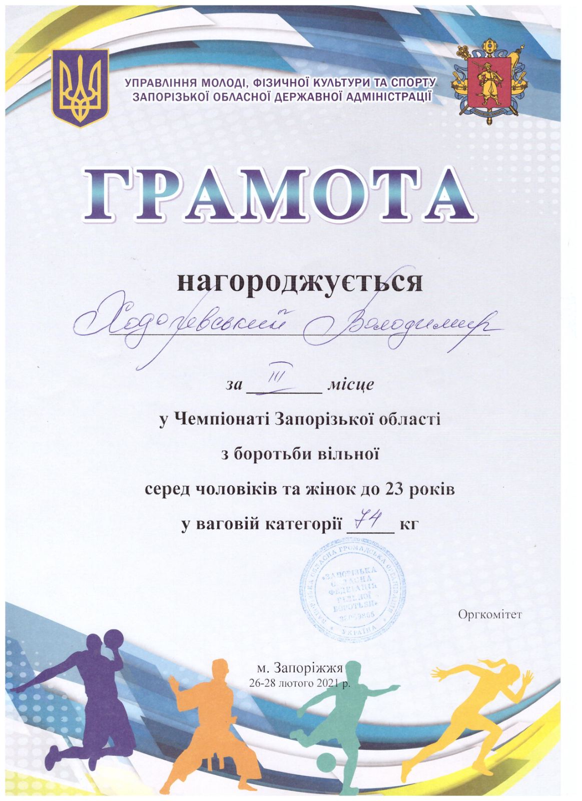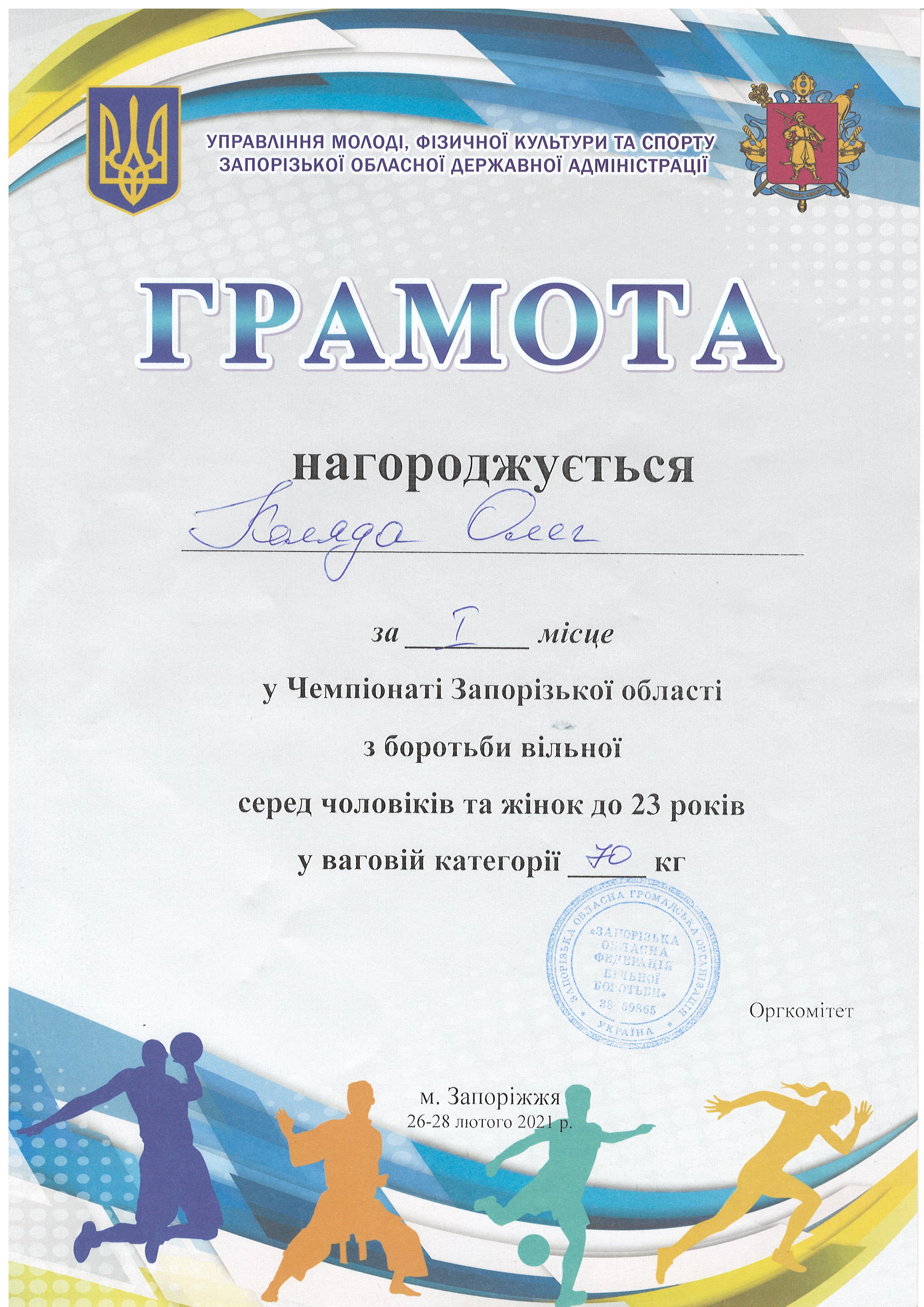 1. Чемпіонат Запорізької з боротьби вільної серед юніорів та юніорок (м. Запоріжжя, 30-31.03.2021 р.): В’юник Герман – 31 АГ (II місце у ваговій категорії до 61 кг) – ГРАМОТА