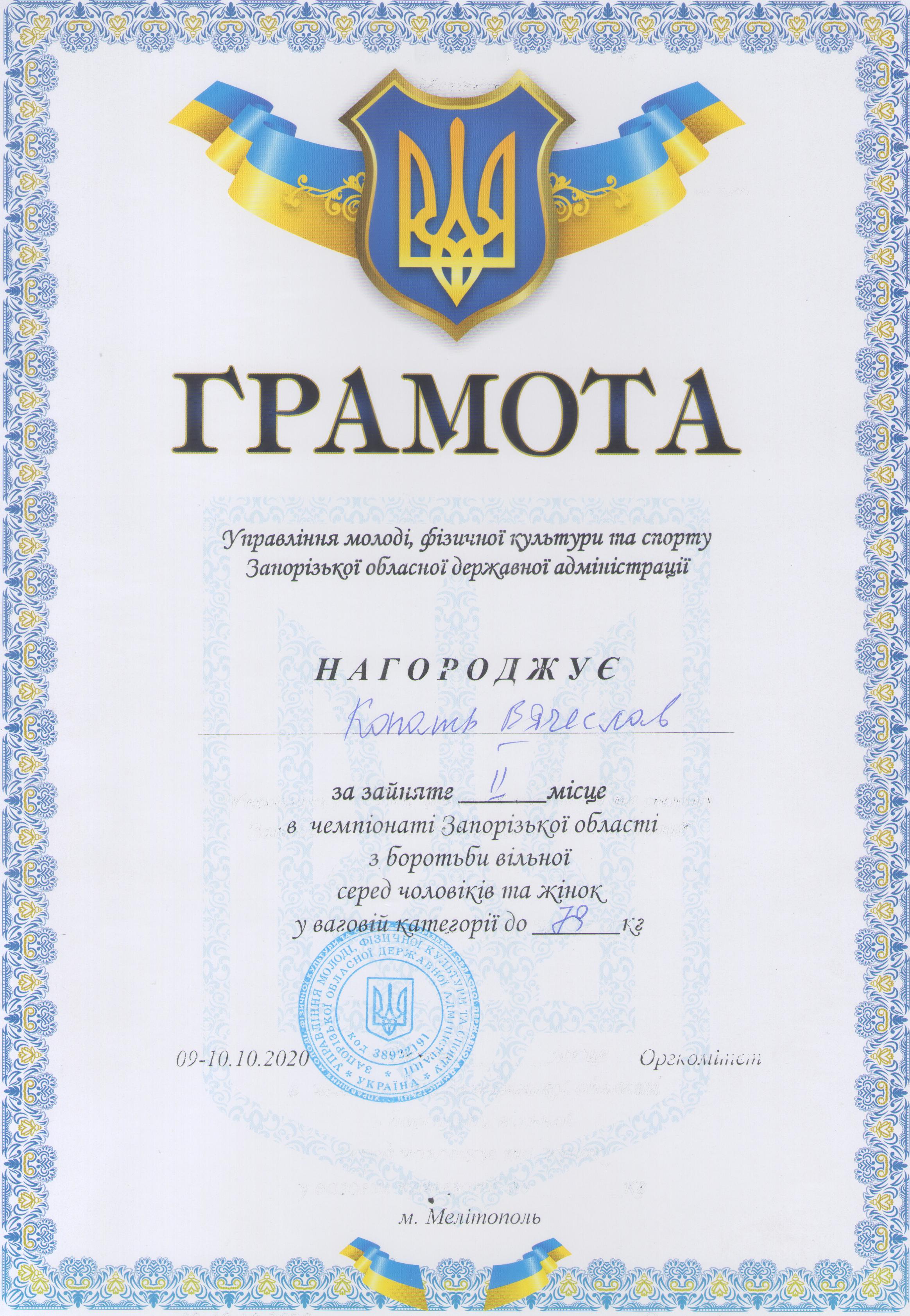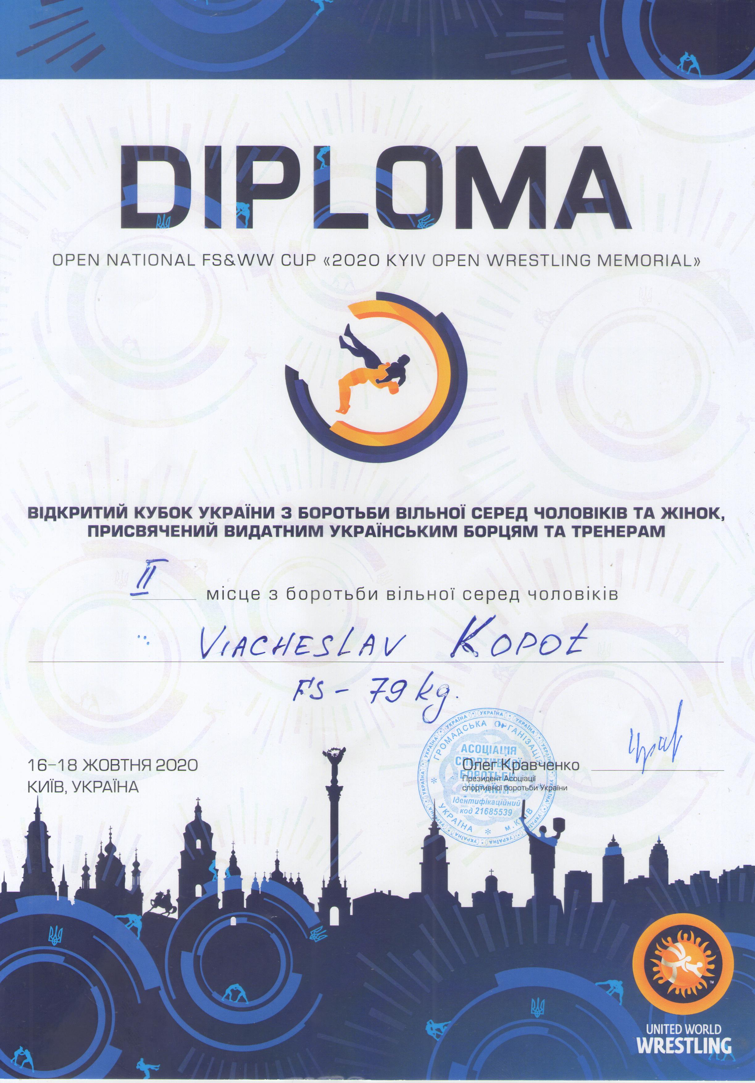2. Відкритий кубок України з вільної боротьби серед чоловіків, присвячений видатним борцям та тренерам (KYIV OPEN WRESTLING CUP) (м. Київ, 15-19.10.2020 р.): Копоть В’ячеслав – 22 СЕЕ (II місце у ваговій категорії до 79 кг) – ГРАМОТА