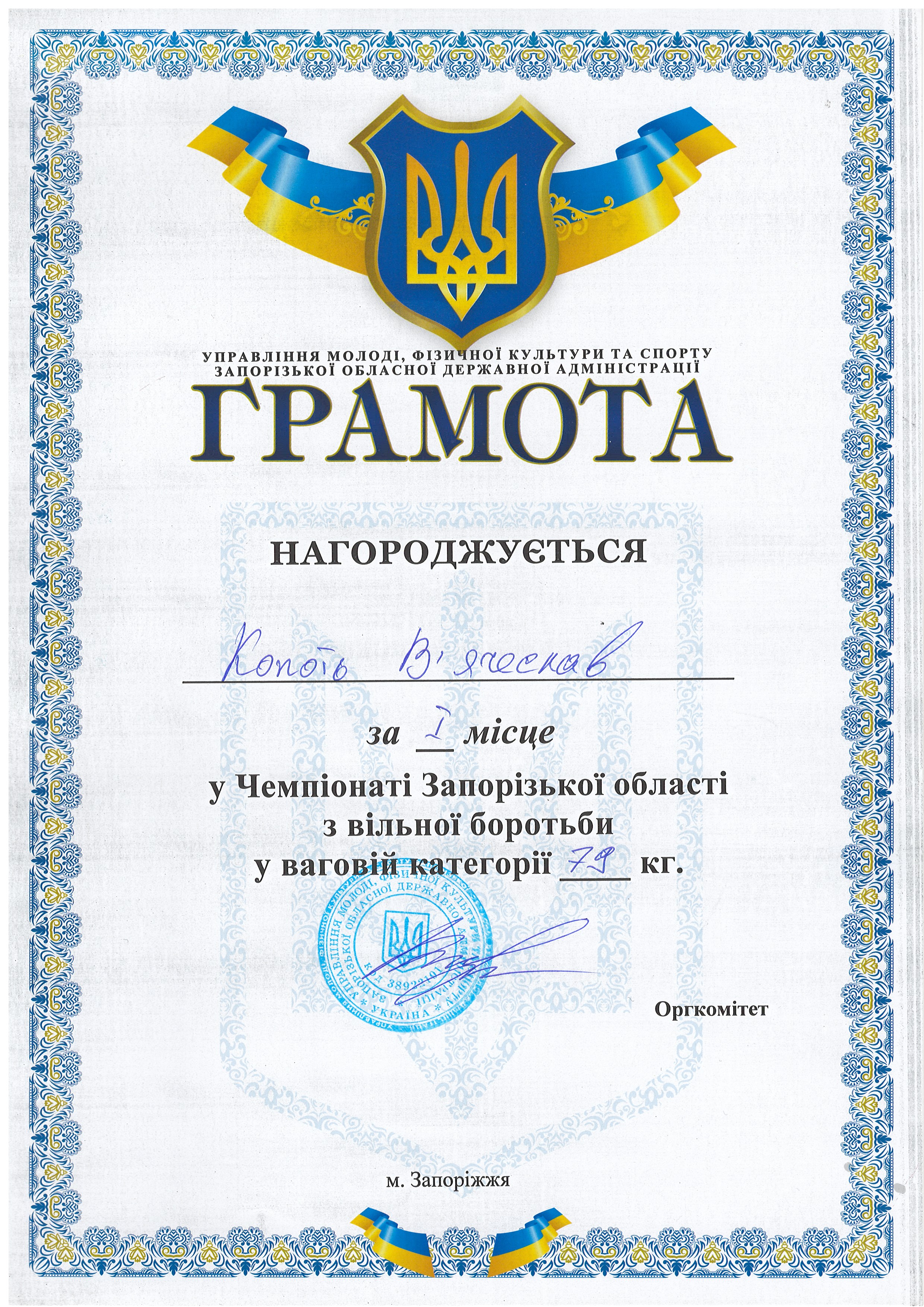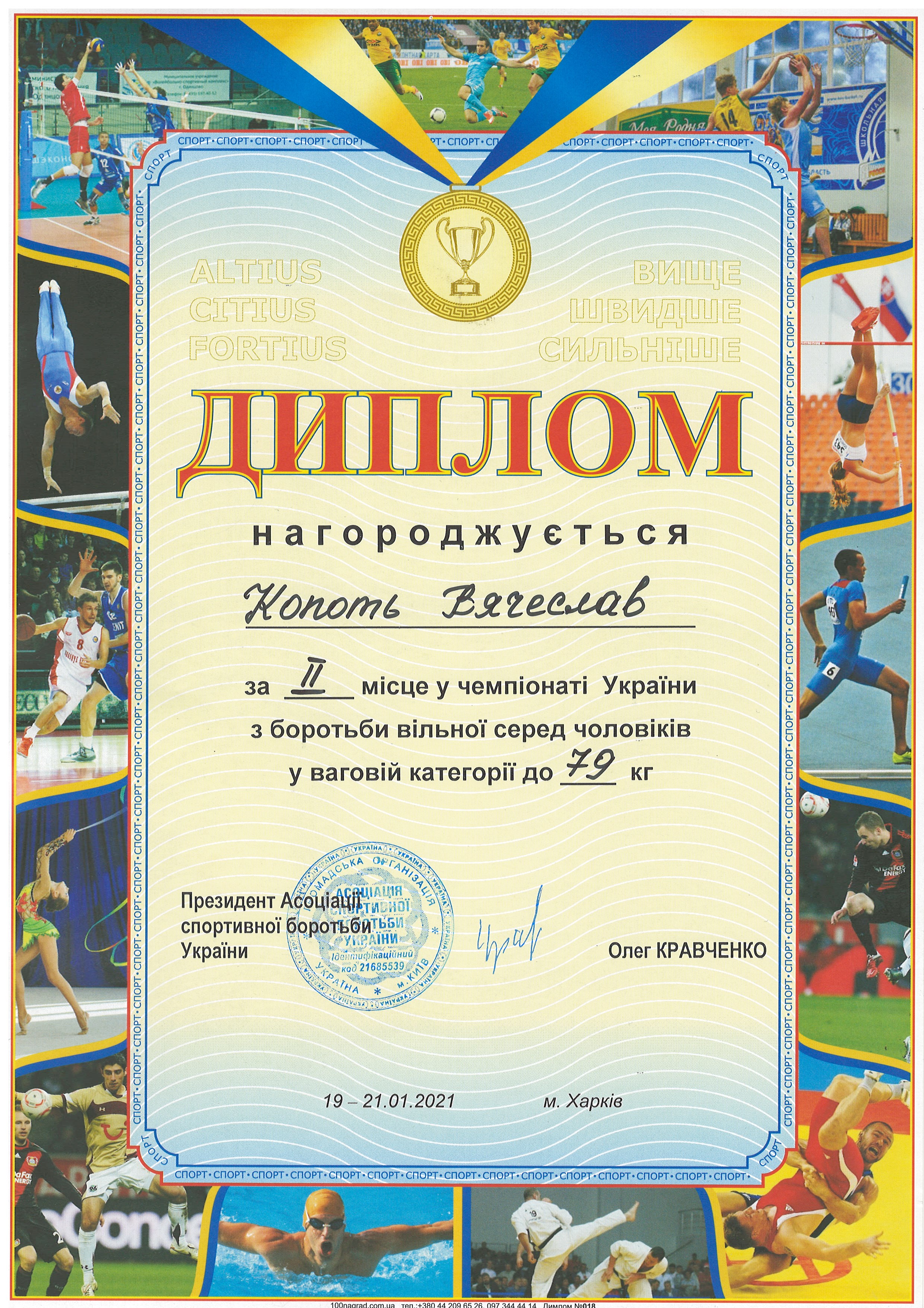 4. Чемпіонат України з вільної боротьби серед чоловіків пам’яті заслуженого тренера України, майстра спорту СРСР Леоніда Дуная (м. Харків, 19-21.01.2021 р.: Копоть В’ячеслав – 22 СЕЕ (II місце у ваговій категорії до 79 кг) – ГРАМОТА