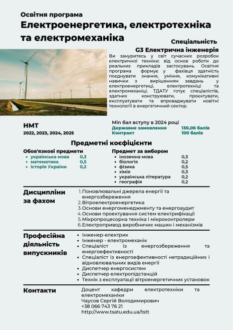 Роль у створенні стійкого майбутнього Зі зростаючим попитом на відновлювану енергію, розумні міста та енергозберігаючі рішення, електроінженери стоять на передовій технологічного прогресу. Я хочу бути серед тих, хто розробляє нові енергосистеми, що зменшують викиди вуглецю та допомагають боротися зі змінами клімату.