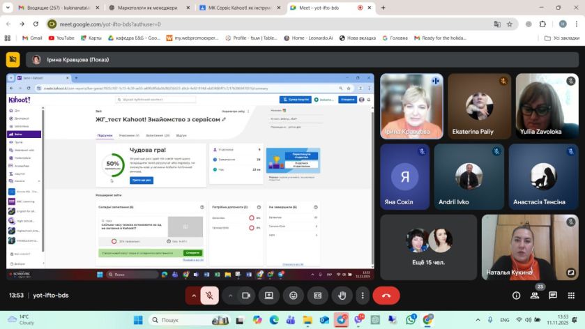 Особливий інтерес викликала покрокова інструкція зі створення власних Kahoot-ігор, яку тепер можна успішно застосовувати в освітній і позааудиторній діяльності. Для здобувачів кафедри маркетингу це стало цінним досвідом, адже елементи гейміфікації вони вже активно використовують під час організації університетських заходів, зустрічей із першокурсниками та профорієнтаційних проєктів.