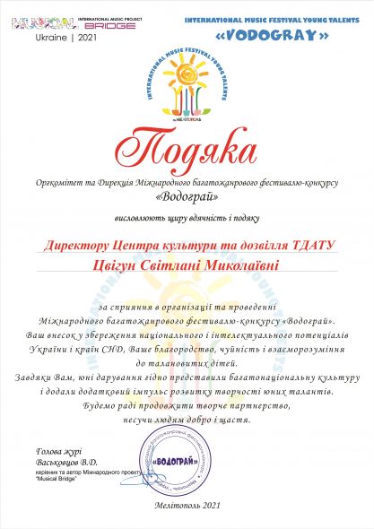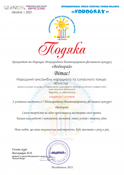 I Міжнародний дистанційний фестиваль-конкурс «Водограй» був організований випускниками Мелітопольського училища культури: Валерієм Васьковцовим, Олександром Кагановичем та Ольгою Чугай на початку 2021 року. Керівникам танцювального ансамблю «Юність» Ірині Лук’яненко та Вероніці Почерніній прийшло запрошення до участі у конкурсі.
