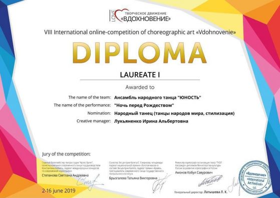 І ось довгоочікуваний фінал! За результатами VIIІ Міжнародного онлайн – конкурсу хореографічних колективів «Натхнення» – «Вдохновение», ансамбль “Юність” став переможцем у номінації – народний танок (танці народів світу) і отримав диплом “Лауреата 1 премії “